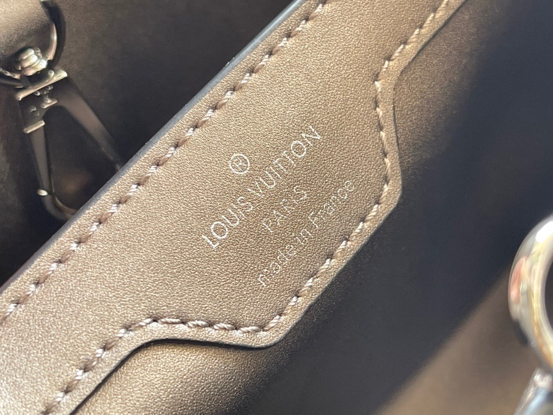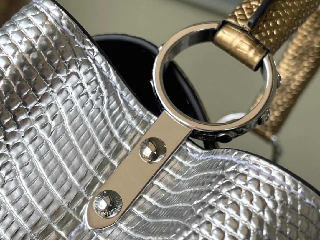Top original single M48865 Gold and Silver Lizard Small Capucines Handbag exquisitely blends graceful lizard skin outer layer, fine sheep leather lining and lustrous metal parts, and the iconic flip achieves two styles of fashion: inside to read the logo, and outside to bloom Monogram flowers, to light up the eye-catching corner for evening occasions. Size:27x18x9cm