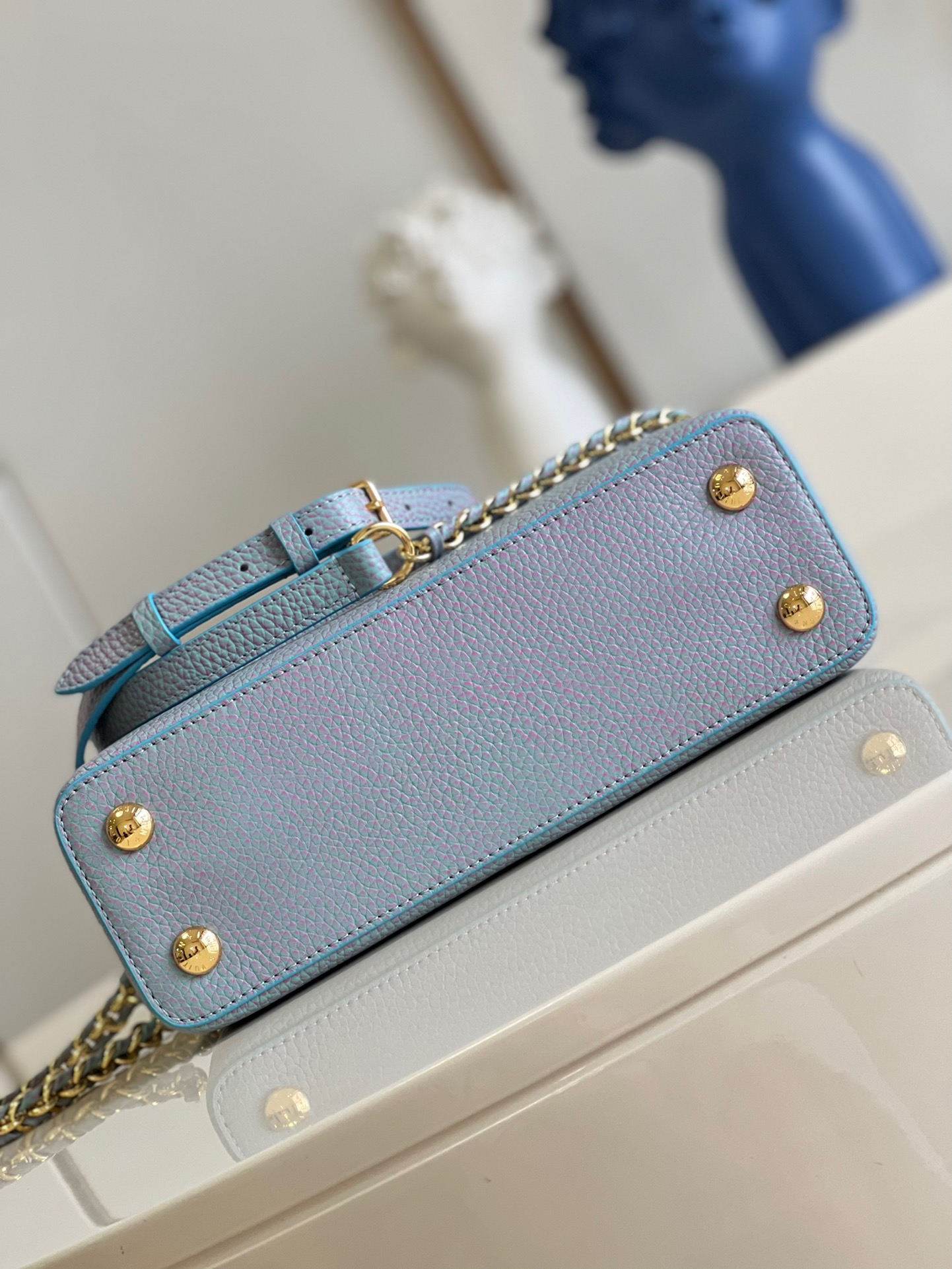 M59868 Stardust Pearl Blue SmallThis Capucines BB handbag shows the color change of Taurillon leather under different light. The letters shimmer like shells, and the single handle and detachable braided leather chain offer a variety of carrying options. Dimensions: 27 x 18 x 9cm