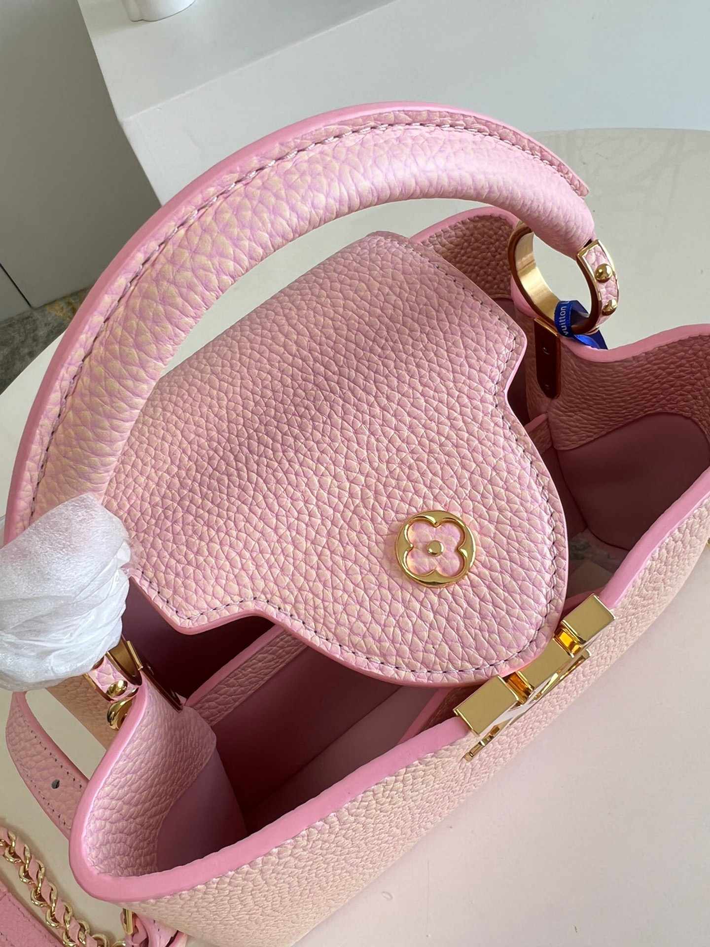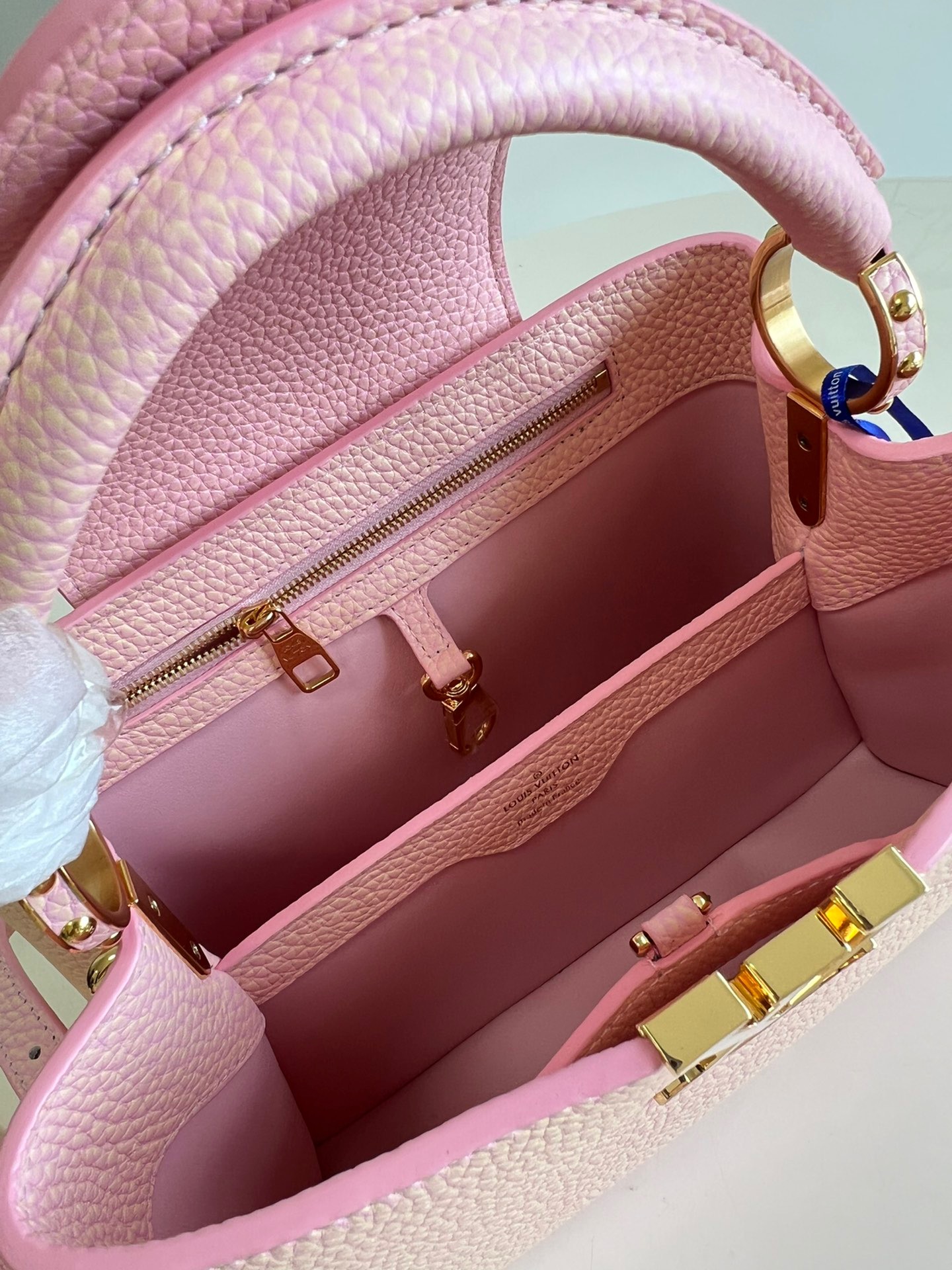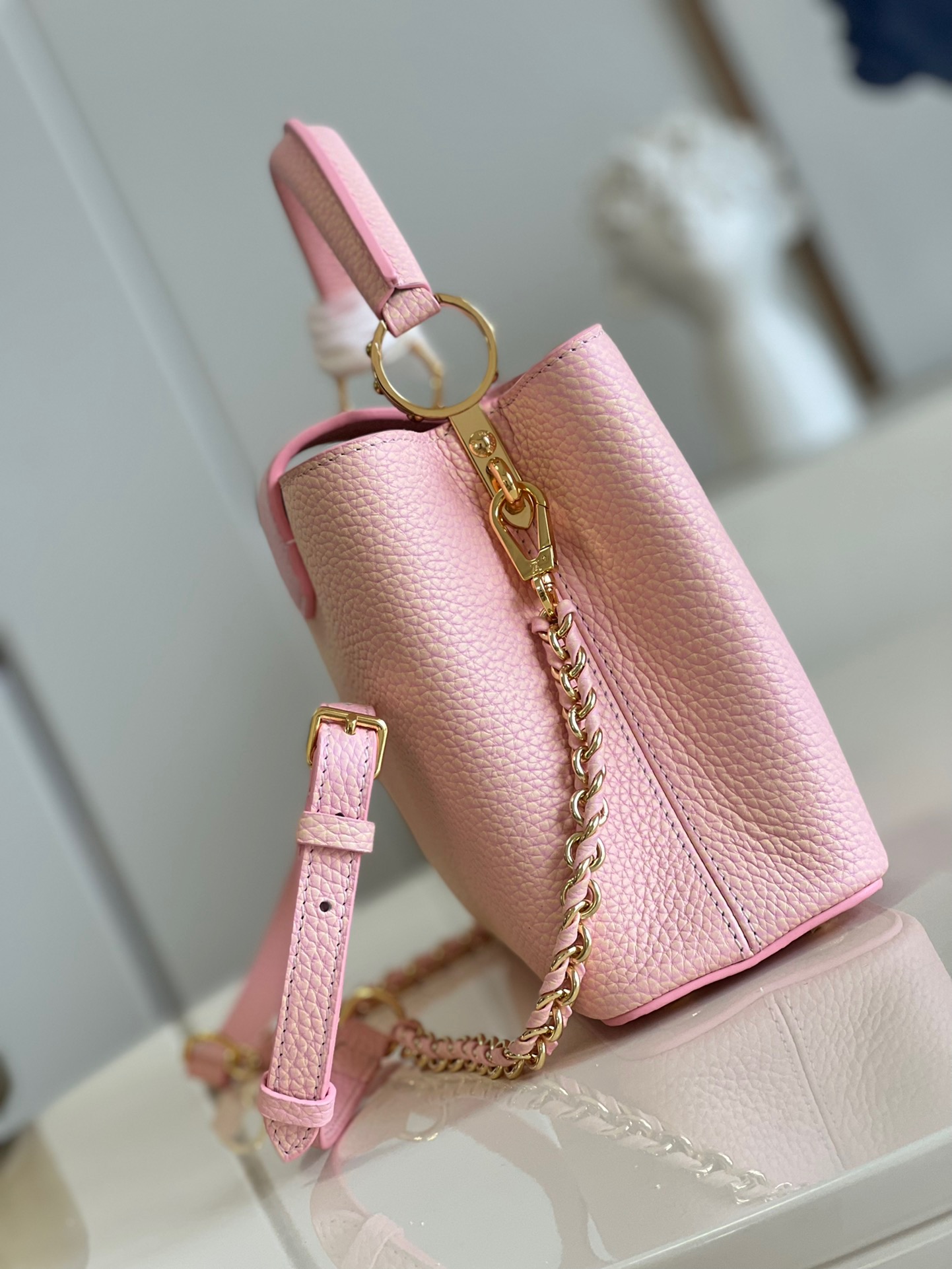 M59868 Stardust Pearl Powder SmallThis Capucines BB handbag shows the color change of Taurillon leather under different light. The letters shimmer like shells, and the single handle and detachable braided leather chain offer a variety of carrying options. Dimensions: 27 x 18 x 9cm
