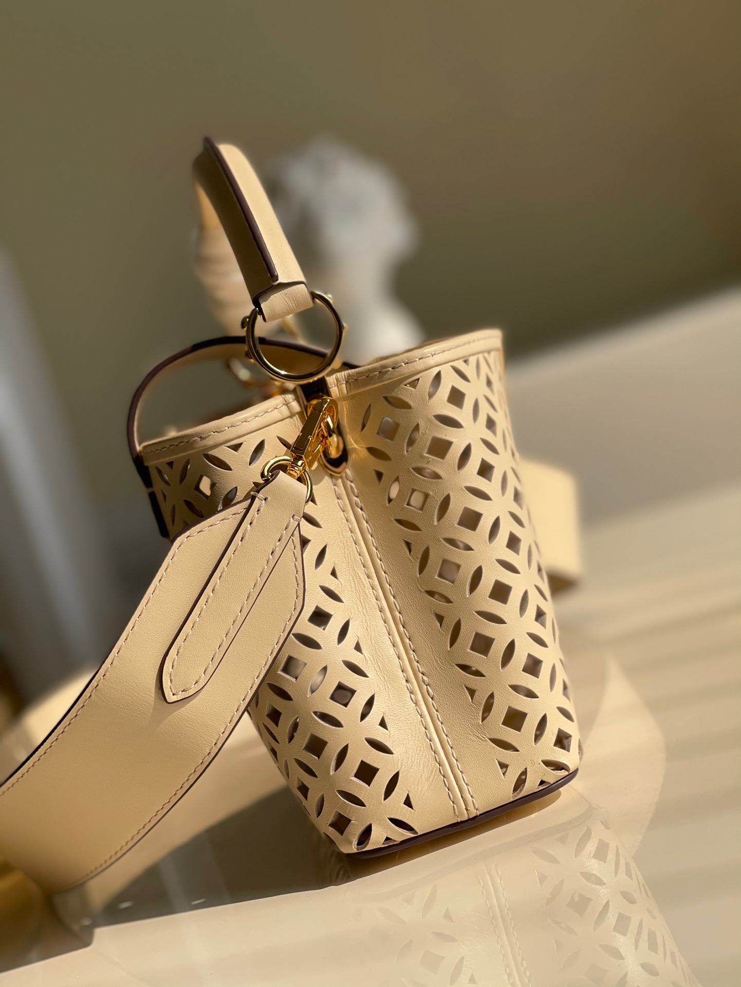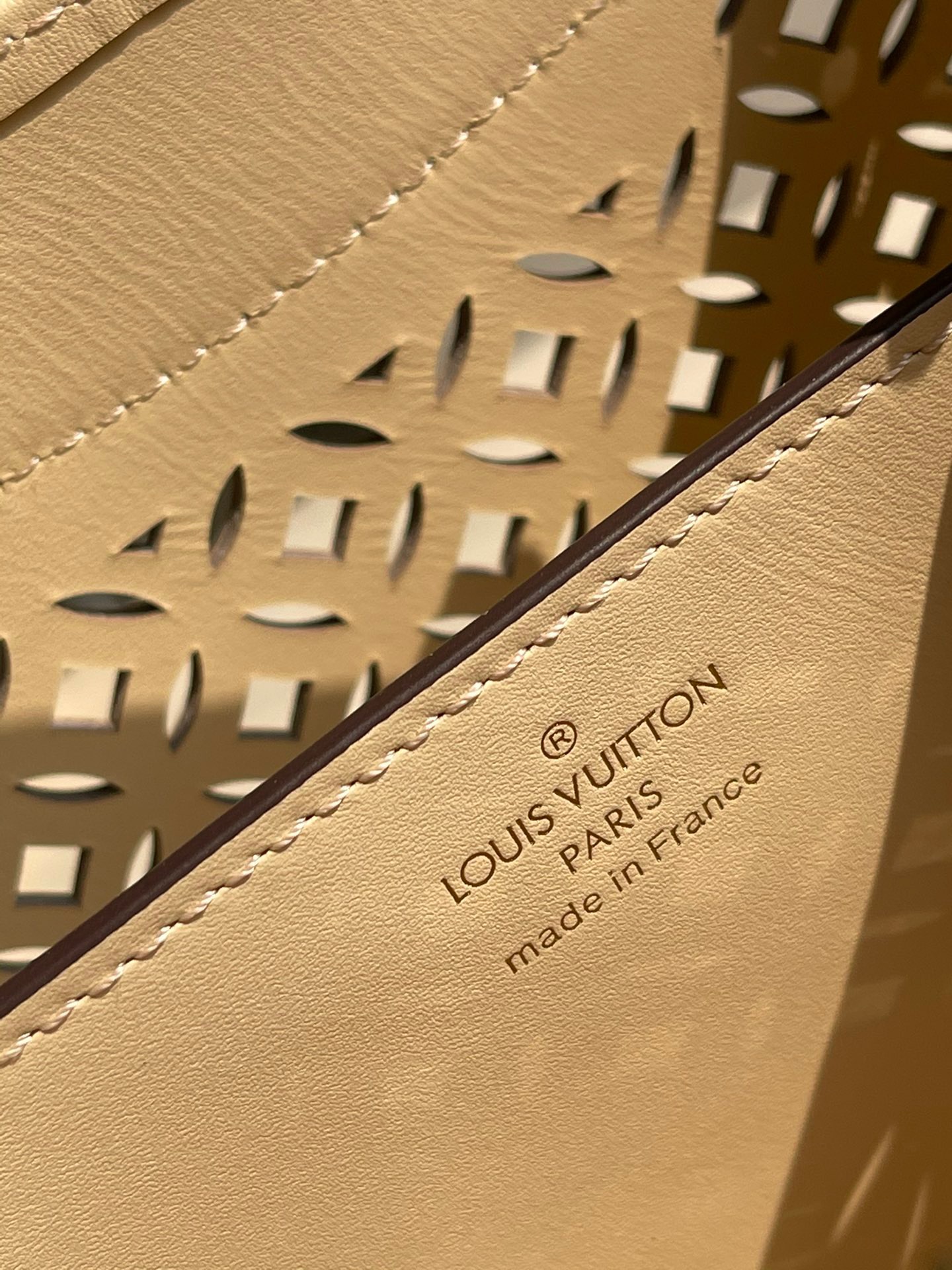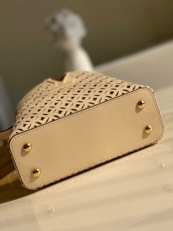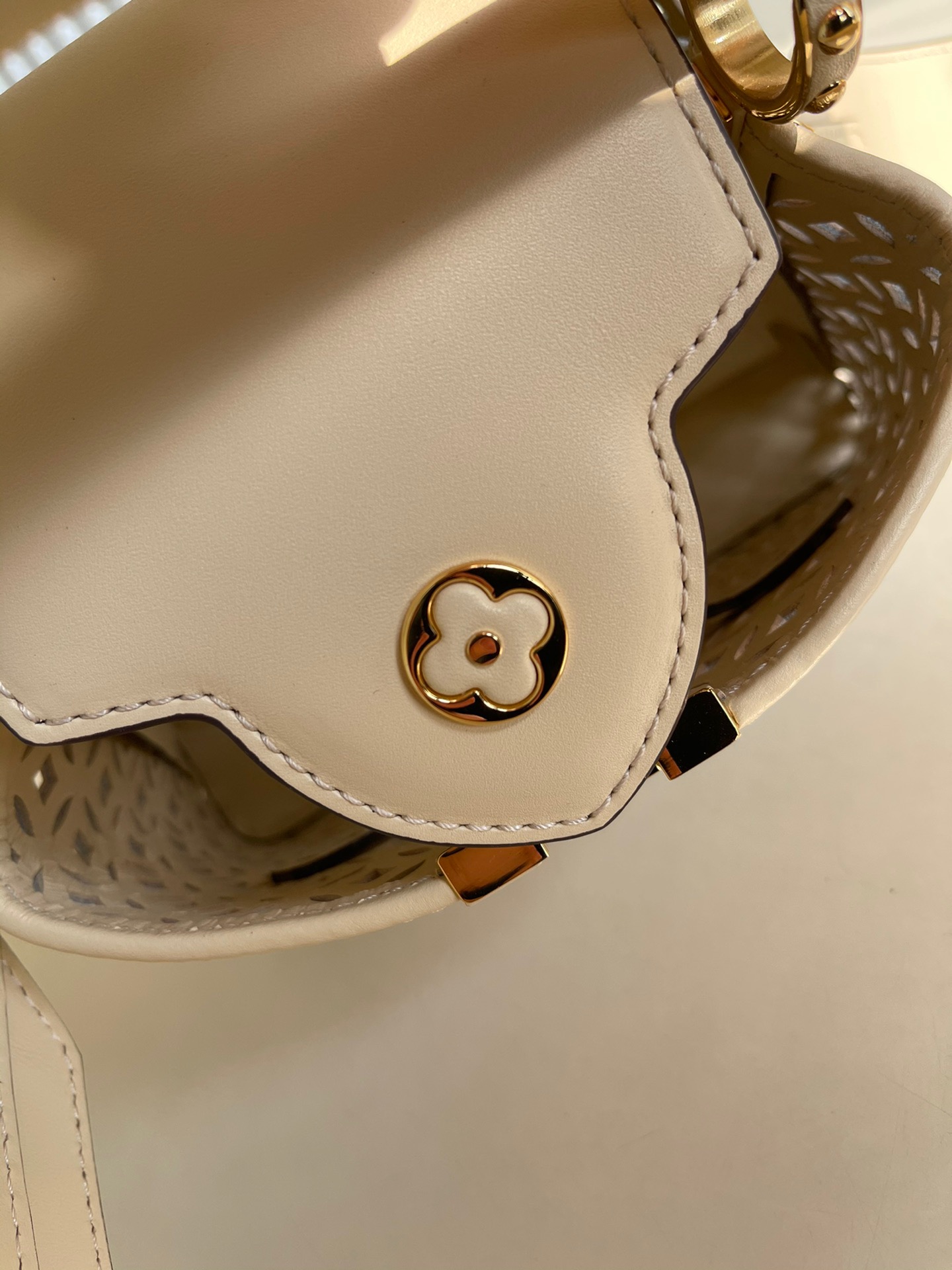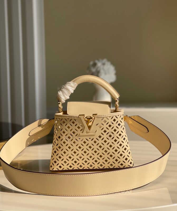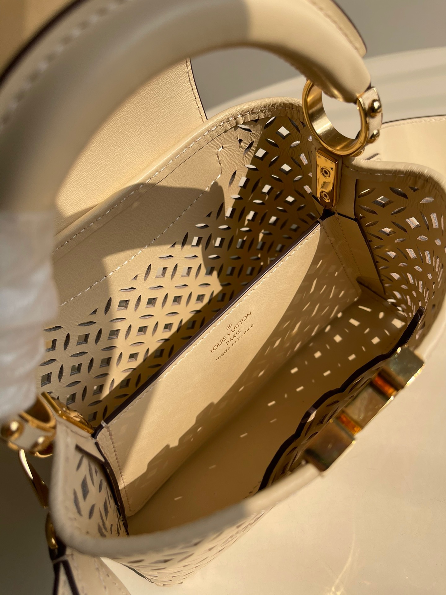 M48865 New Mini White Cutout This Capucines Mini Handbag is made of exquisite cutout calfskin showing the cutout pattern from the classic Monogram flower and Louis Vuitton store decoration. It looks like a summer mini woven basket. From this Name Garden Party. This Capucines BB handbag shows elegance and luxury.Size: 21*14*8cm