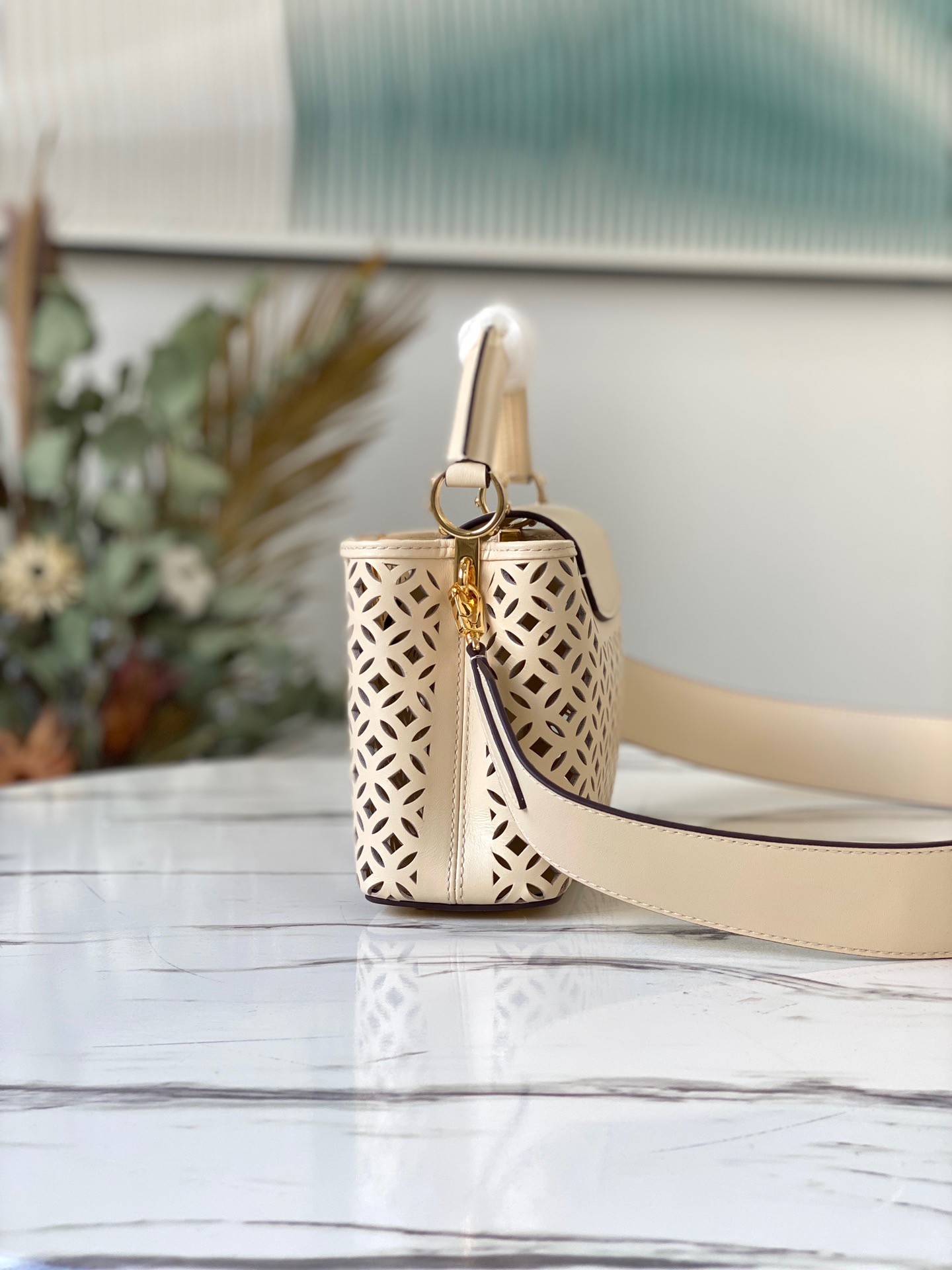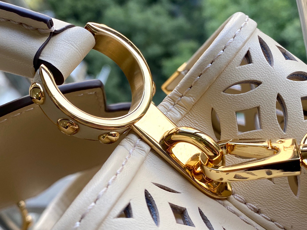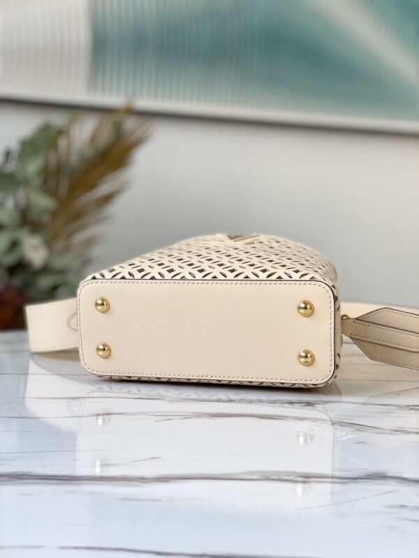 This Capucines Mini Handbag is made of exquisite openwork calfskin, showing the openwork pattern derived from the classic Monogram flowers and store decoration, like a summer mini woven basket, hence the name Garden Party. Dimensions: 21 x 14 x 8 cm