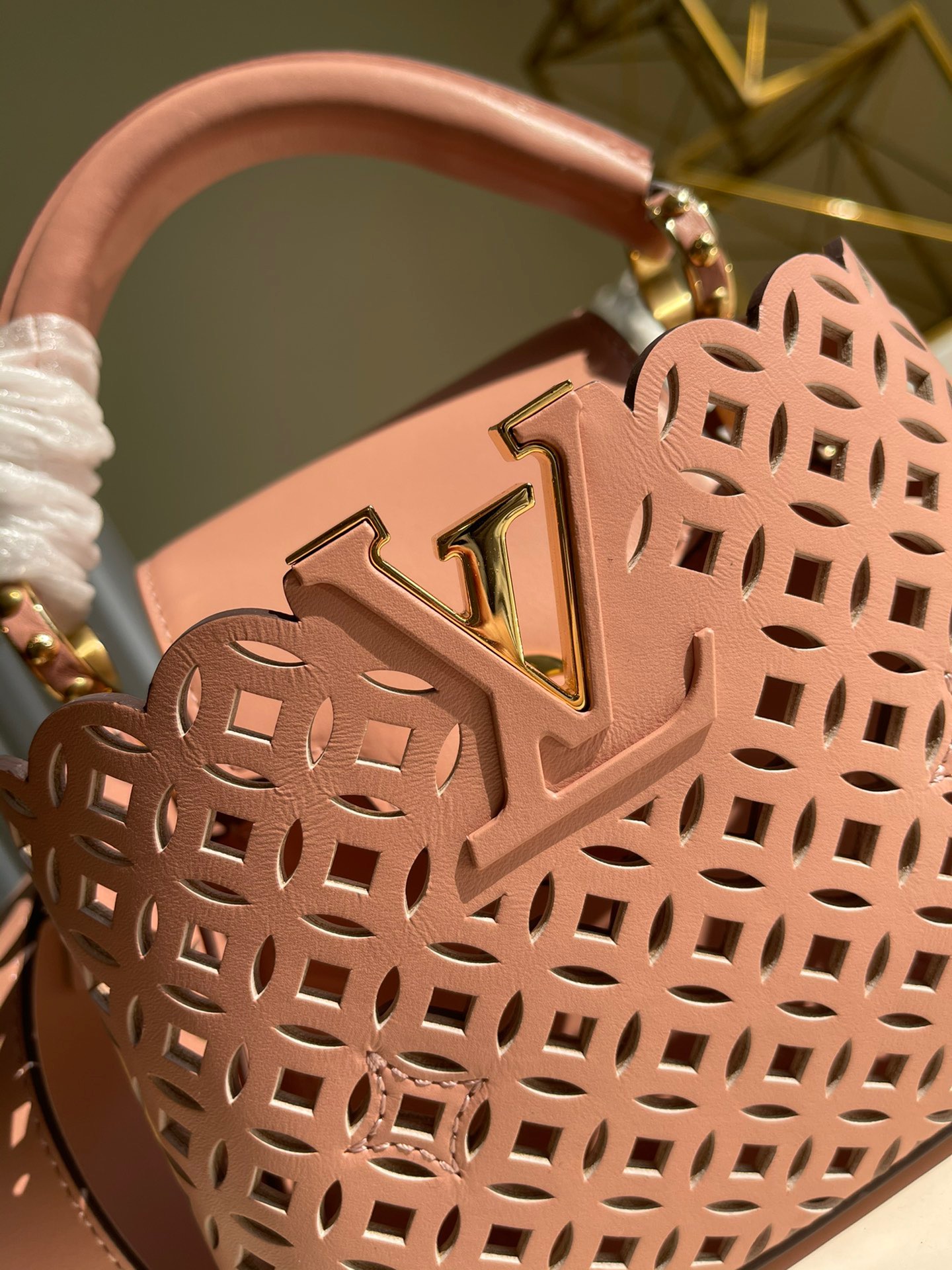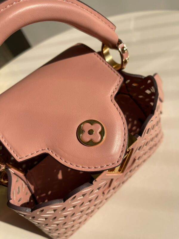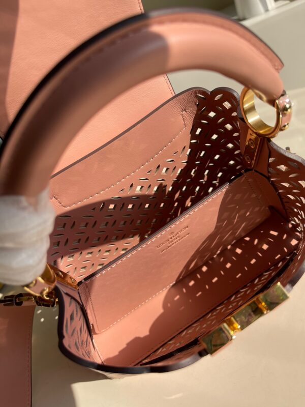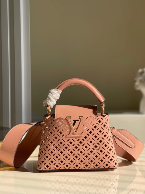 M48865 New Mini White Cutout This Capucines mini handbag is made of exquisite cutout calfskin showing the cutout pattern from the classic Monogram flower and Louis Vuitton store decoration. It looks like a summer mini woven basket. From this Name Garden Party. This Capucines BB handbag shows elegance and luxury.Size: 21*14*8cm