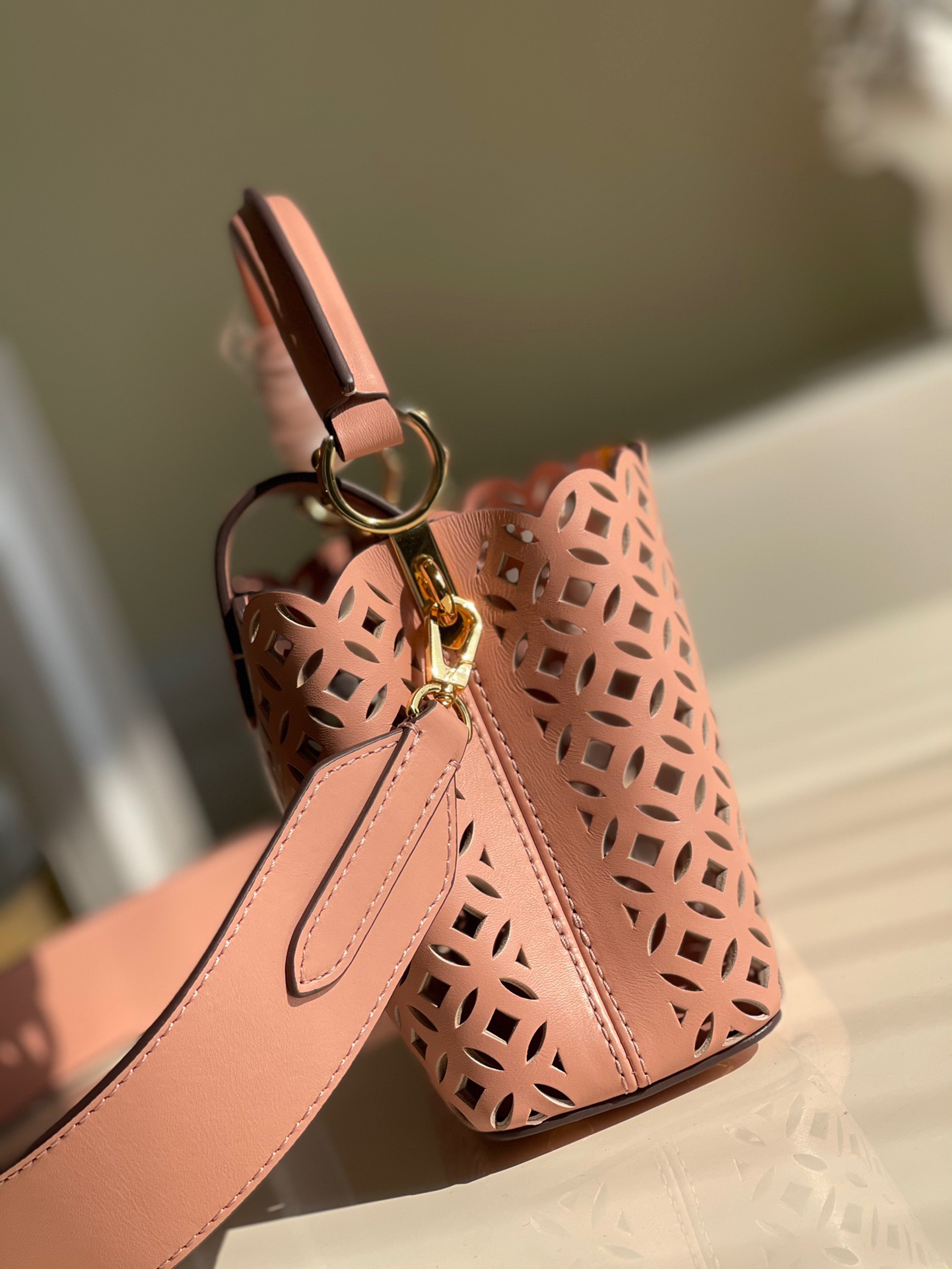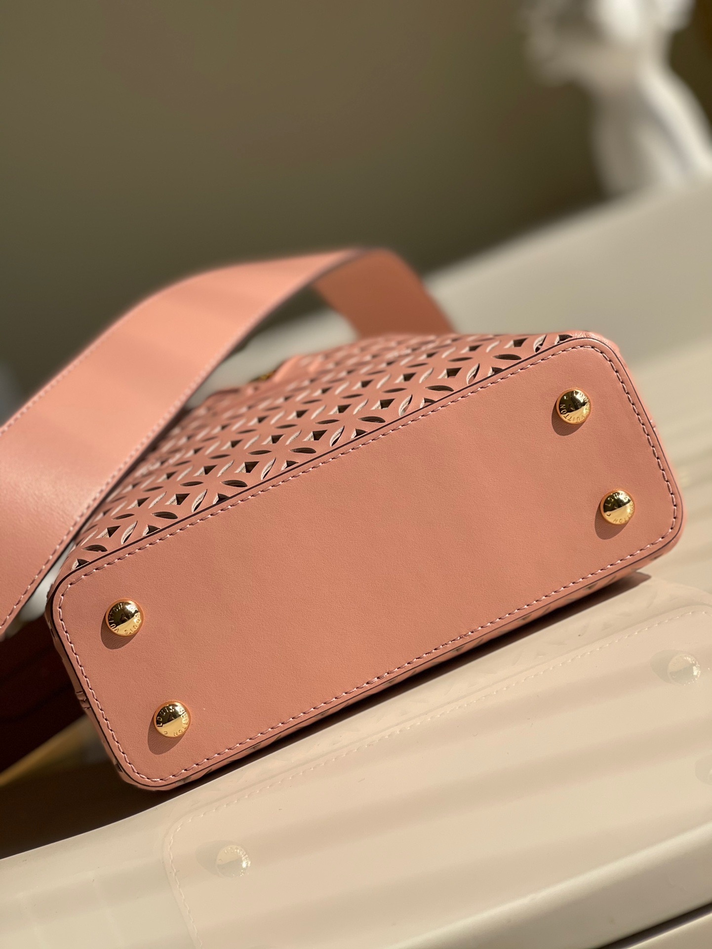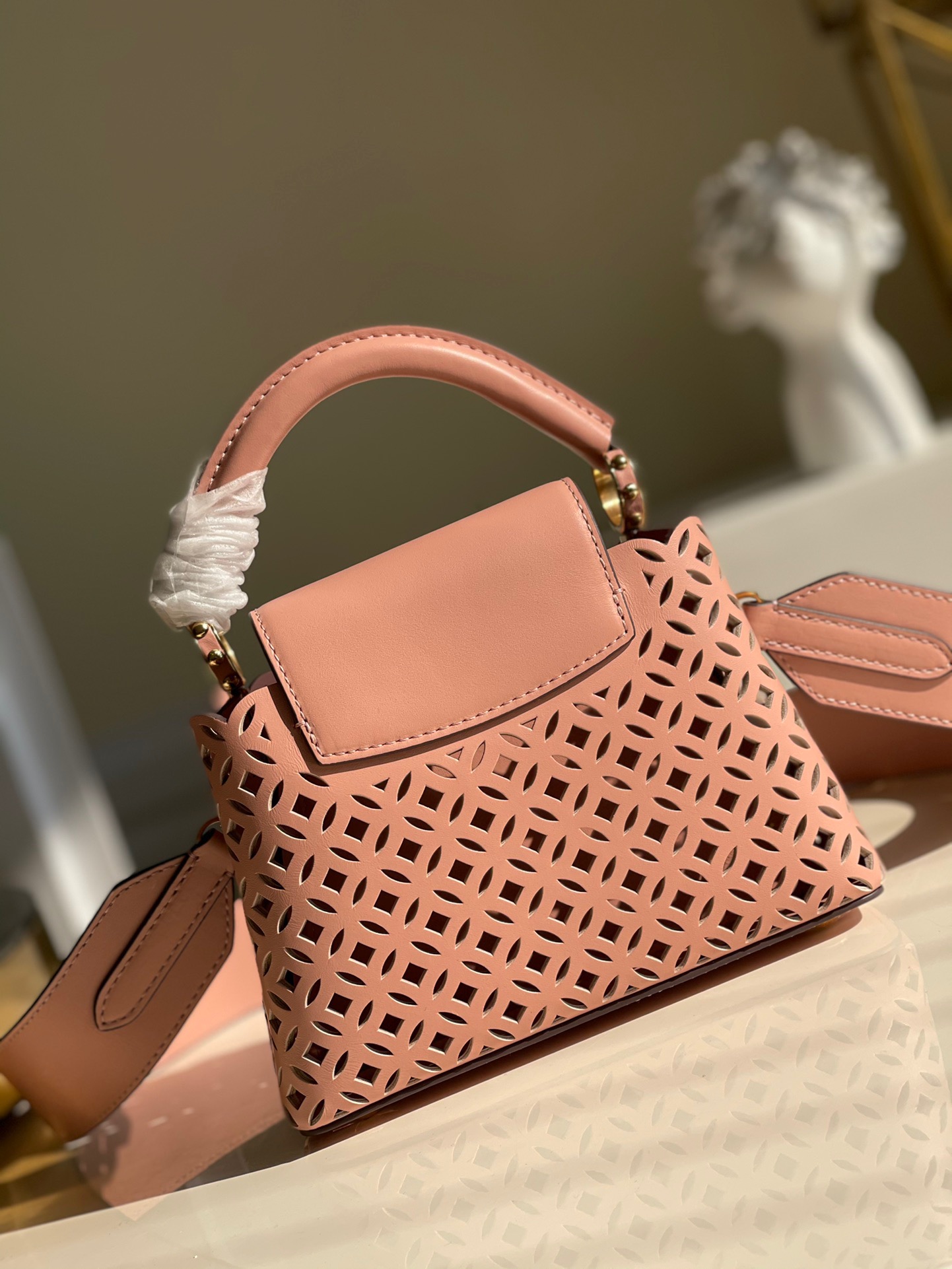M48865 New Mini White Cutout This Capucines mini handbag is made of exquisite cutout calfskin showing the cutout pattern from the classic Monogram flower and Louis Vuitton store decoration. It looks like a summer mini woven basket. From this Name Garden Party. This Capucines BB handbag shows elegance and luxury.Size: 21*14*8cm