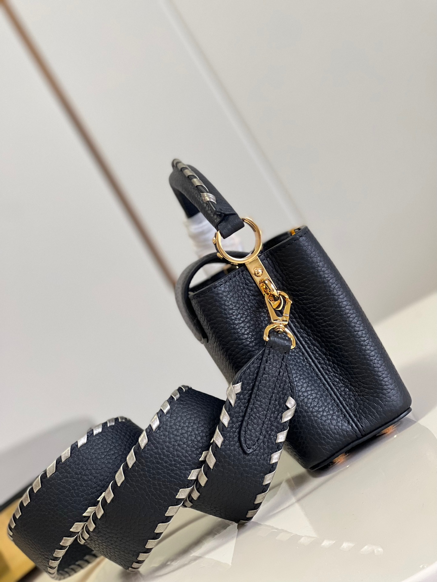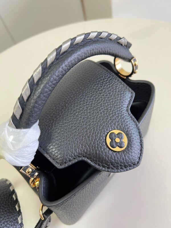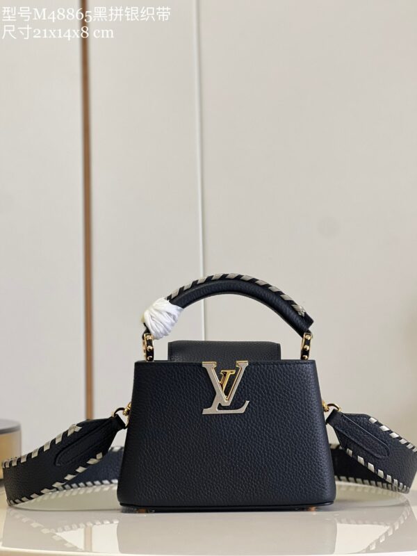 Louis Vuitton Capucines Mini Handbag Metal Monogram flowers are polished and glazed by hand, connected in series with delicate chains. Use the detachable and adjustable slim shoulder strap to explore more ways to carry it. Model: M48865 Black with Silver Webbing Mini Dimensions 21cm x 14cm x 8cm