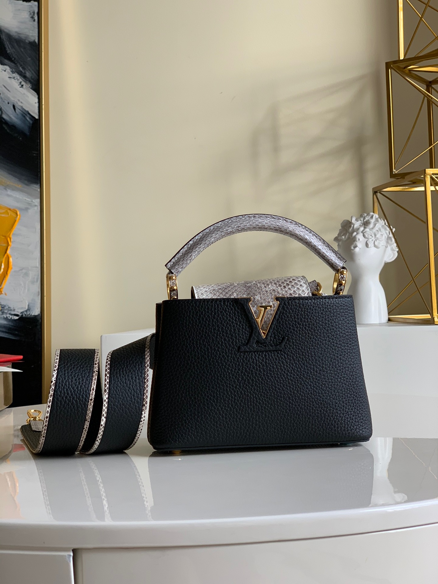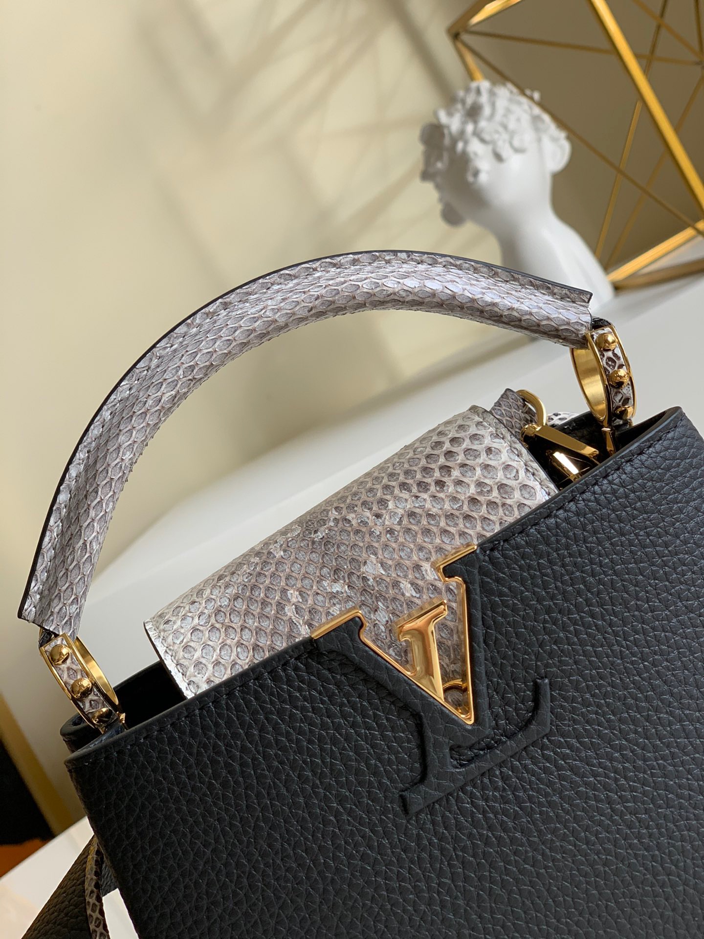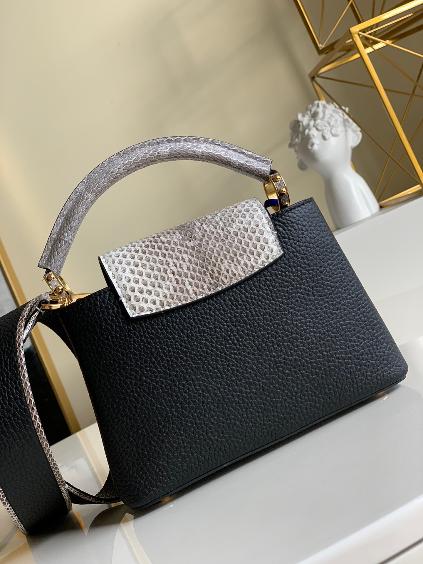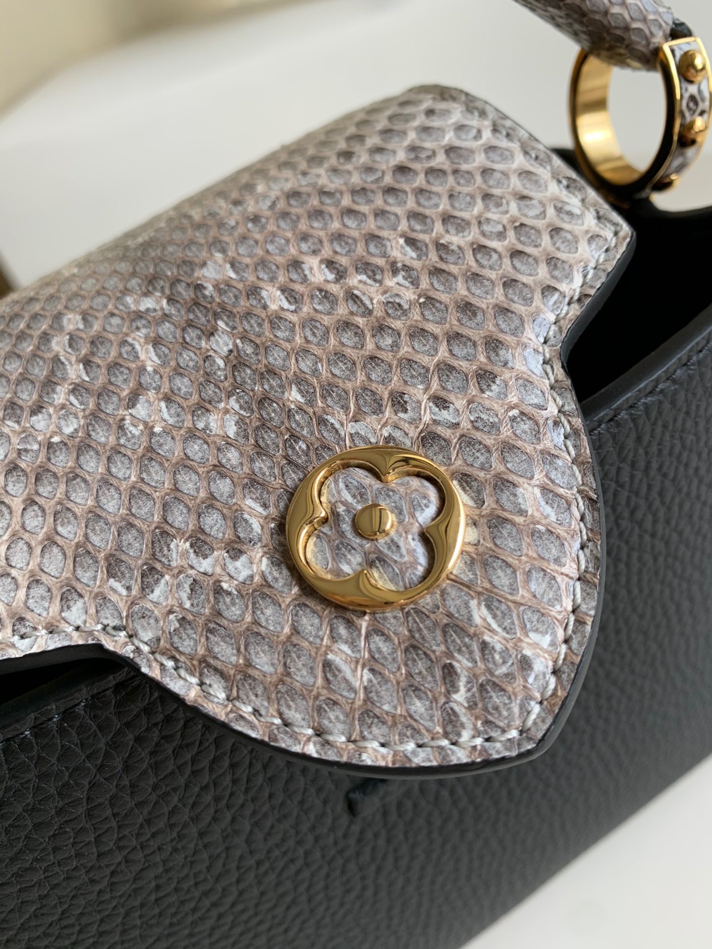 M95509 Water Snake Leather Capucines Mini Handbag Imported French calfskin. Shiny metal accessories. Unique Capucines cover can be placed inside the bag to display the letter logo, and can be turned out to display the Monogram Flower pattern.Size: 21x14x8cm