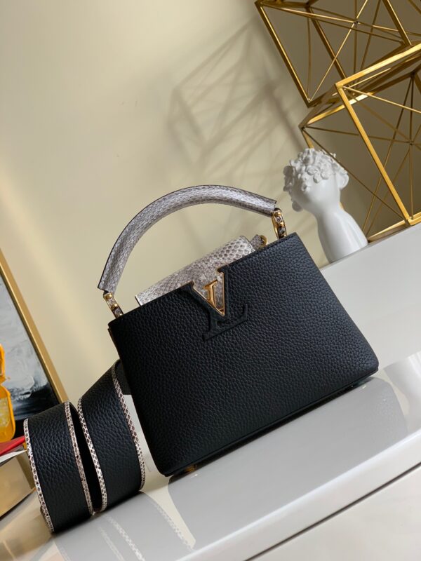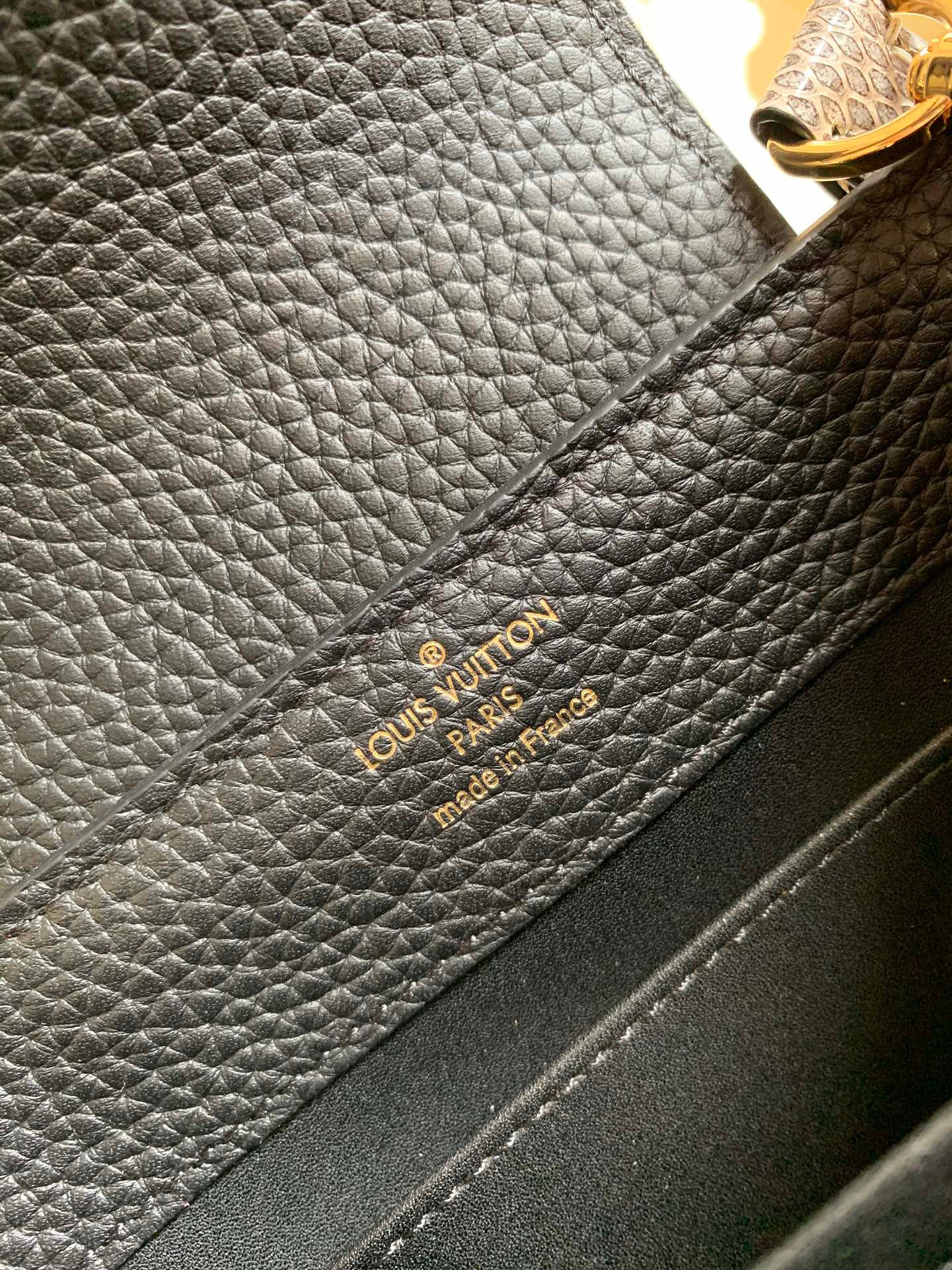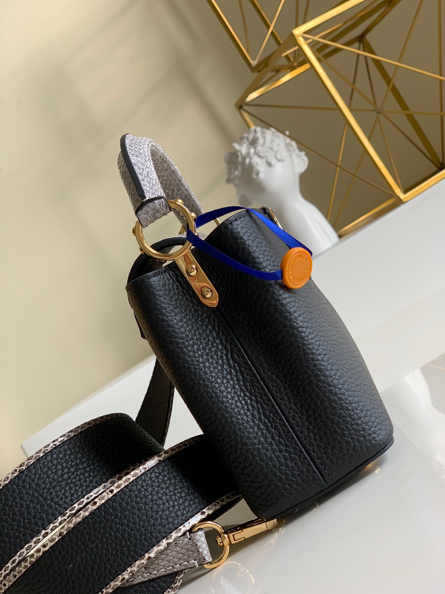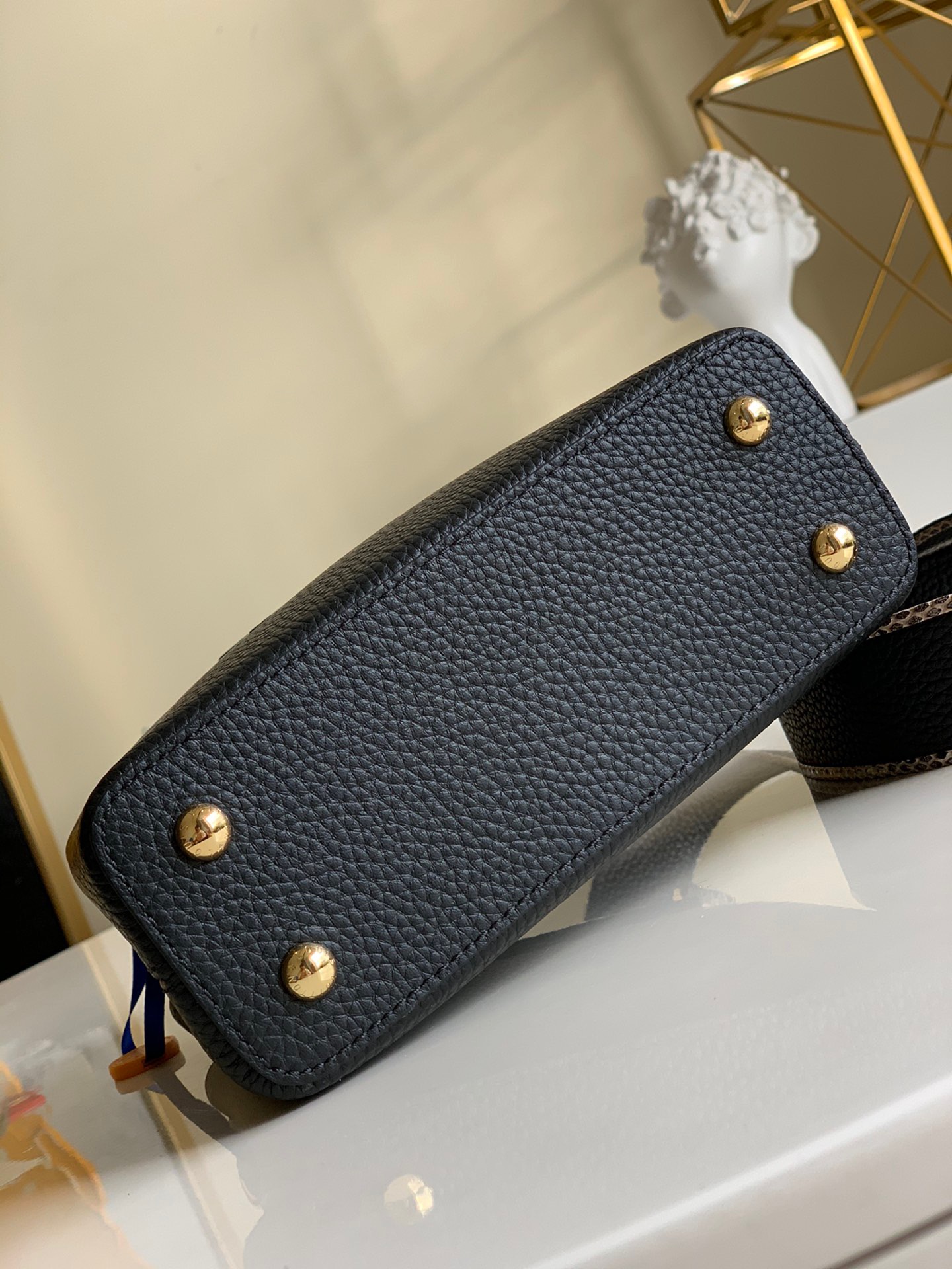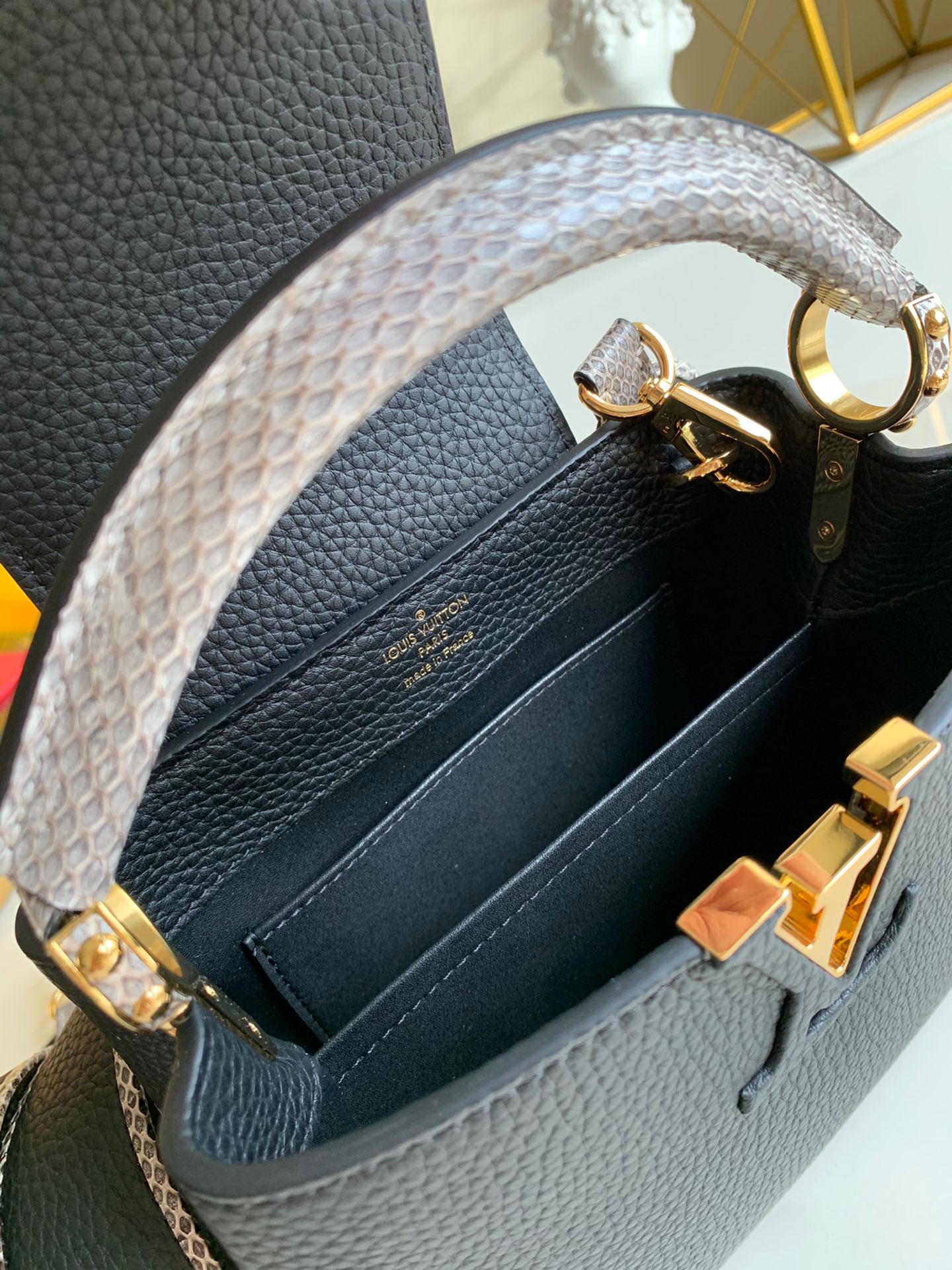 M95509 Water Snake Leather Capucines Mini Handbag Imported French calfskin. Shiny metal accessories. Unique Capucines cover can be placed inside the bag to display the letter logo, and can be turned out to display the Monogram Flower pattern.Size: 21x14x8cm