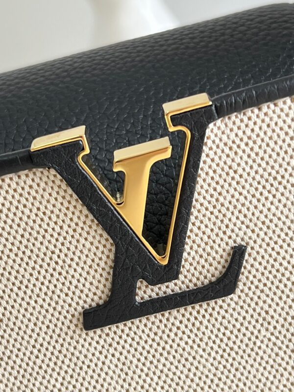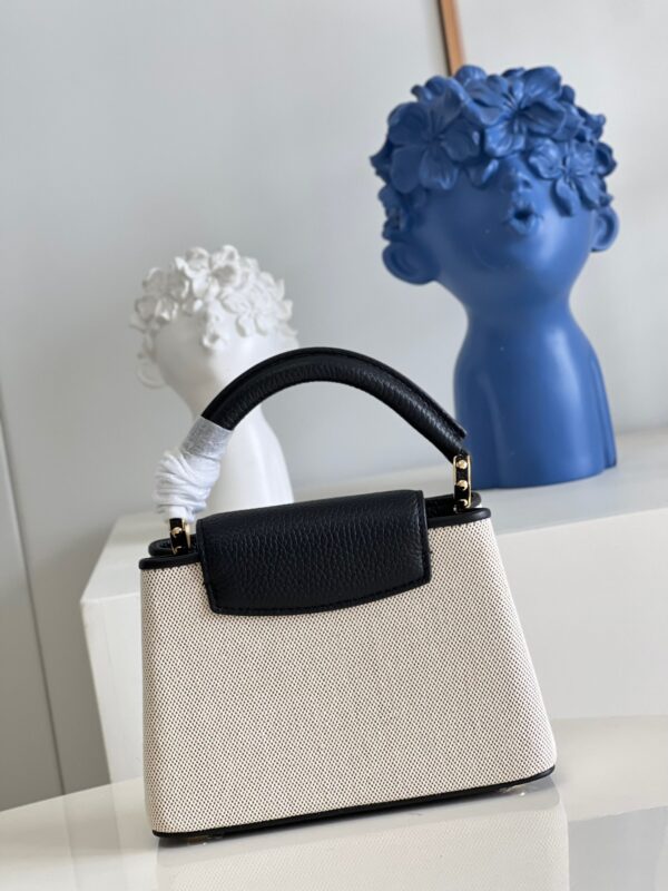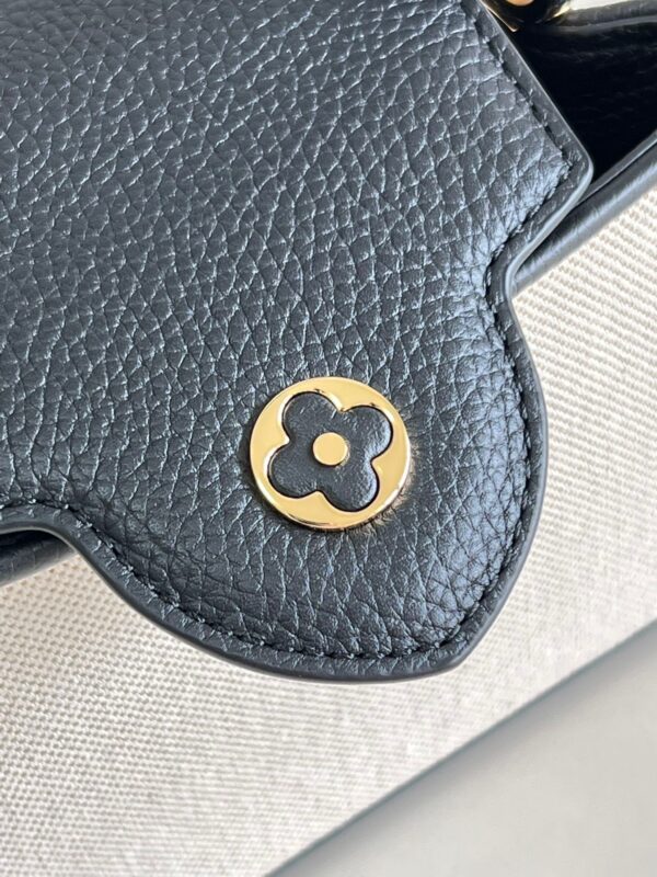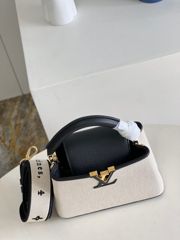 M48865 Black Canvas Embroidery Mini Capucines Mini Handbag Imported French calfskin. Shiny metal accessories. The unique Capucines cover can be placed inside the bag to display the letter logo, and can be turned out to present the Monogram Flower pattern.Size: 21x14x8cm