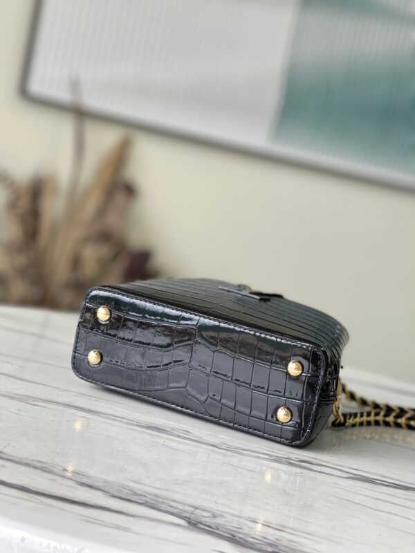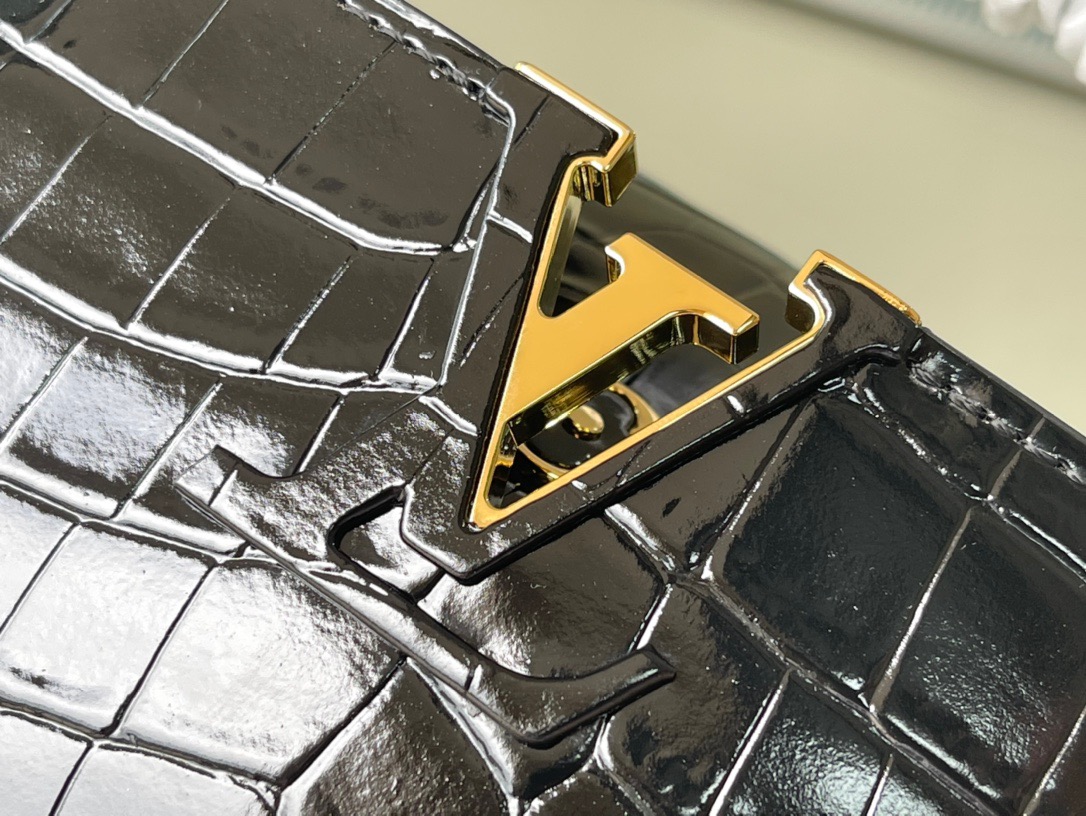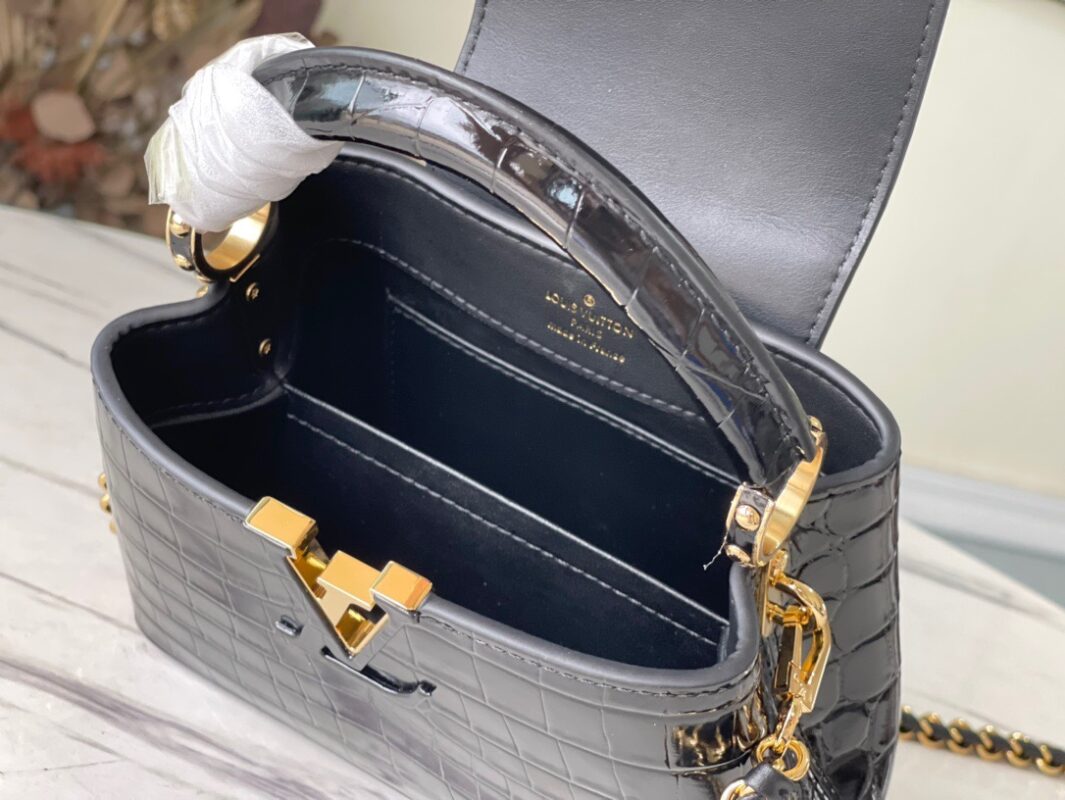 M48865 Black Crocodile Chain Item Mini Capucines BB Handbag with rare leather to declare the modern atmosphere. The crocodile leather braided chain can be removed at will, so that the shoulder and crossbody can be switched freely. The flip cover can display classic letters. Size: 21х14х8cm
