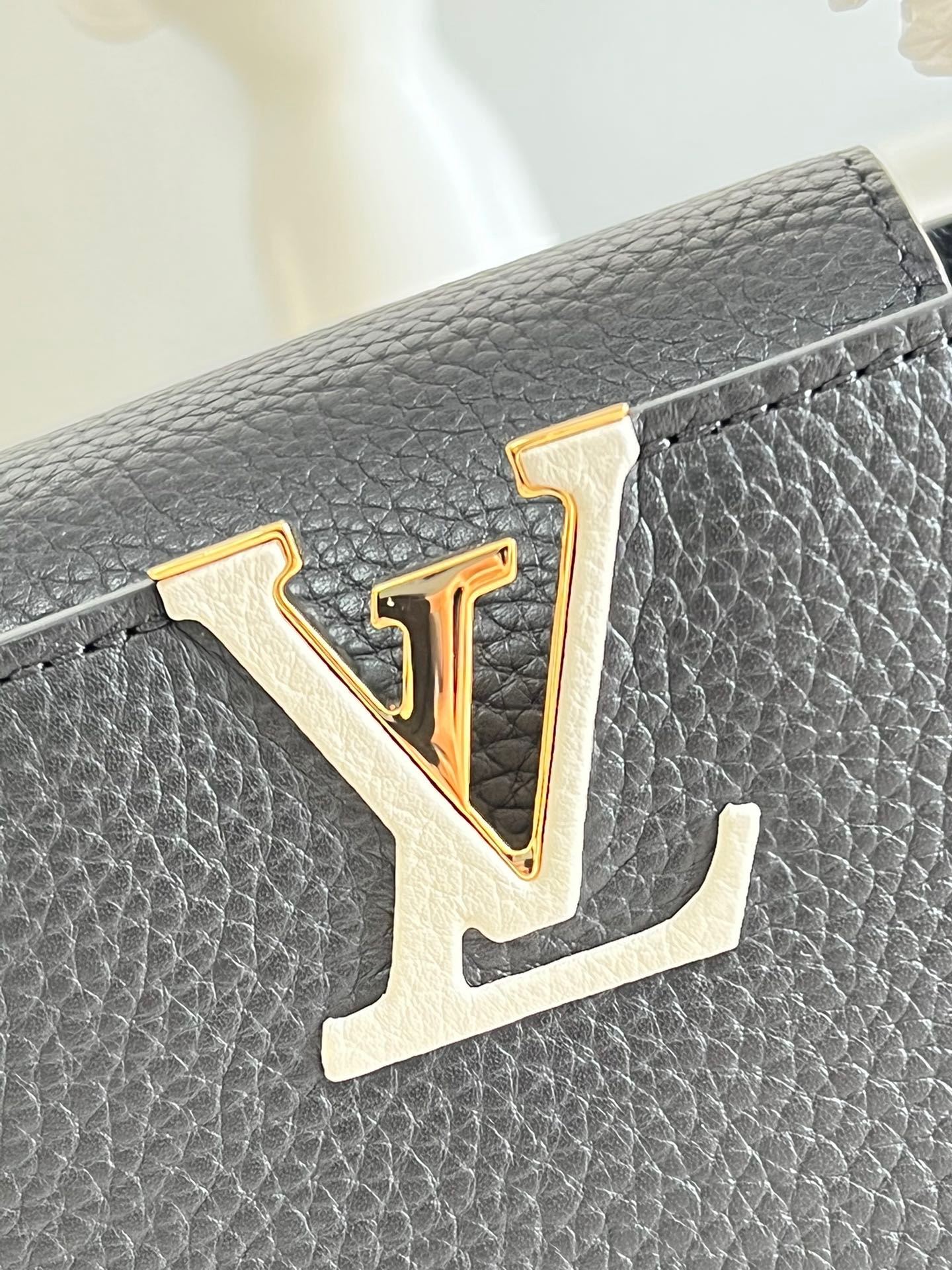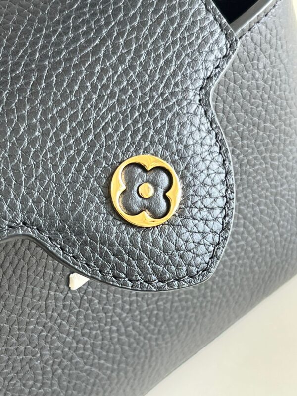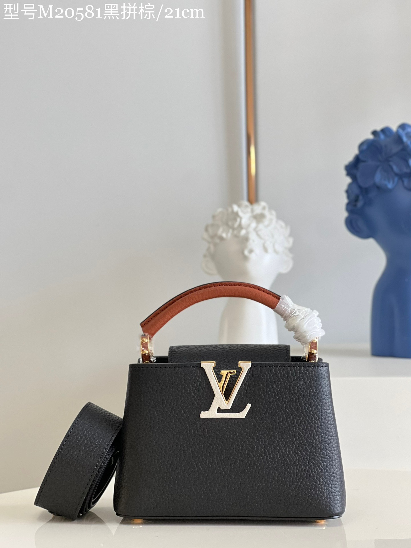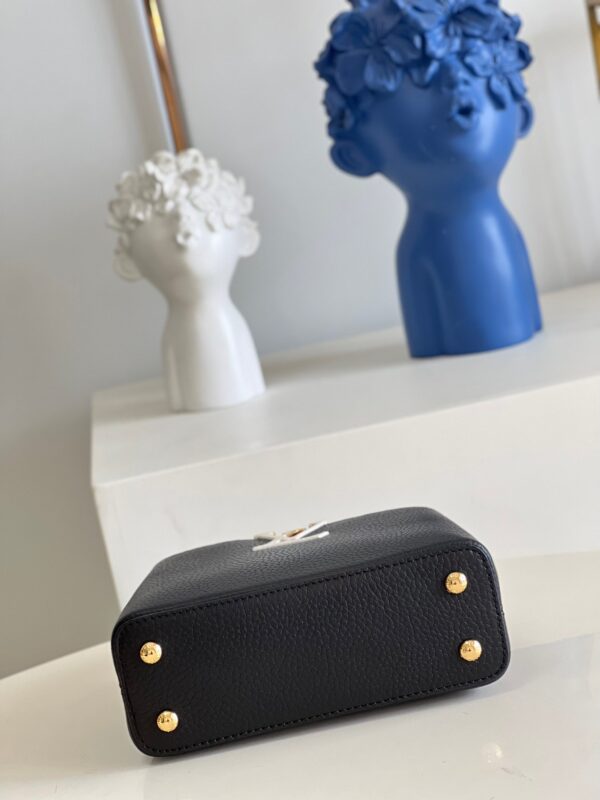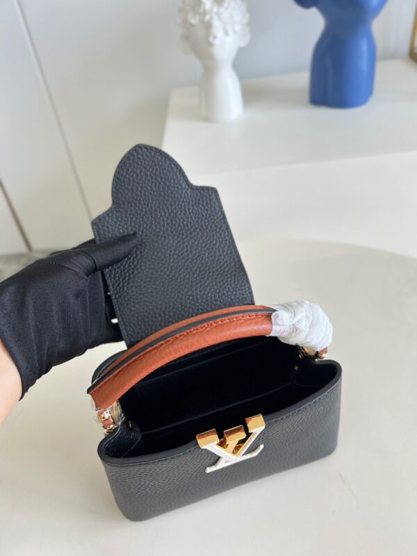 MM20581 Black Spelled Brown Mini Capucines Mini Handbag Imported French calfskin, shiny metal accessories, unique Capucines cover can be put inside the bag to display the letter logo, and can be turned inside out to show the Monogram Flower pattern. Size: 21x14x8cm