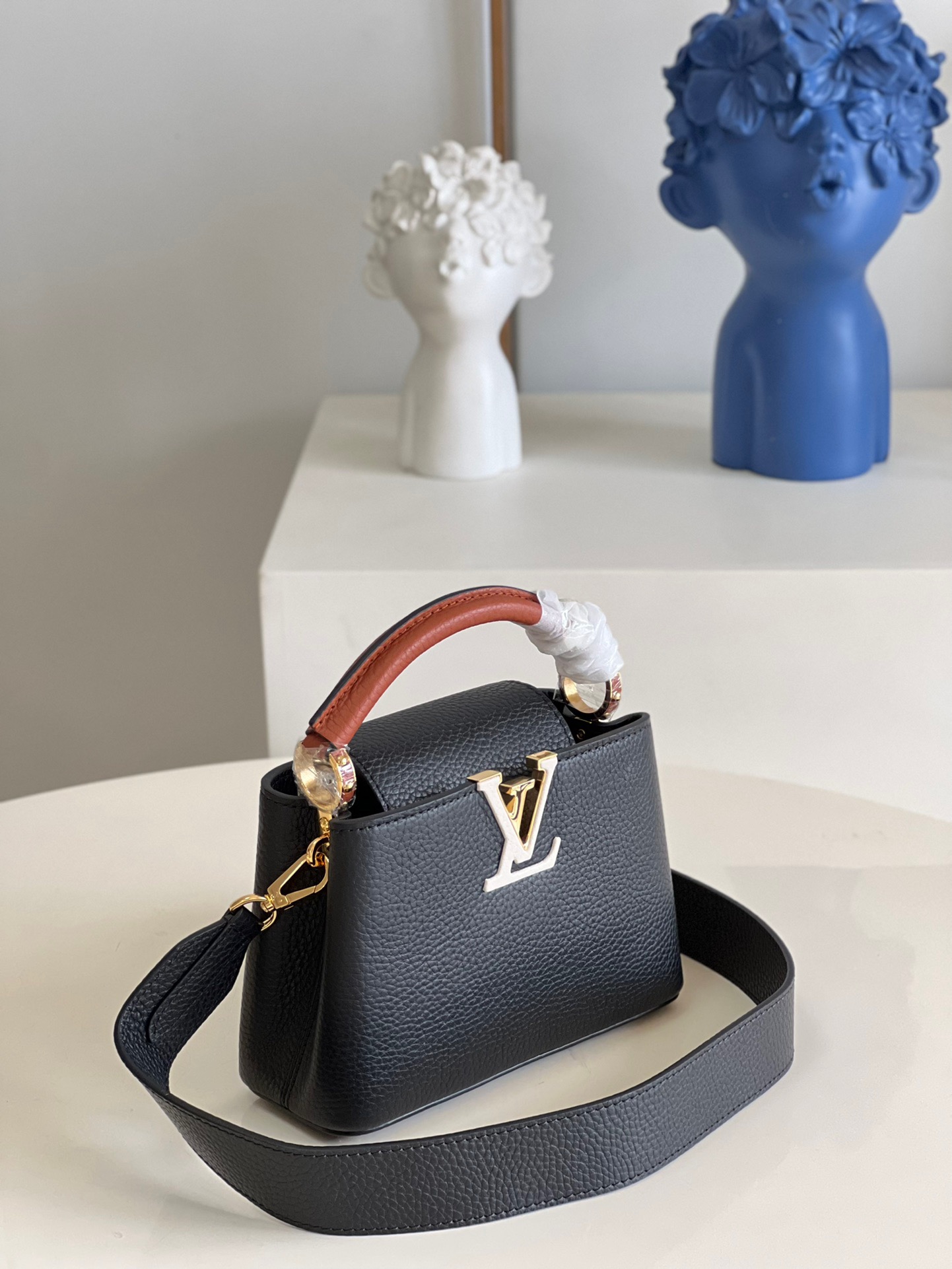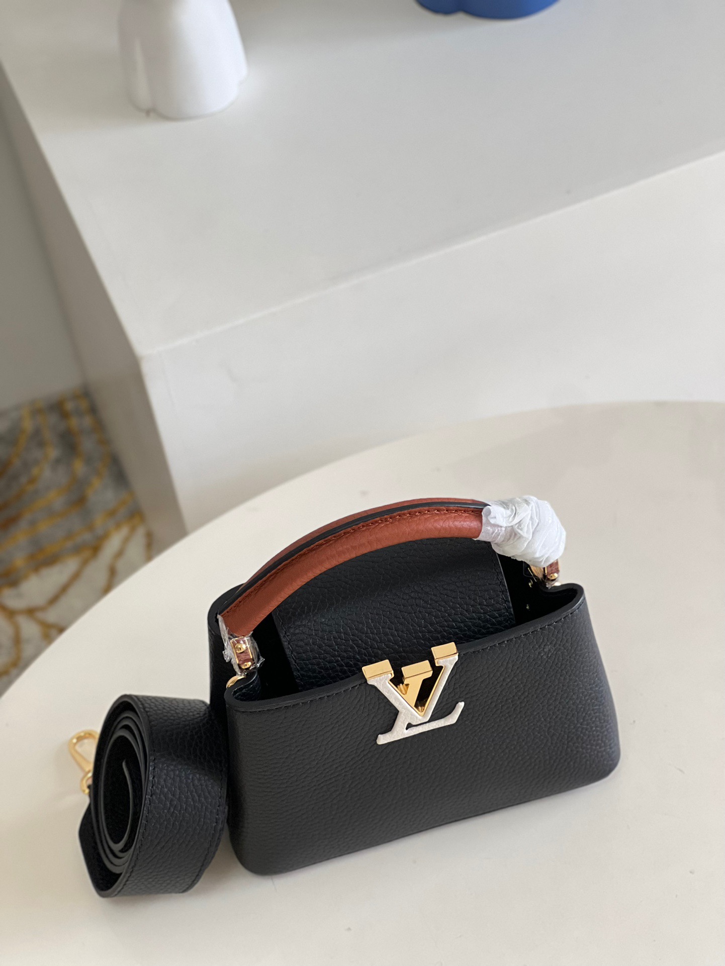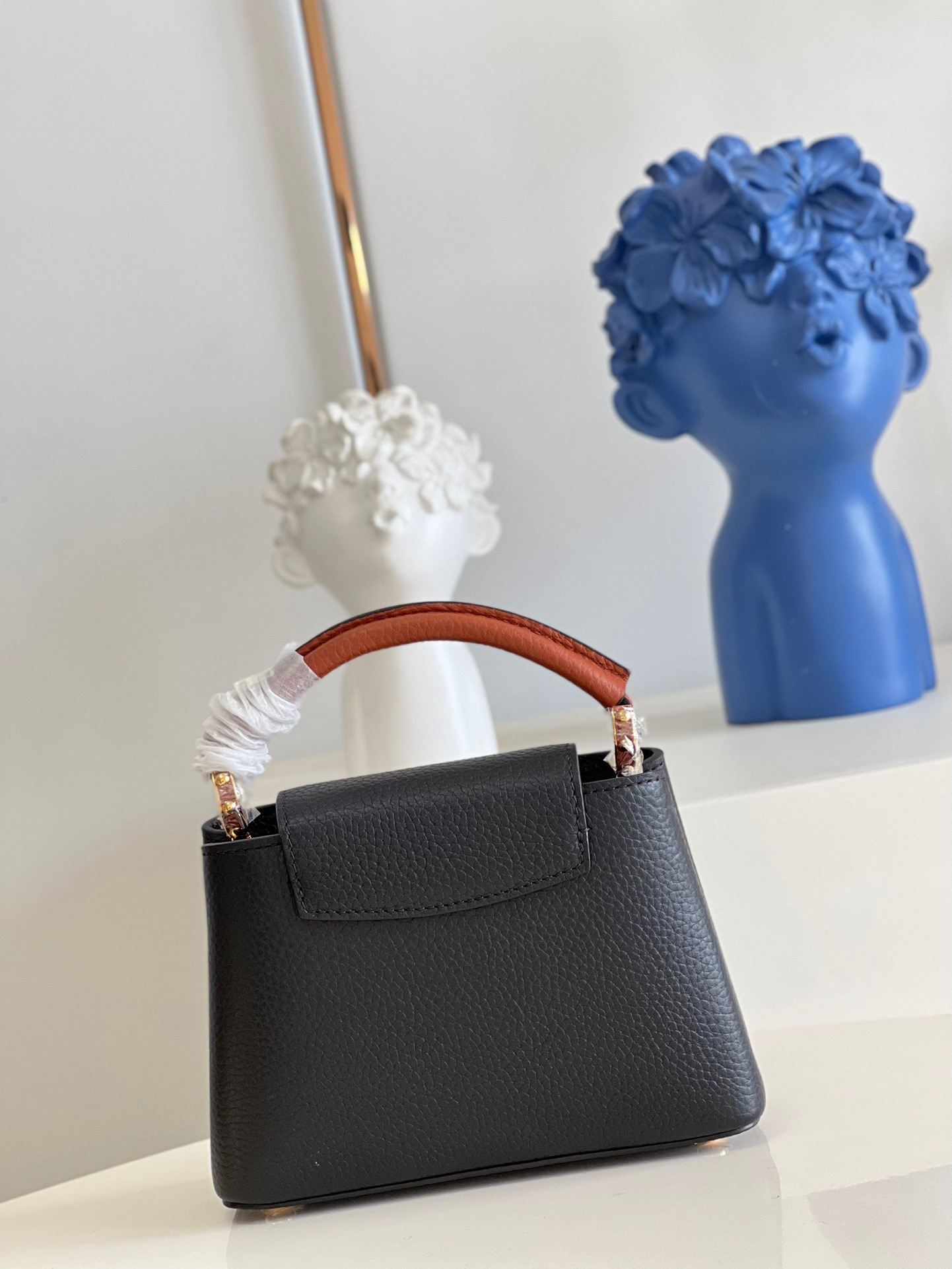 MM20581 Black Spelled Brown Mini Capucines Mini Handbag Imported French calfskin, shiny metal accessories, unique Capucines cover can be put inside the bag to display the letter logo, and can be turned inside out to show the Monogram Flower pattern. Size: 21x14x8cm