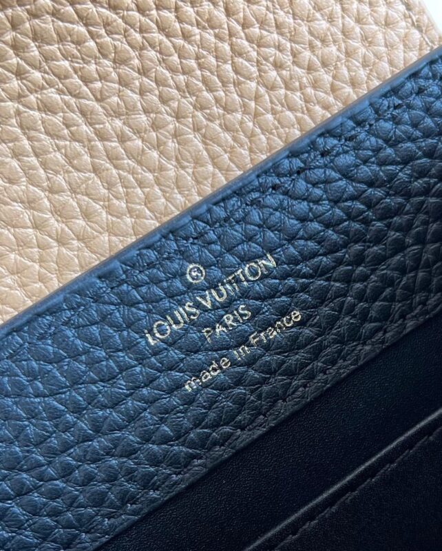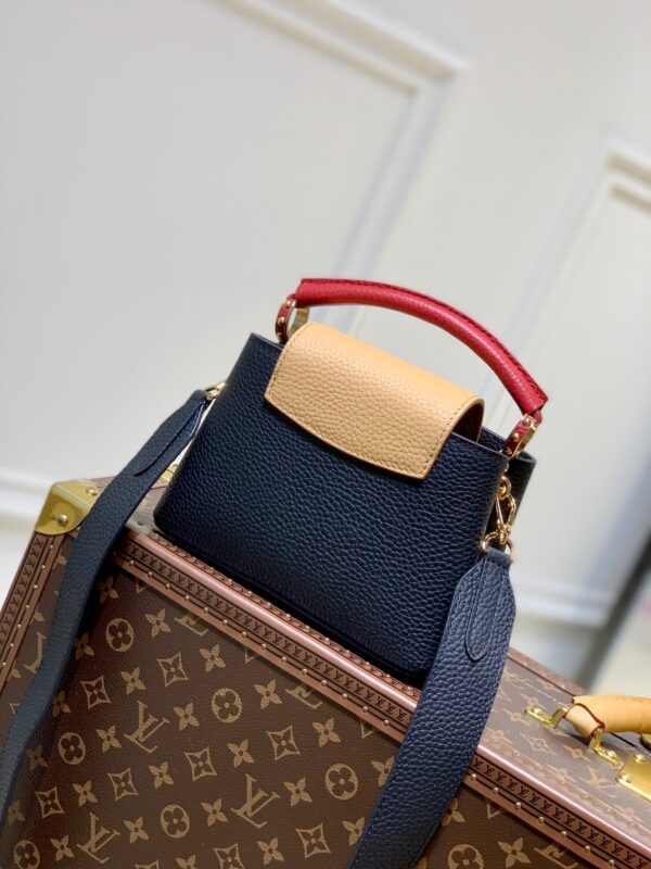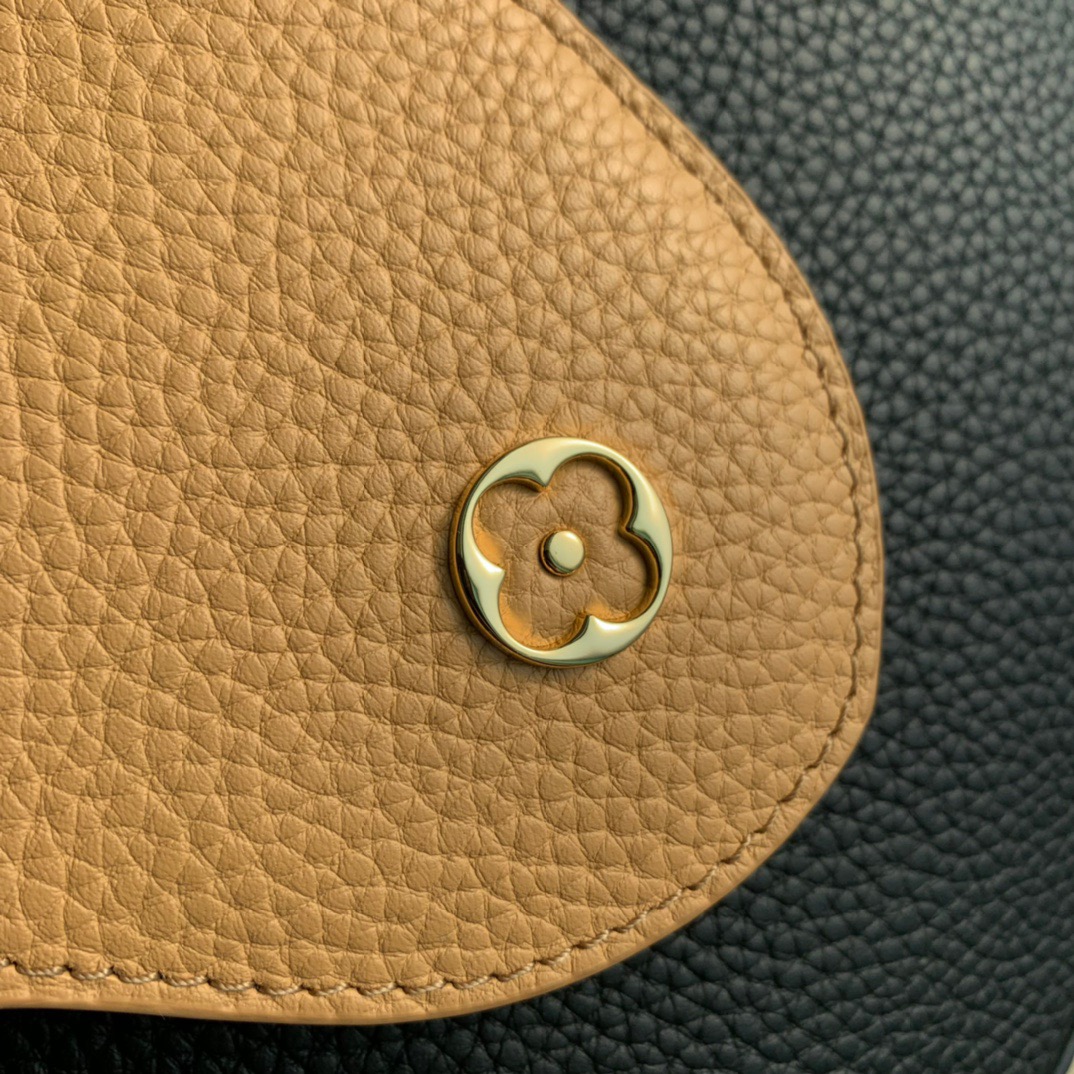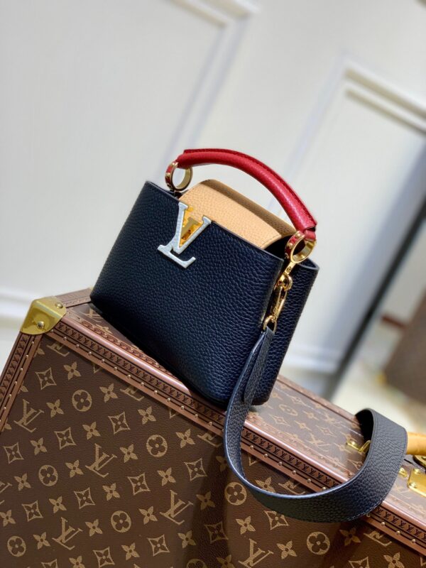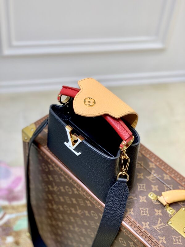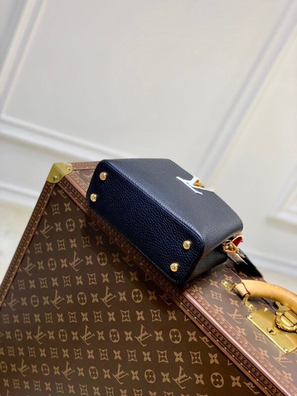 M20704 Black and Brown Mini Louis Vuitton Capucines Mini Handbag Imported French calfskin. Shiny metal accessories. The unique Capucines cover can be placed inside the bag to display the letter logo, and can also be turned out to present the Monogram Flower pattern. Dimensions: 21cmx 14cmx 8 cm