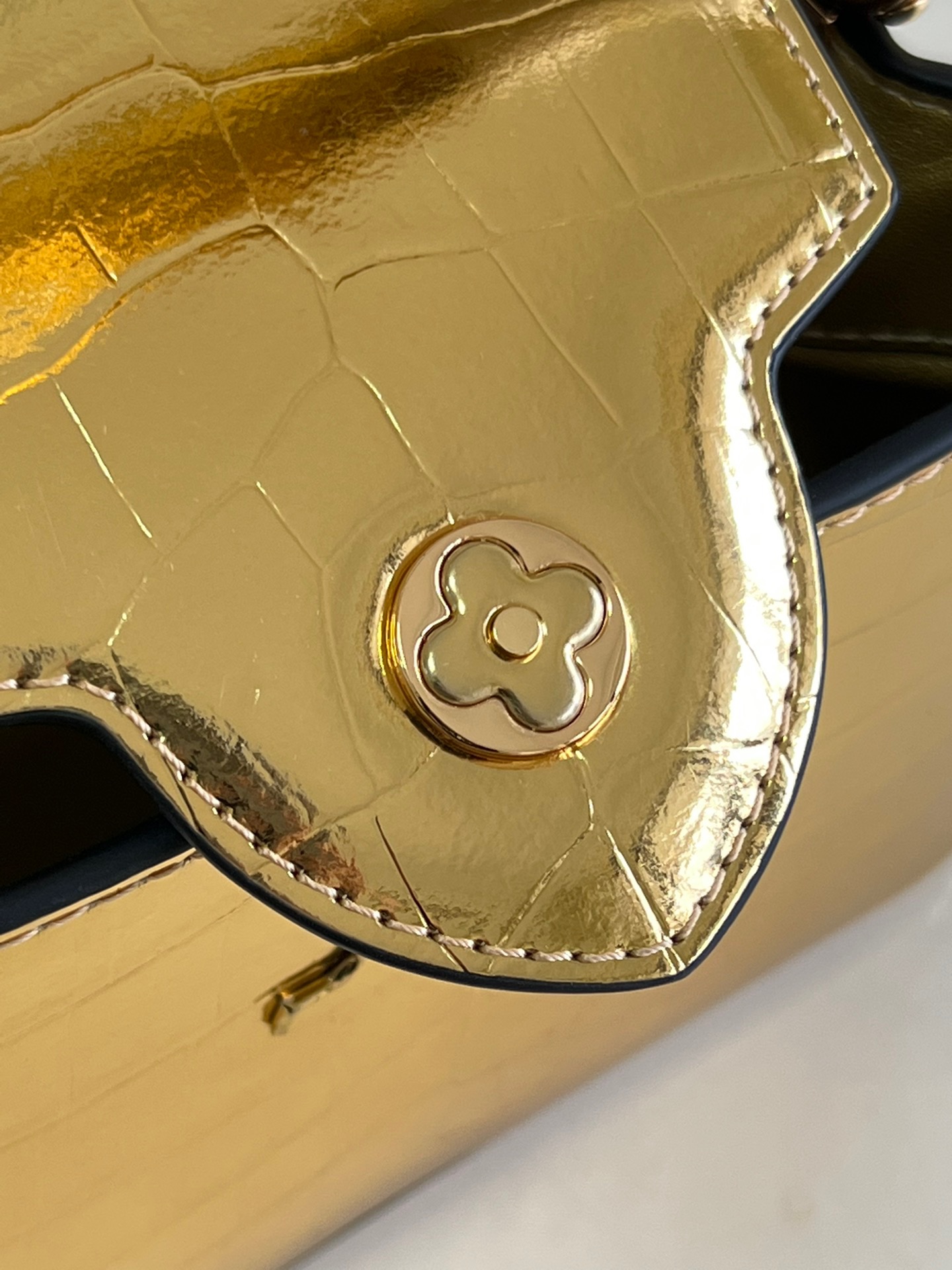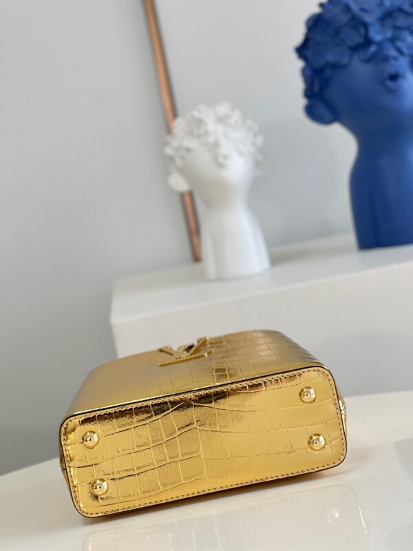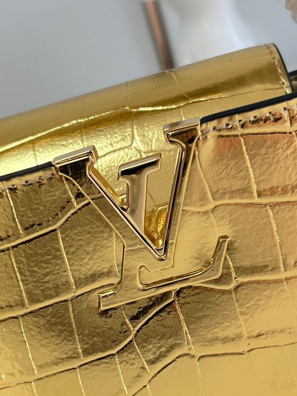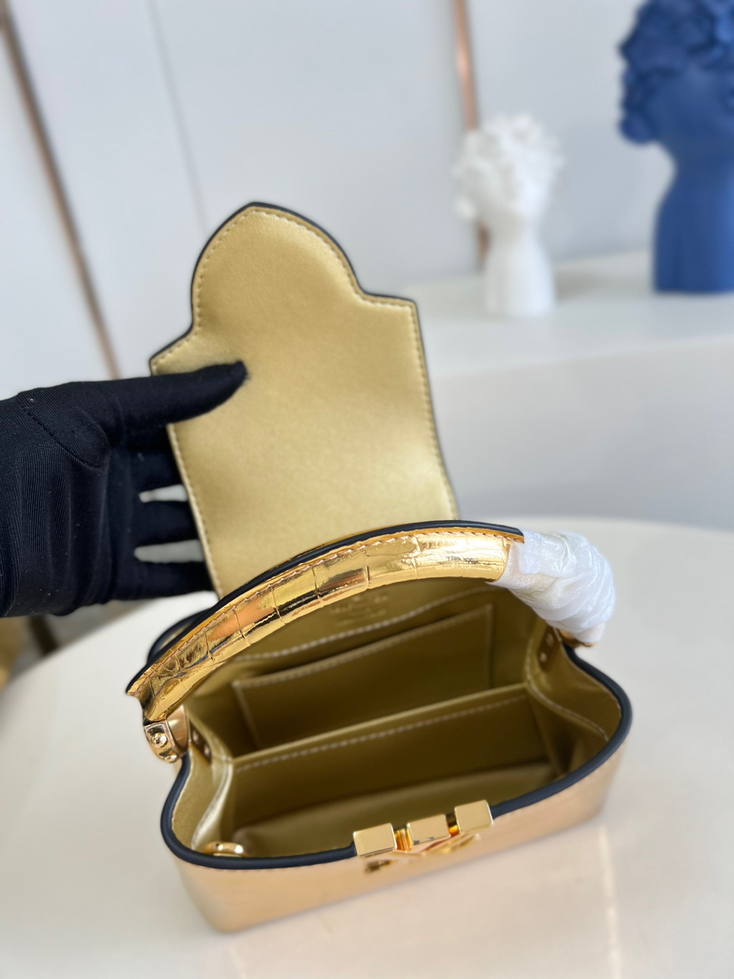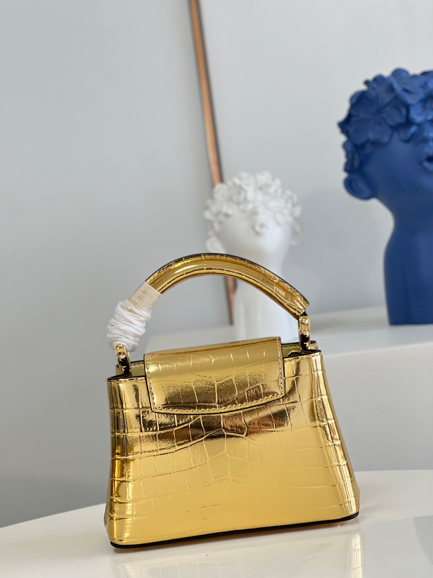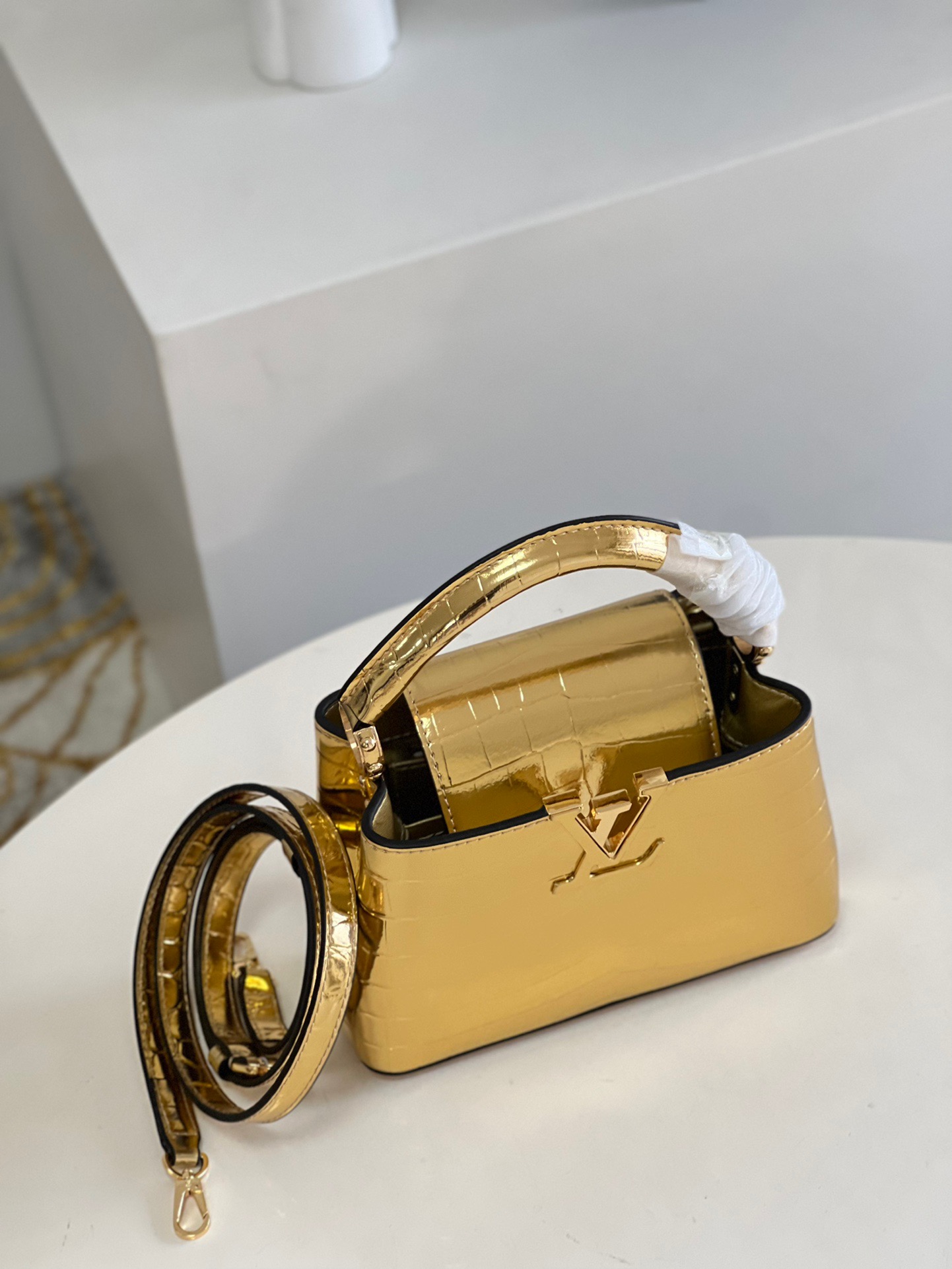 M48865 Bright Gold Crocodile Pattern /Mini Louis Vuitton Capucines Mini Handbag Imported French calfskin. Shiny metal accessories. The unique Capucines cover can be placed inside the bag to display the letter logo, and can also be turned out to present the Monogram Flower pattern.Dimensions: 21cmx 14cmx 8 cm