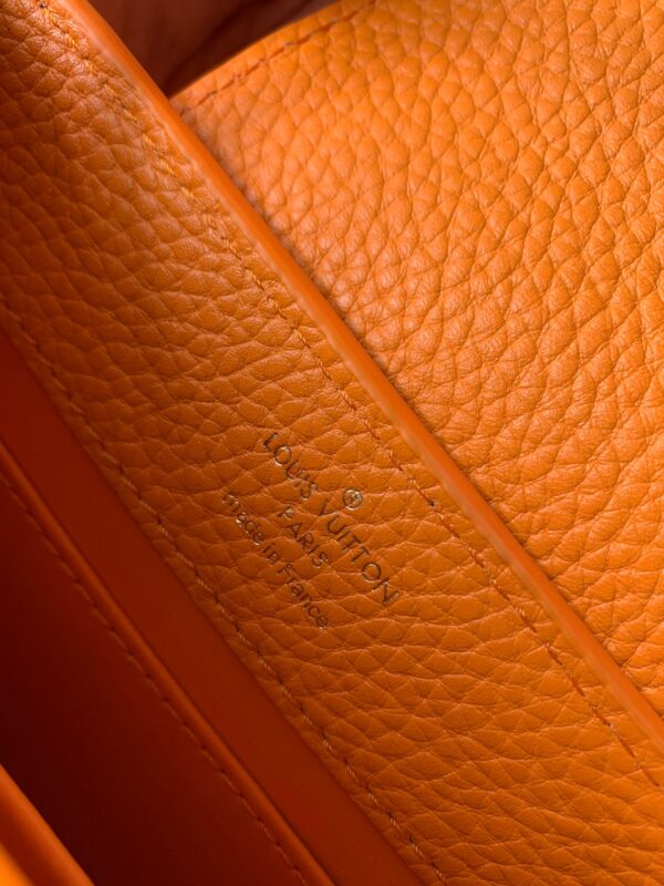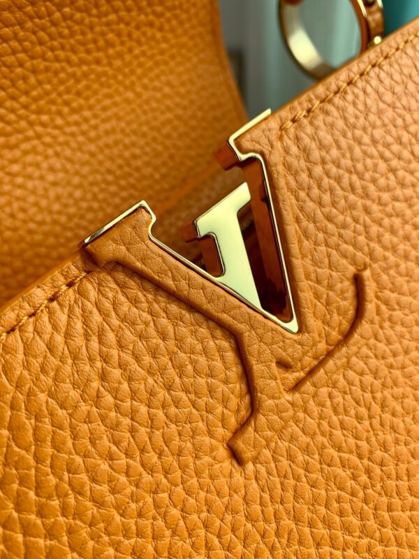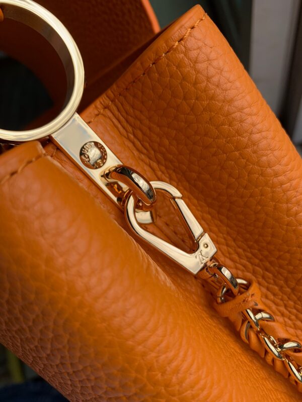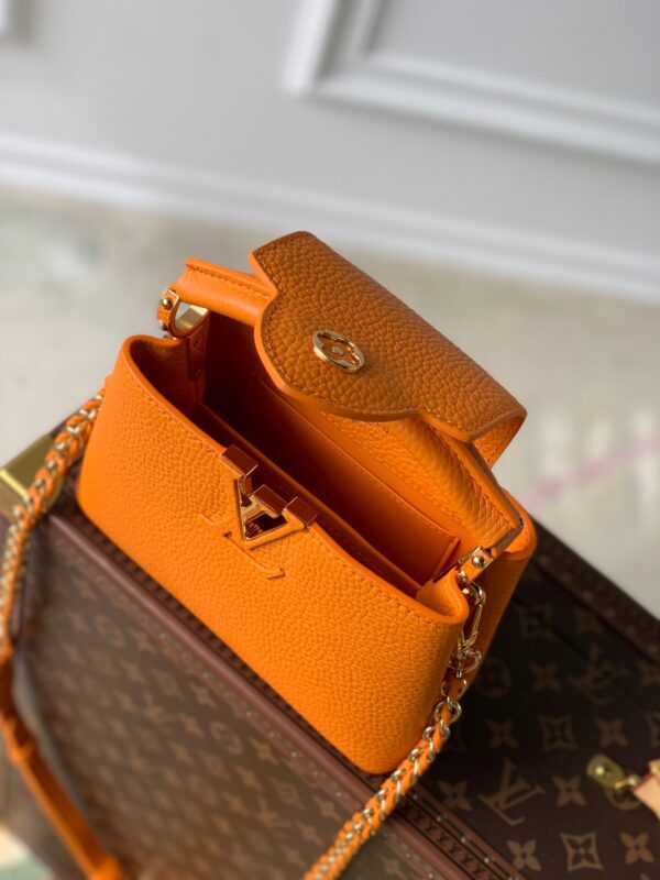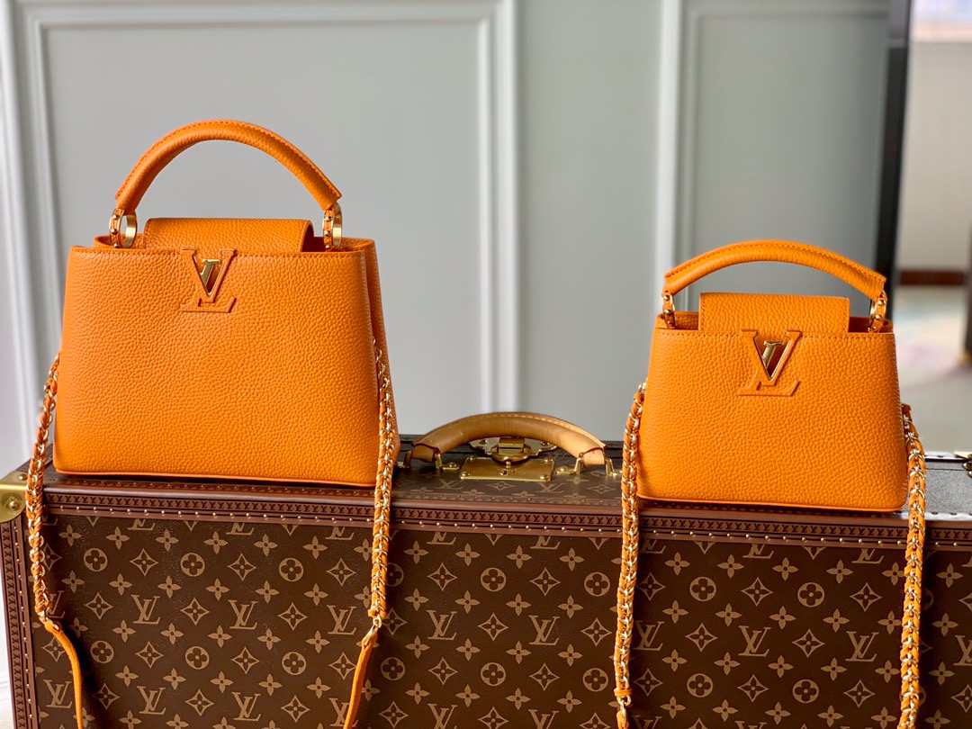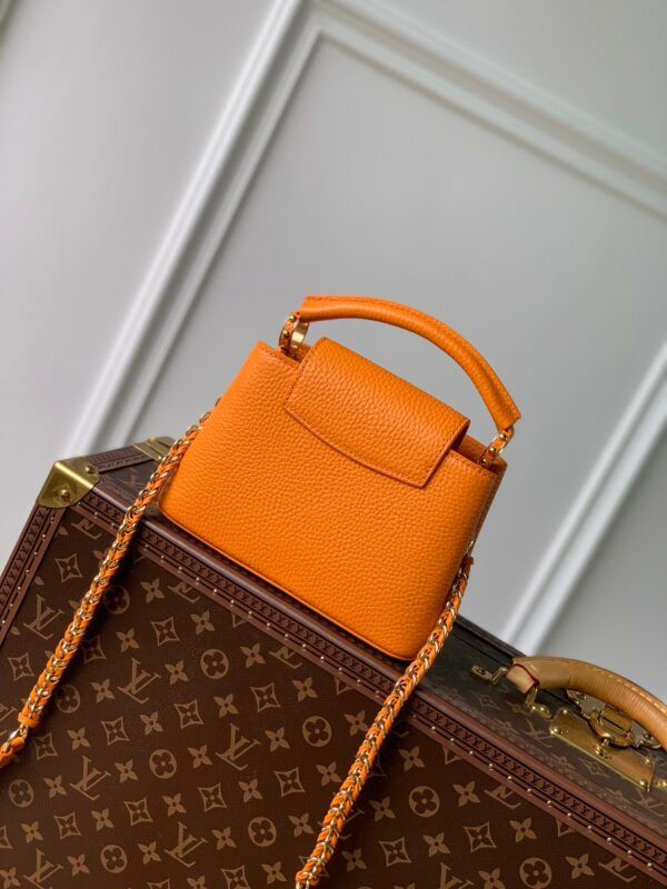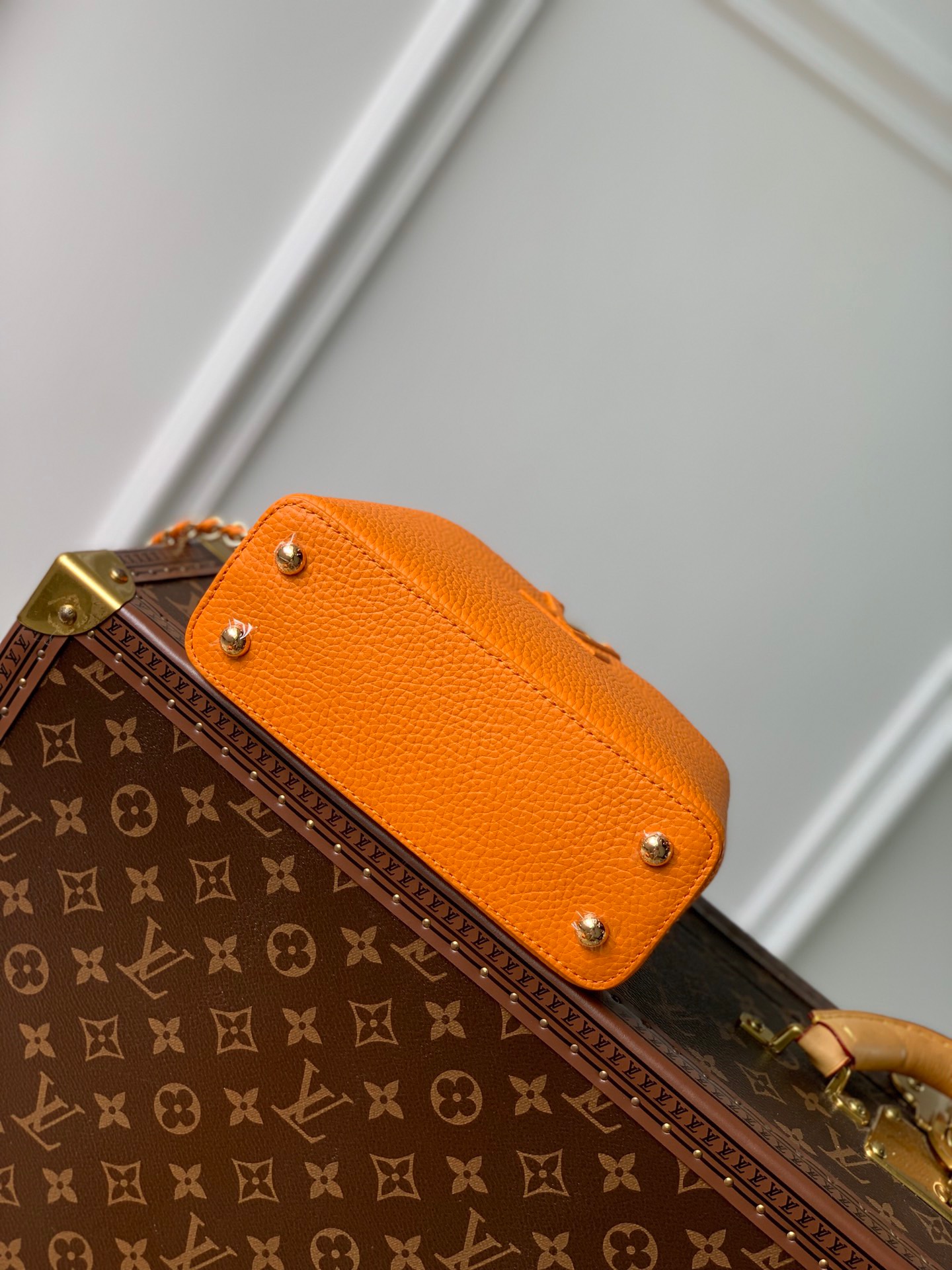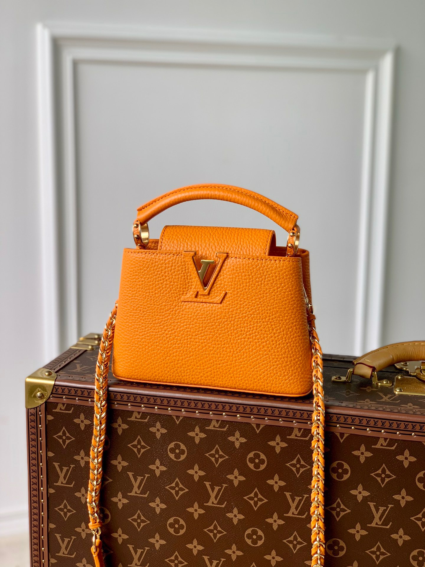 M57909 Capucines Mini Handbag This Capucines mini handbag is made of bright Taurillon leather, and the leather and chain are intertwined to show the craftsmanship. The chain can be removed or adjusted as you like, for shoulder and crossbody options. The flap folds in to reveal the half-leather LV monogram. Dimensions: 21 x 14 x 8 cm (L x H x W)