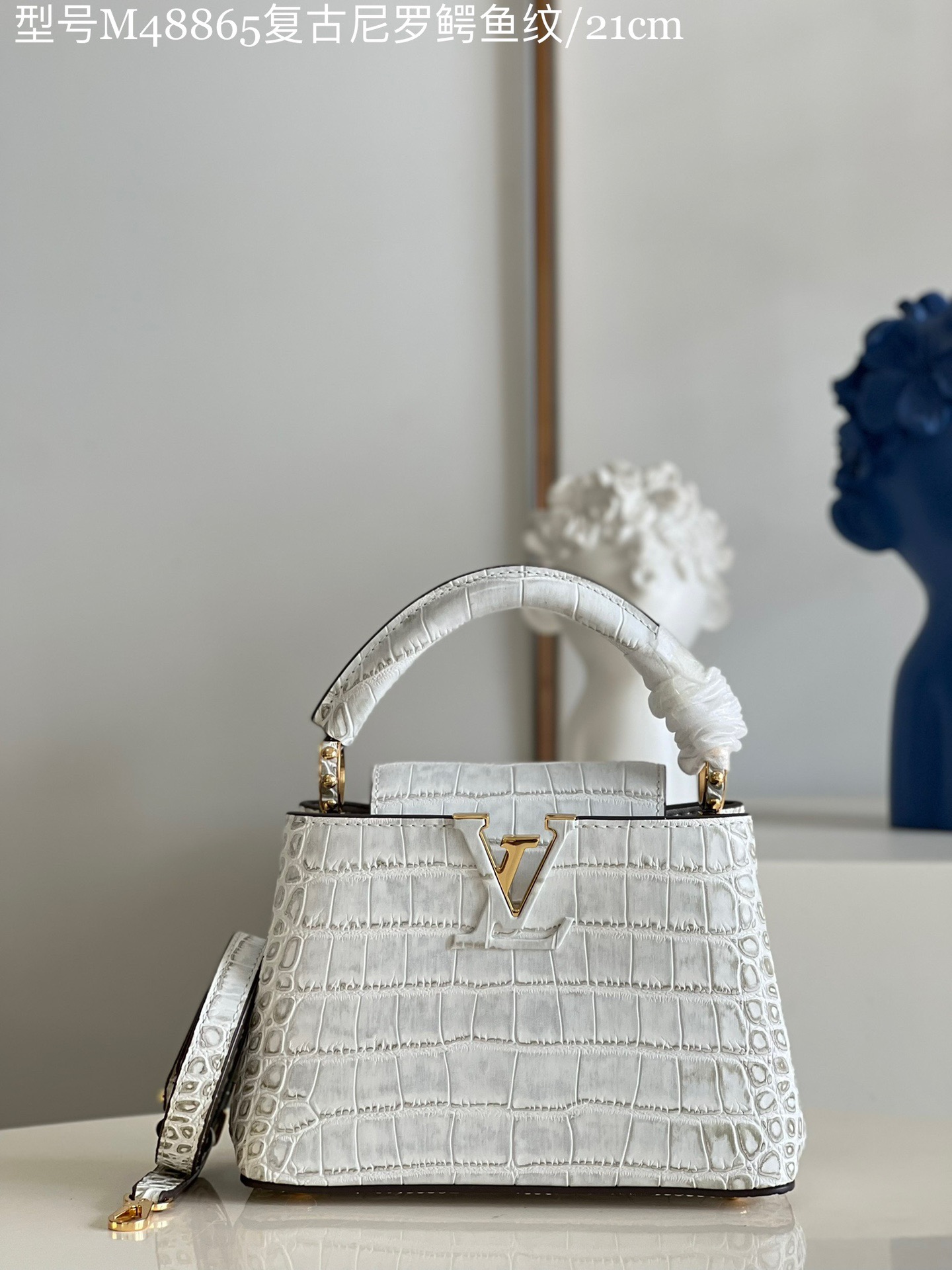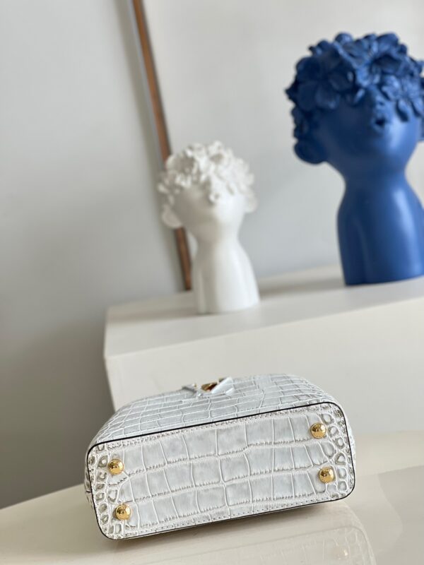 M48865 Retro Nile Crocodile Pattern /Mini Louis Vuitton Capucines Mini Handbag Imported French calfskin. Shiny metal accessories. The unique Capucines cover can be placed inside the bag to display the letter logo, and can also be turned out to present the Monogram Flower pattern.Dimensions: 21cmx 14cmx 8 cm
