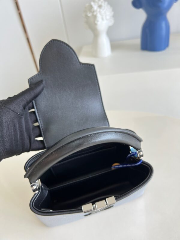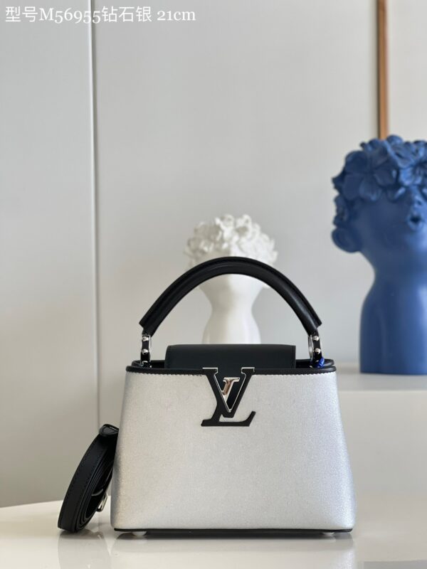 M56955 Diamond Silver Mini Capucines Mini Handbag Imported French calfskin. Shiny metal accessories. The unique Capucines cover can be placed inside the bag to display the letter logo, and can be turned out to present the Monogram Flower pattern.Size: 21x14x8cm