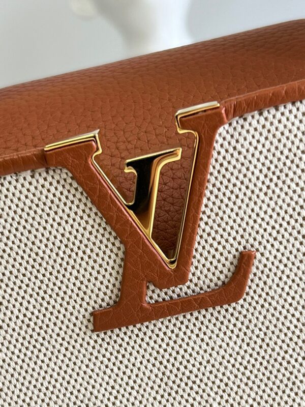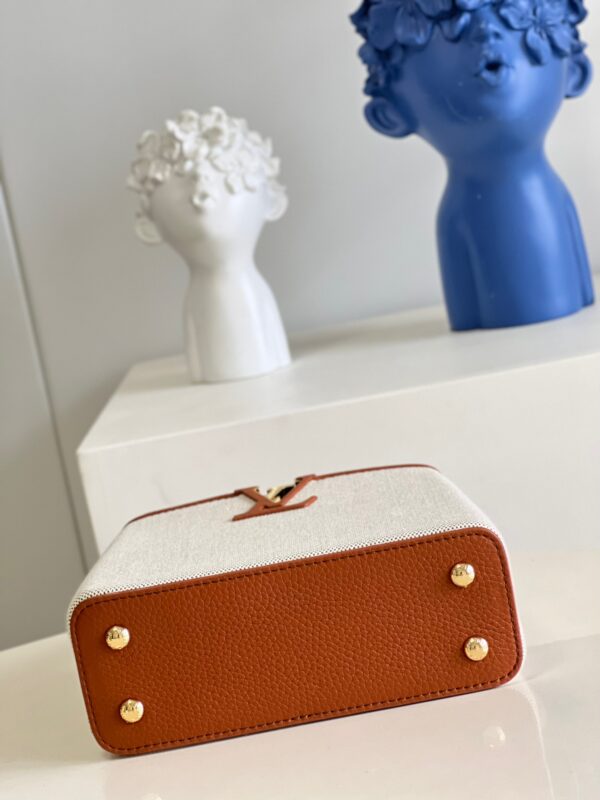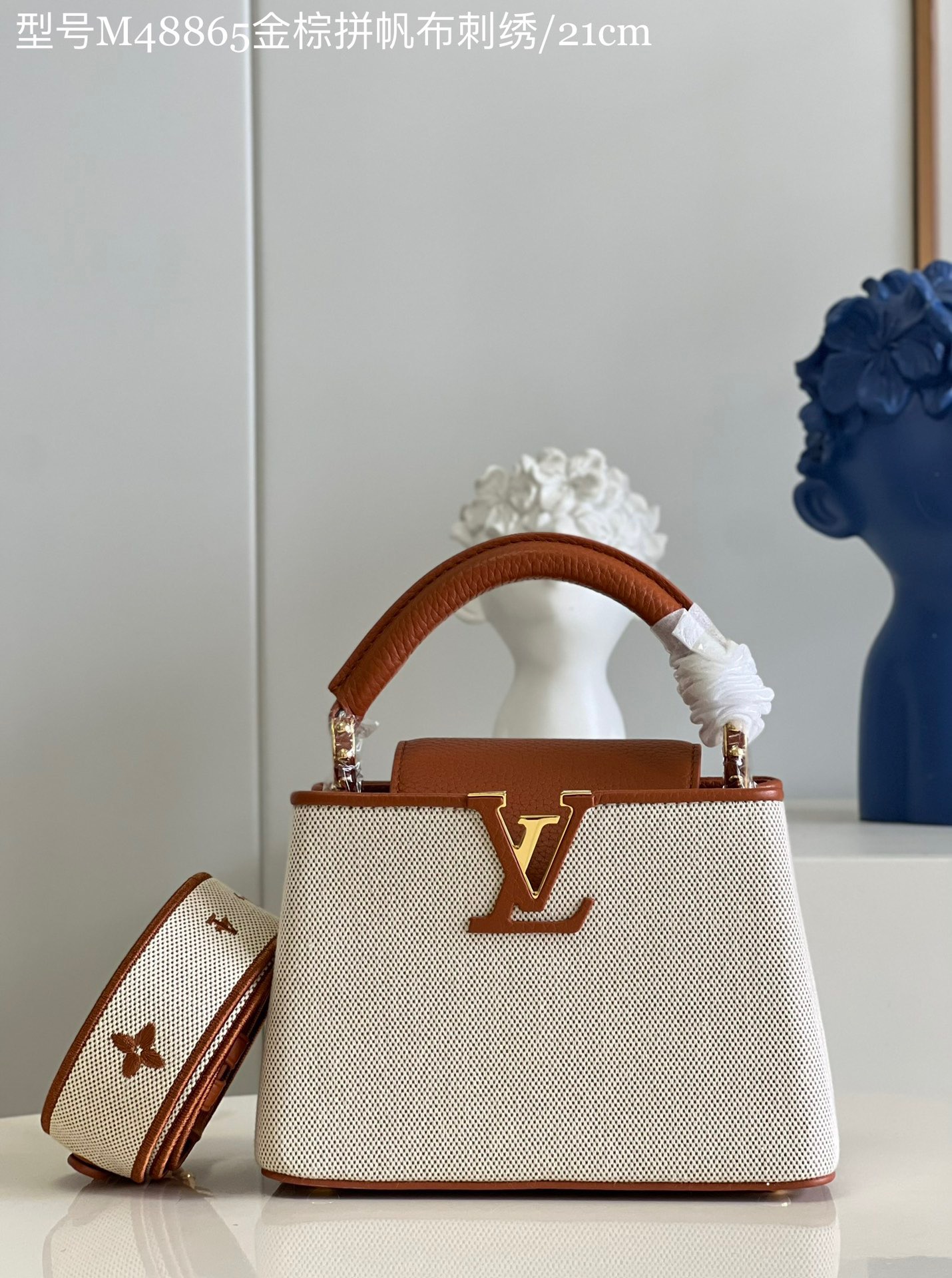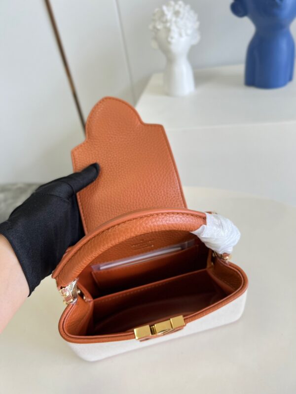 M48865 Gold Brown and Canvas Embroidery Mini Imported French calfskin. Shiny metal accessories. The unique Capucines cover can be placed inside the bag to display the letter logo, and can be turned out to present the Monogram Flower pattern.Size:21x14x8cm