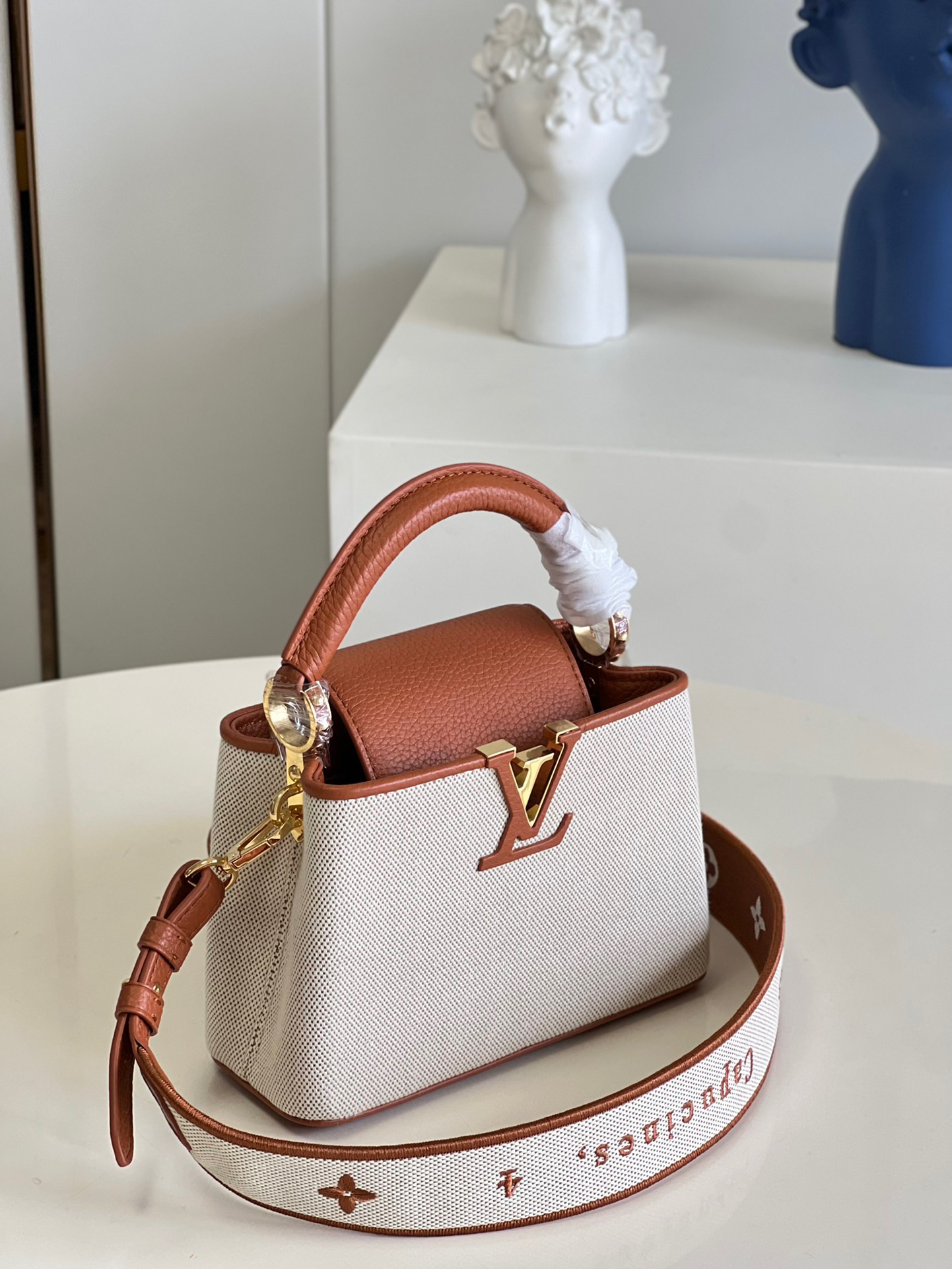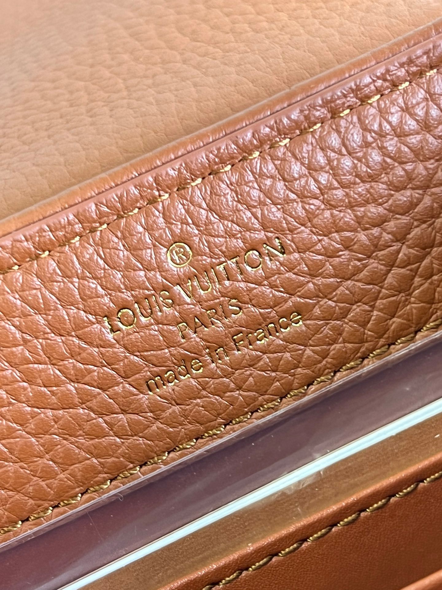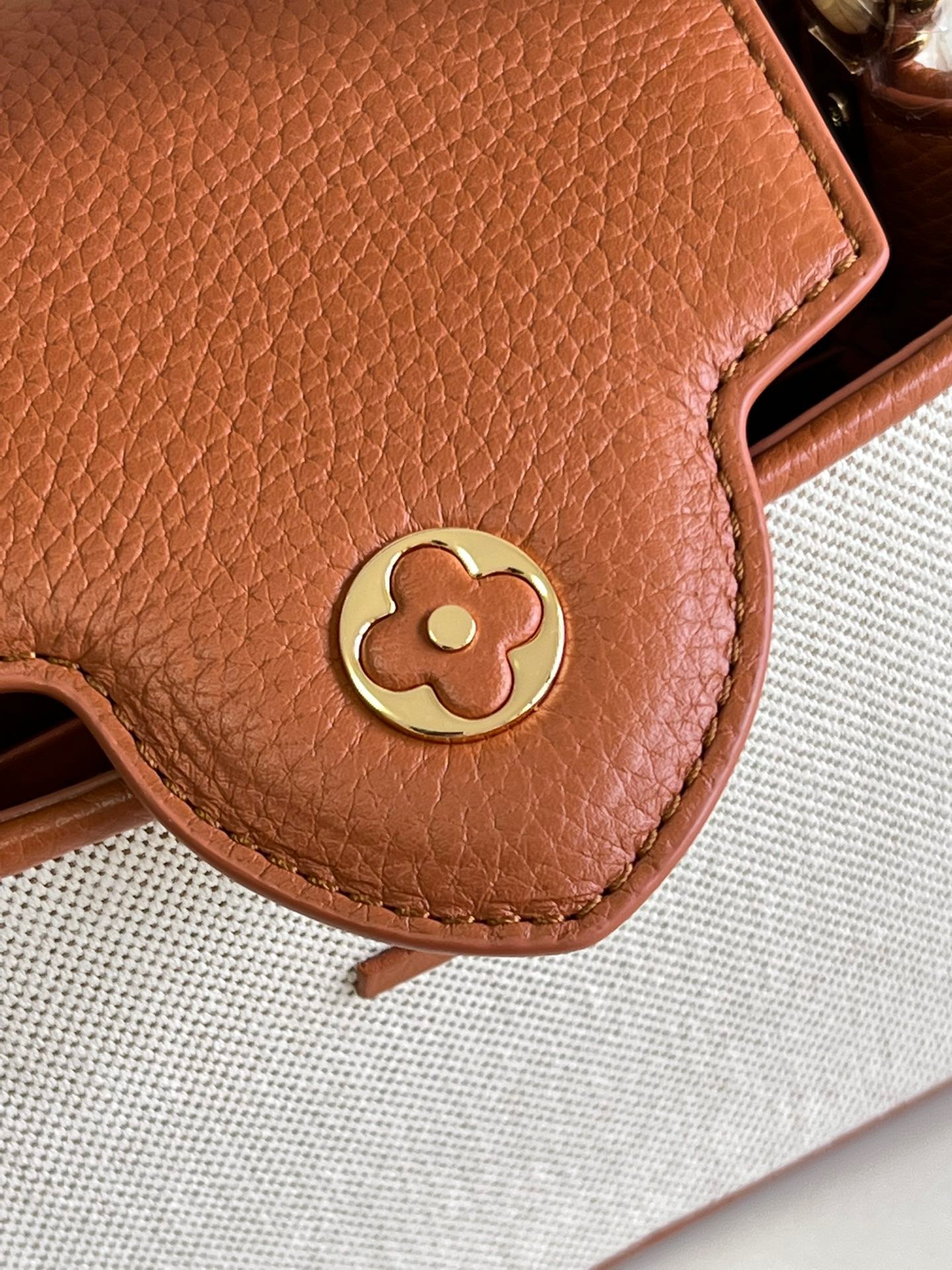 M48865 Gold Brown and Canvas Embroidery Mini Imported French calfskin. Shiny metal accessories. The unique Capucines cover can be placed inside the bag to display the letter logo, and can be turned out to present the Monogram Flower pattern.Size:21x14x8cm