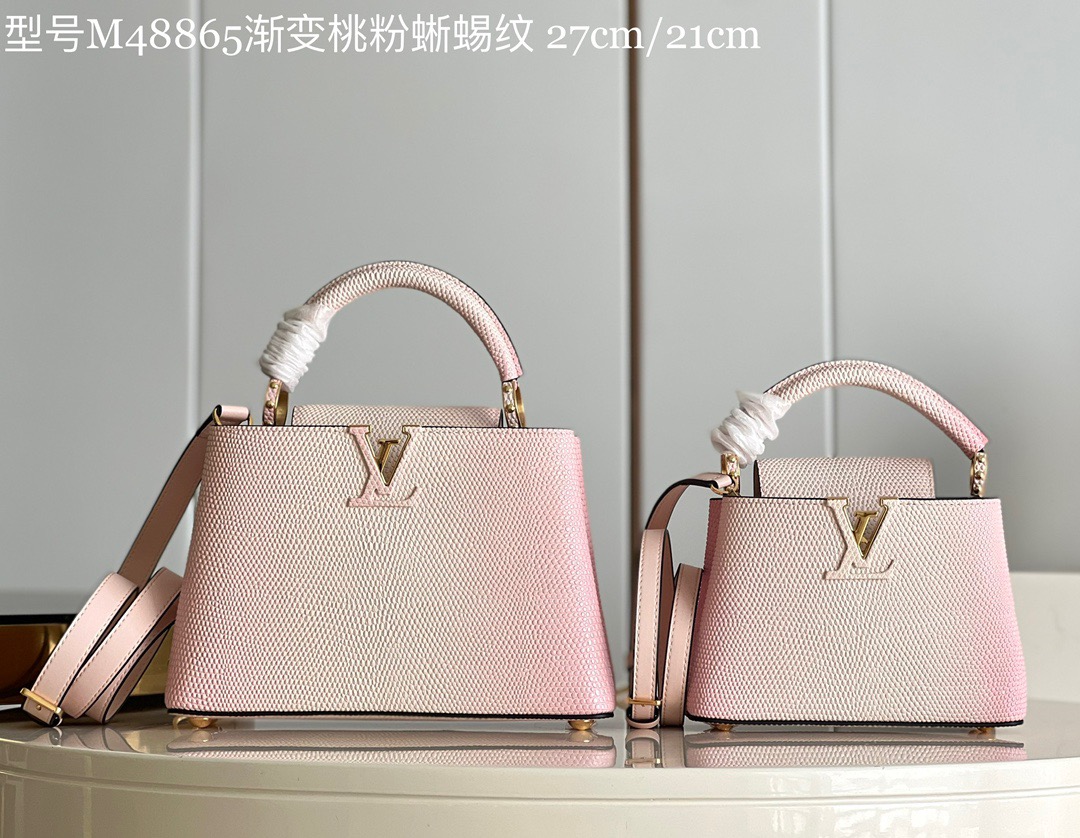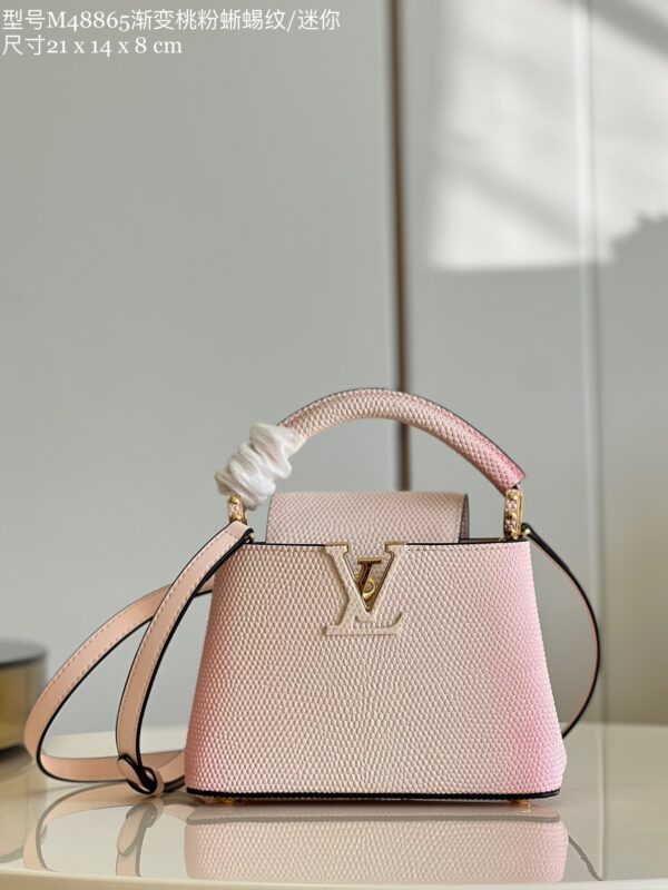 Louis Vuitton Capucines Mini Handbag Metal Monogram flowers are polished and glazed by hand, connected in series with delicate chains. Use the detachable and adjustable slim shoulder strap to explore more ways to carry it. Model: M48865 Gradient pink lizard pattern Dimensions 21cm x 14cm x 8cm