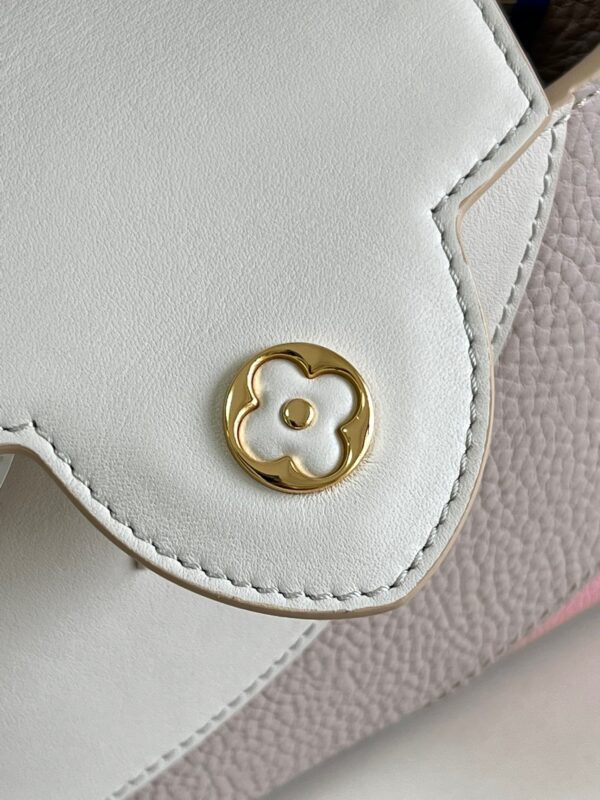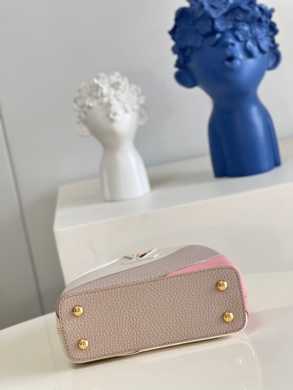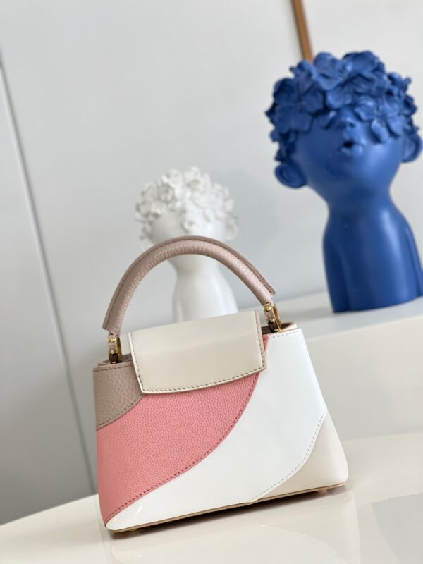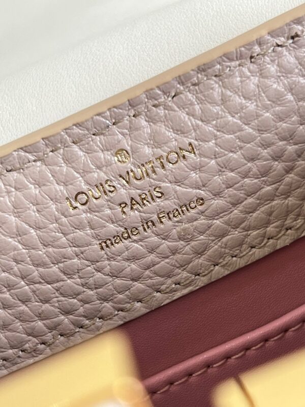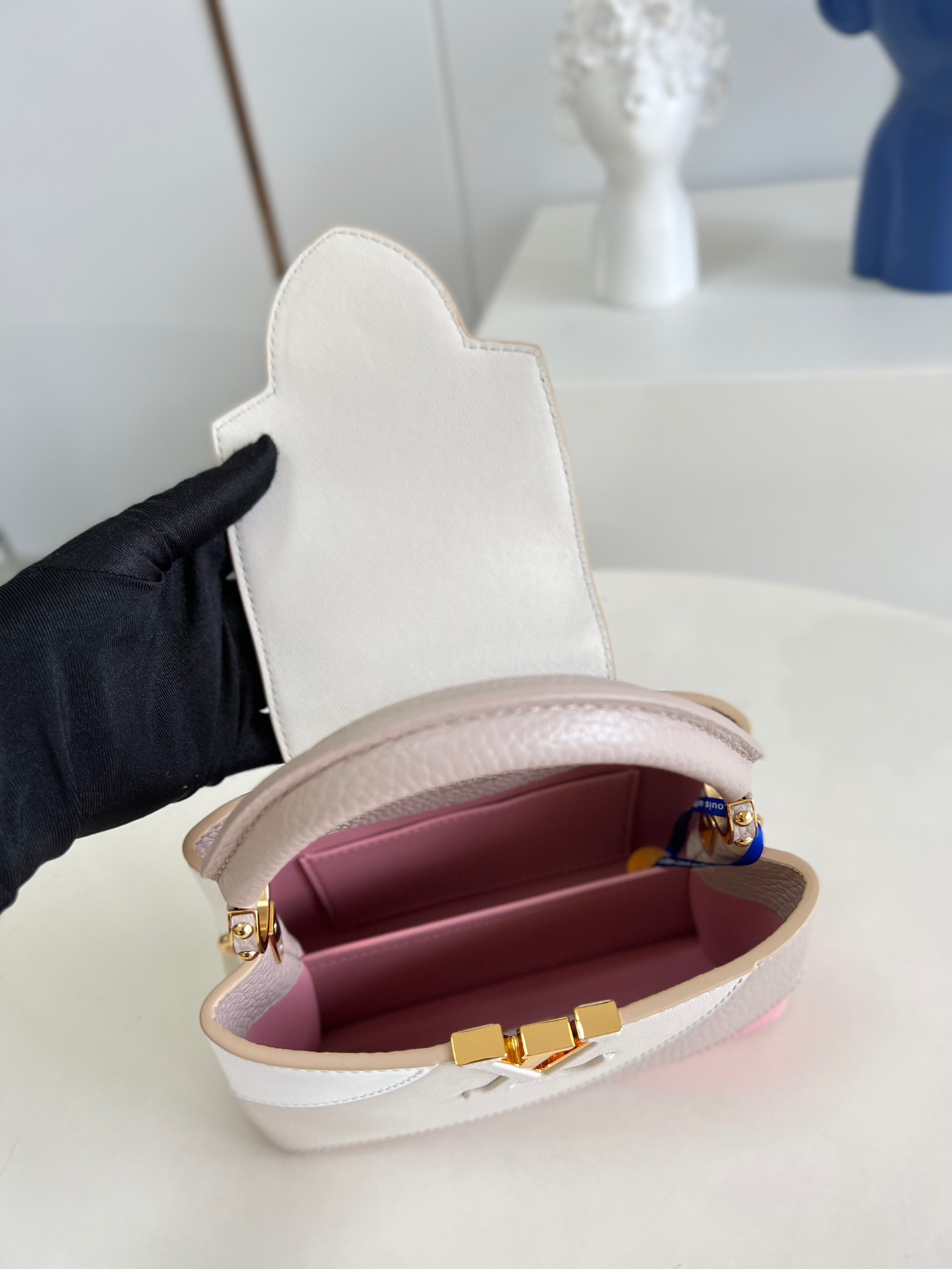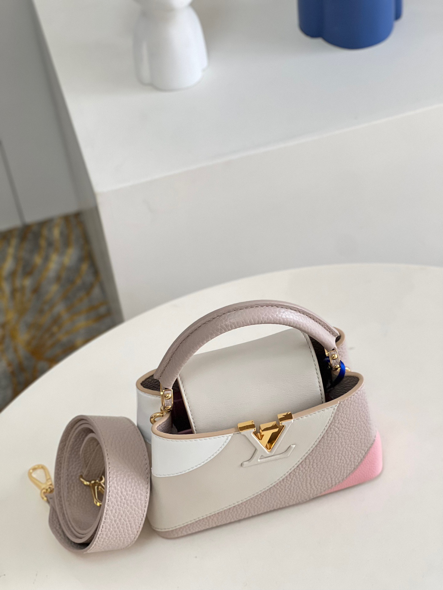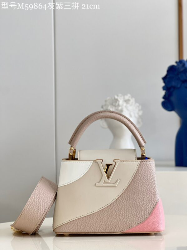 M59864 Gray and Purple Three-piece Mini Capucines Mini Handbag Imported French calfskin. Shiny metal accessories. The unique Capucines cover can be placed inside the bag to display the letter logo, and can be turned out to present the Monogram Flower pattern.Size :21x14x8cm