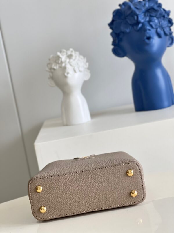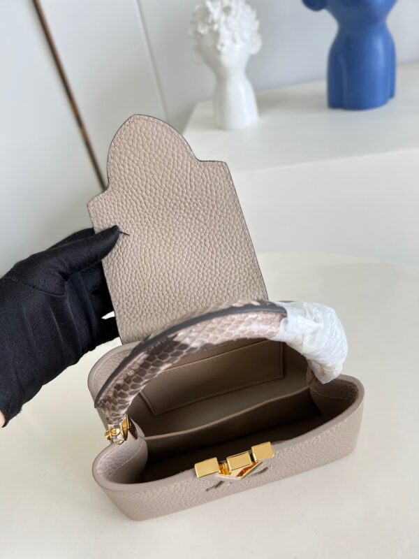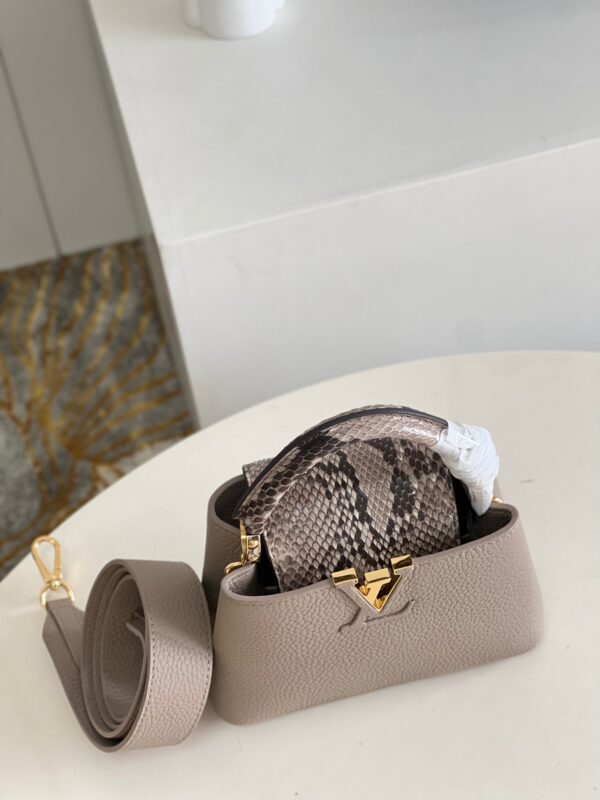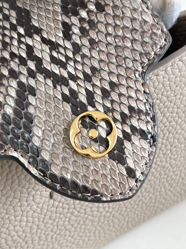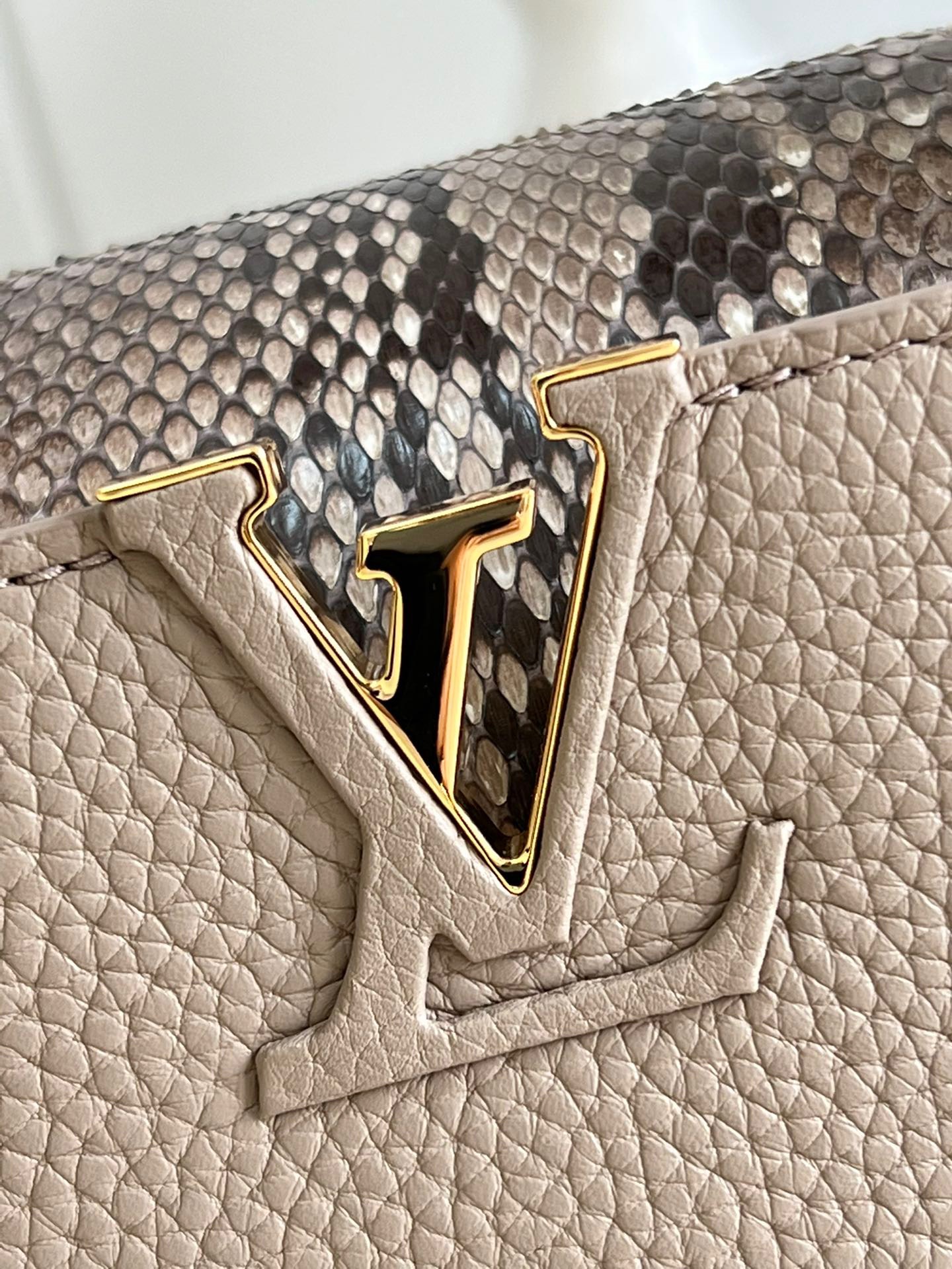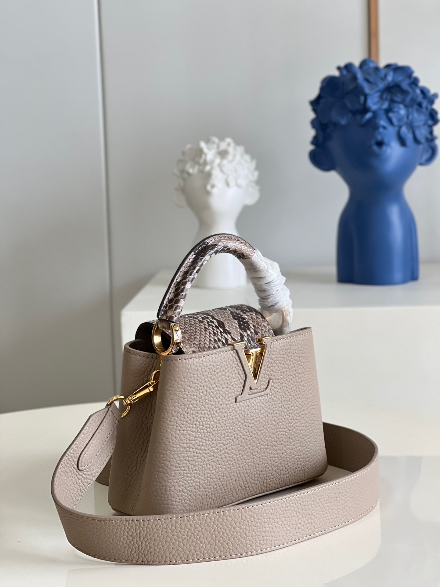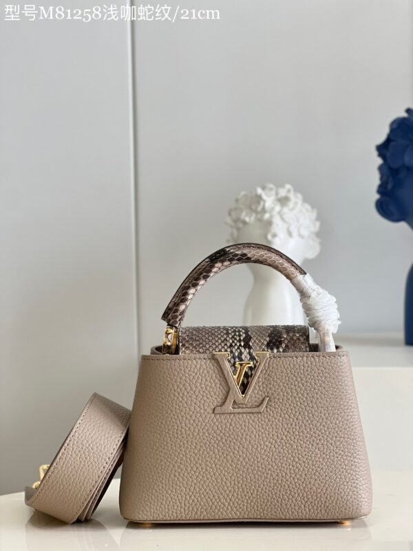 M81258 Light Coffee Snake Pattern Capucines Mini Handbag Imported French calfskin, shiny metal decorations, unique Capucines cover can be put into the bag to display the letter logo, and can be turned out to present Monogram Flower Pattern.Size: 21x14x8 cm