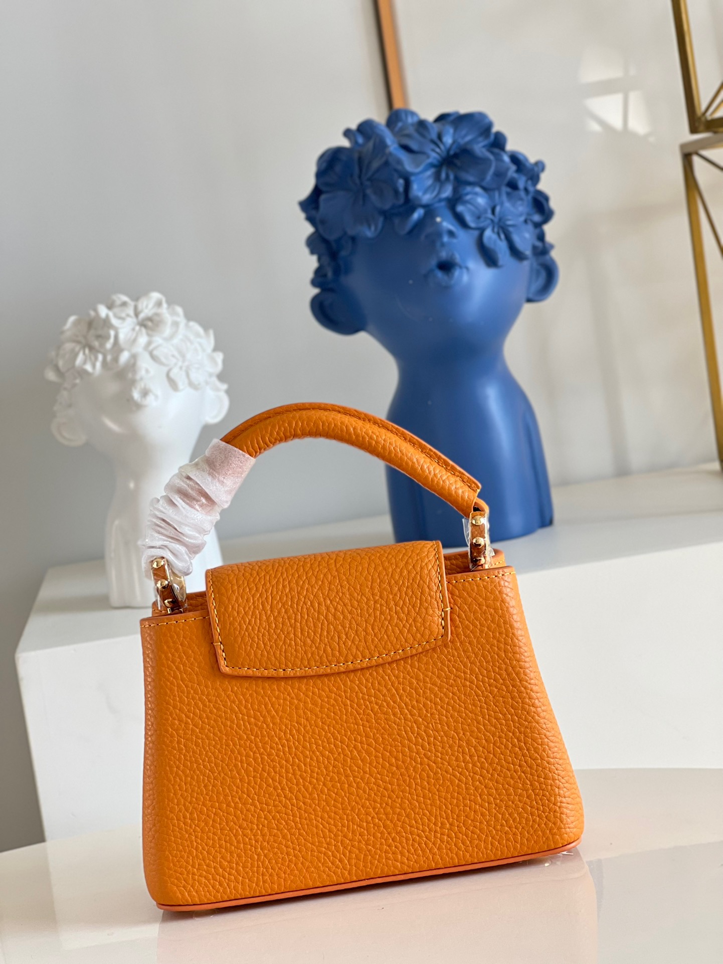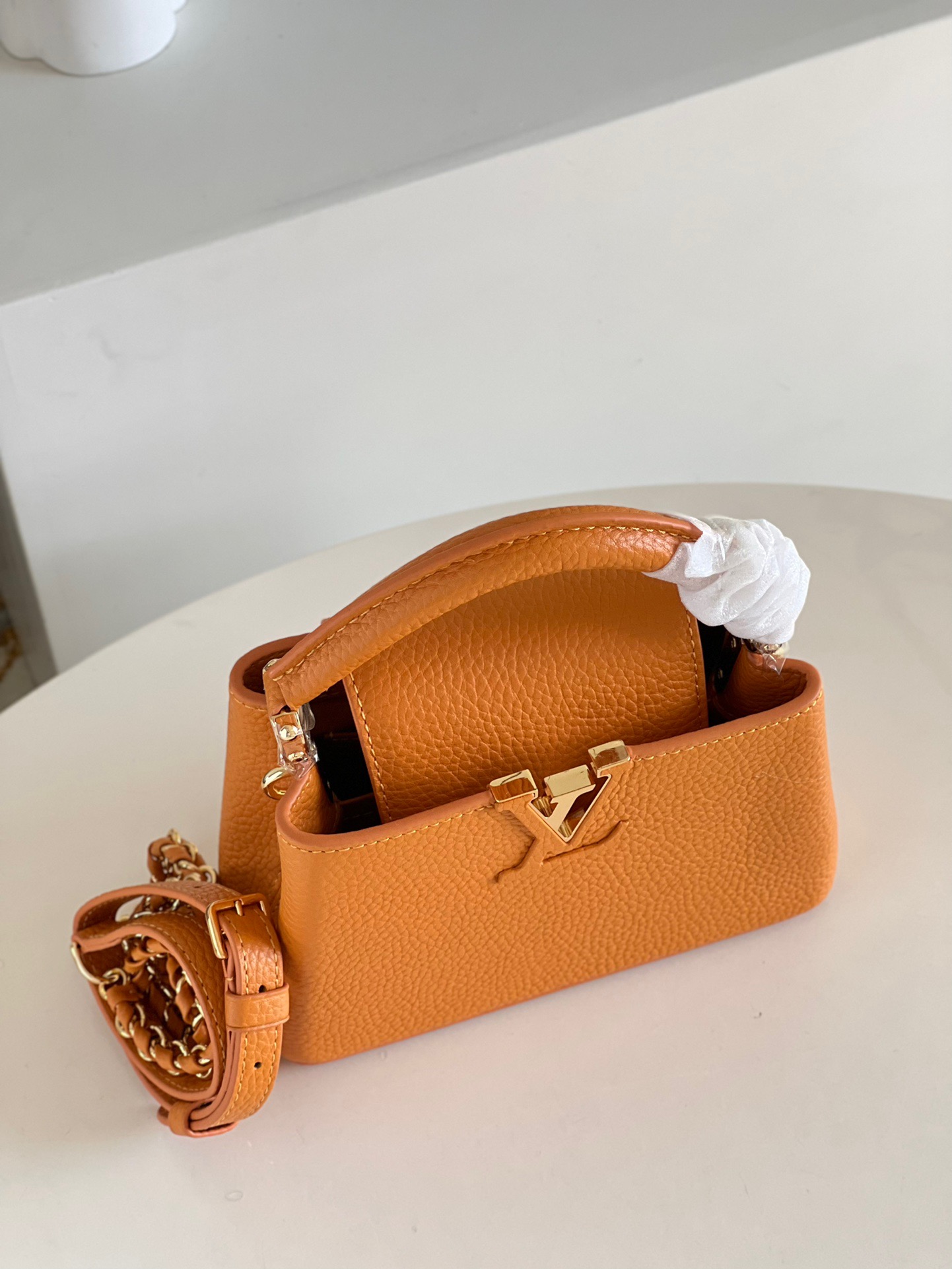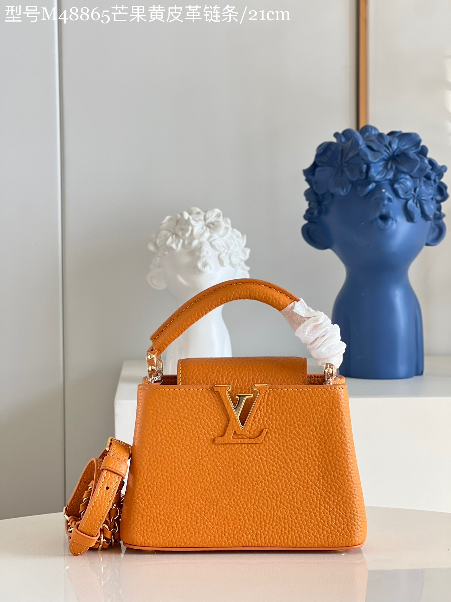 M48865 Mango Yellow Leather Chain Mini Capucines Mini Handbag Imported French calfskin. Shiny metal accessories. Unique Capucines cover can be placed inside the bag to display the letter logo, and can be turned out to display the Monogram Flower pattern.Size: 21x14x8 cm
