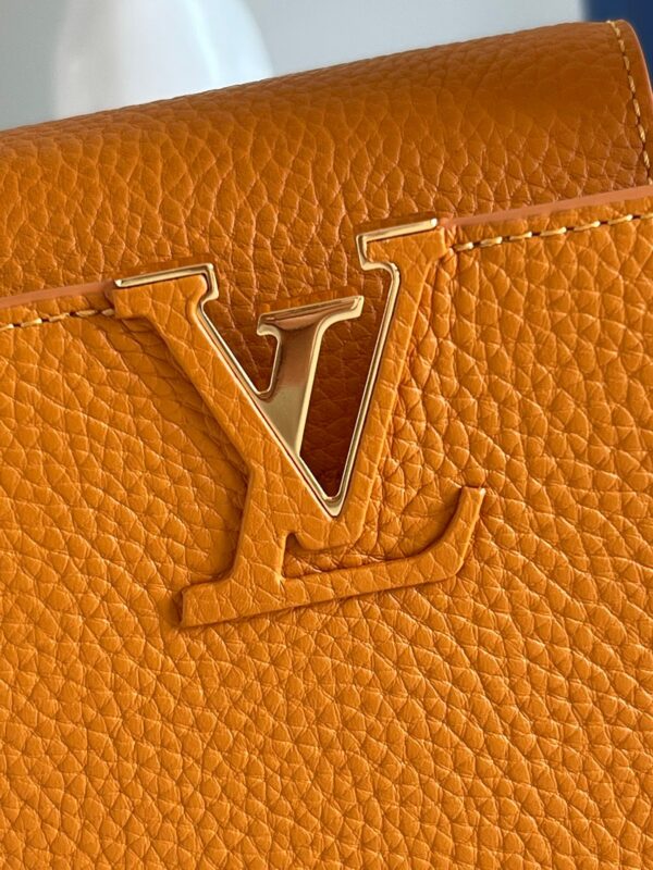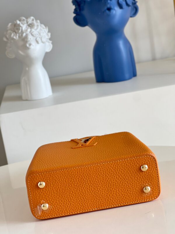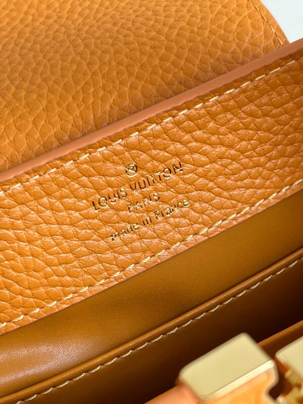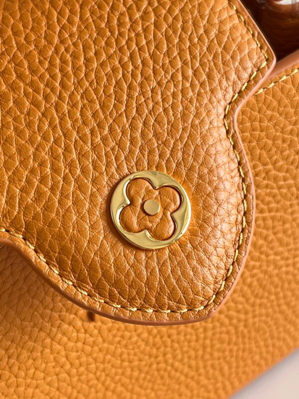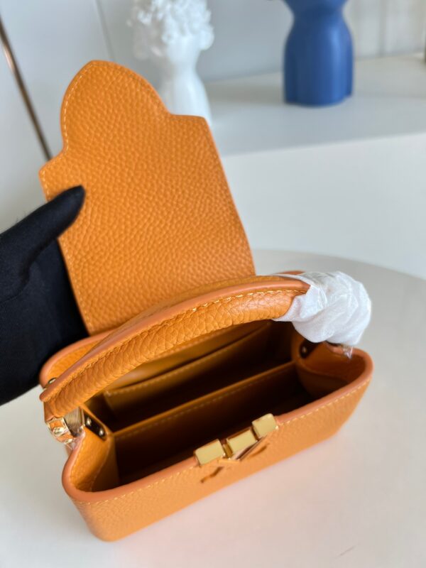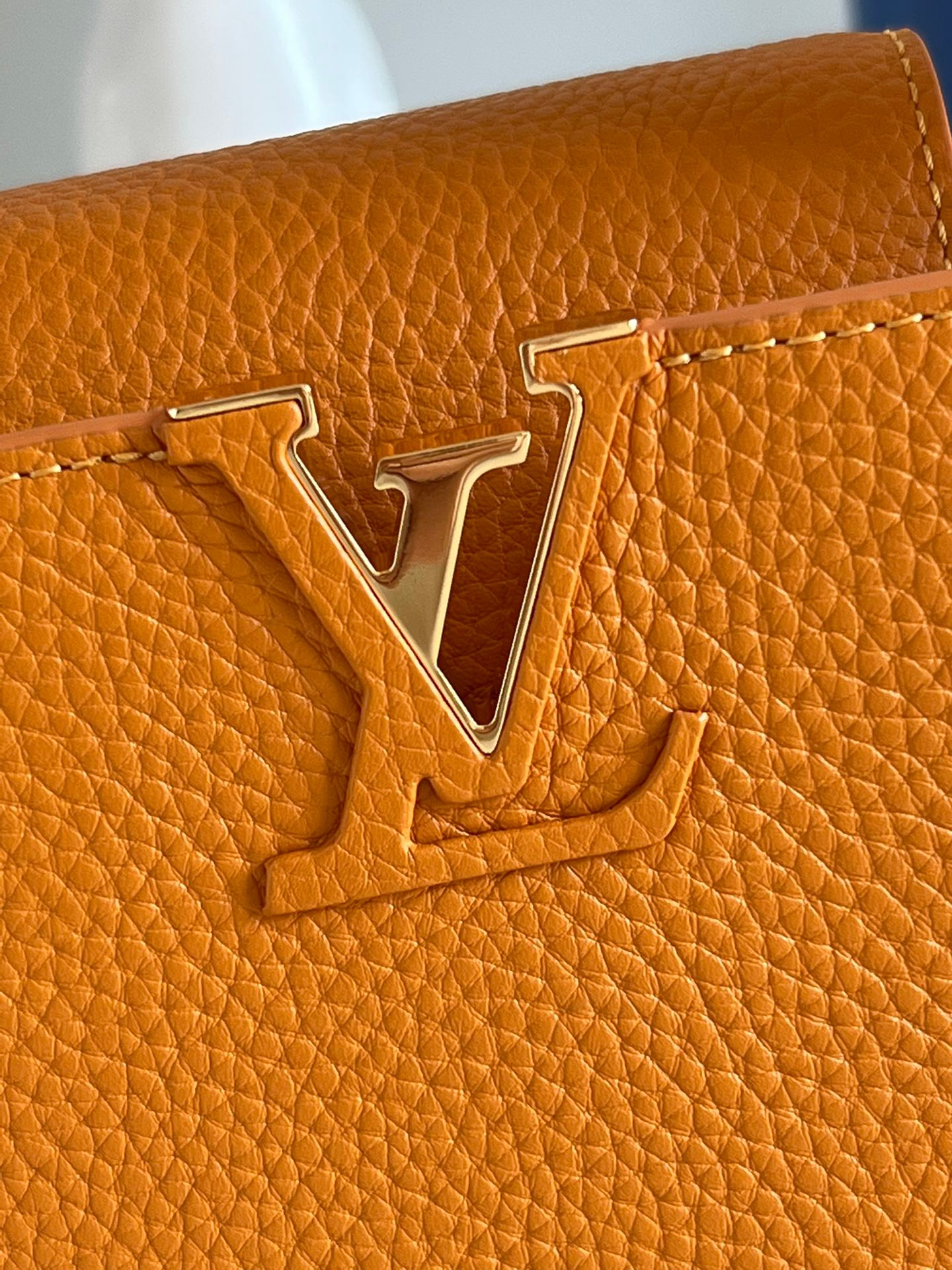 M48865 Mango Yellow Leather Chain Mini Capucines Mini Handbag Imported French calfskin. Shiny metal accessories. Unique Capucines cover can be placed inside the bag to display the letter logo, and can be turned out to display the Monogram Flower pattern.Size: 21x14x8 cm