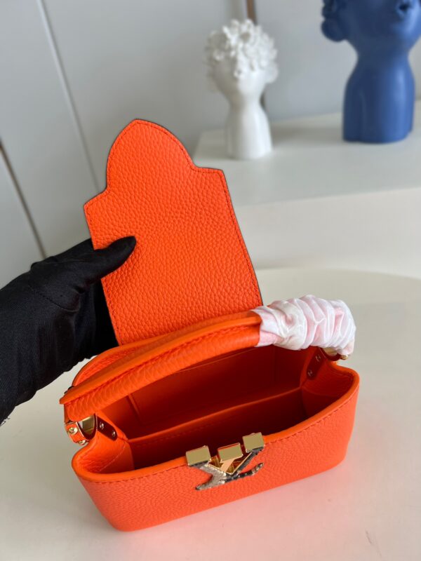 M81210 Orange Snake Pattern MiniCapucines Mini Handbag Imported French calfskin, shiny metal accessories, unique Capucines cover can be put inside the bag to display the letter logo, and can be turned out to present the Monogram Flower pattern.Size: 21x14x8cm