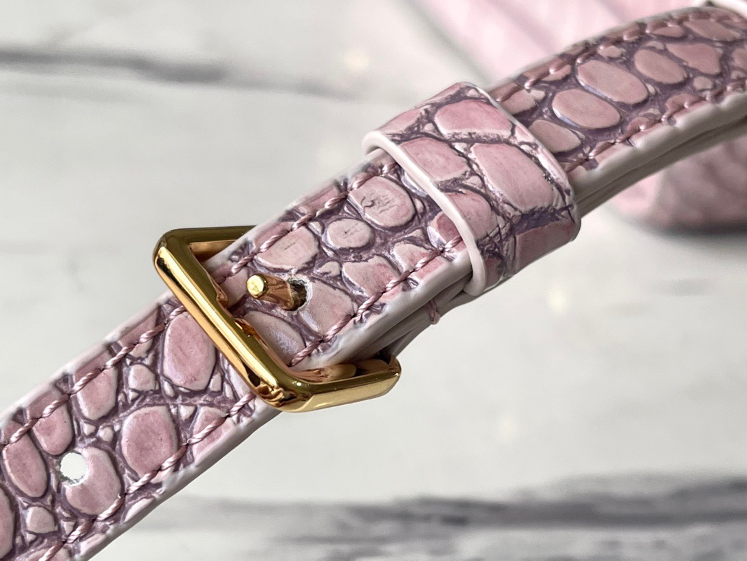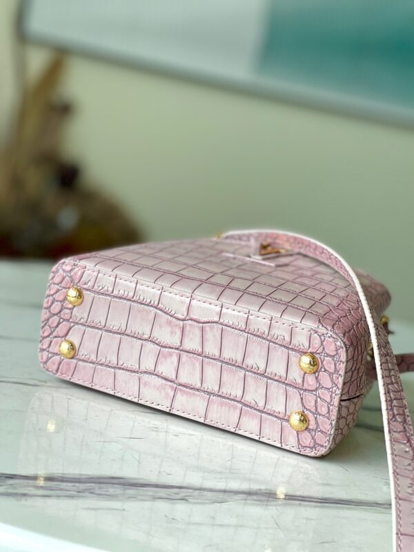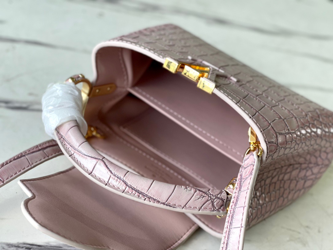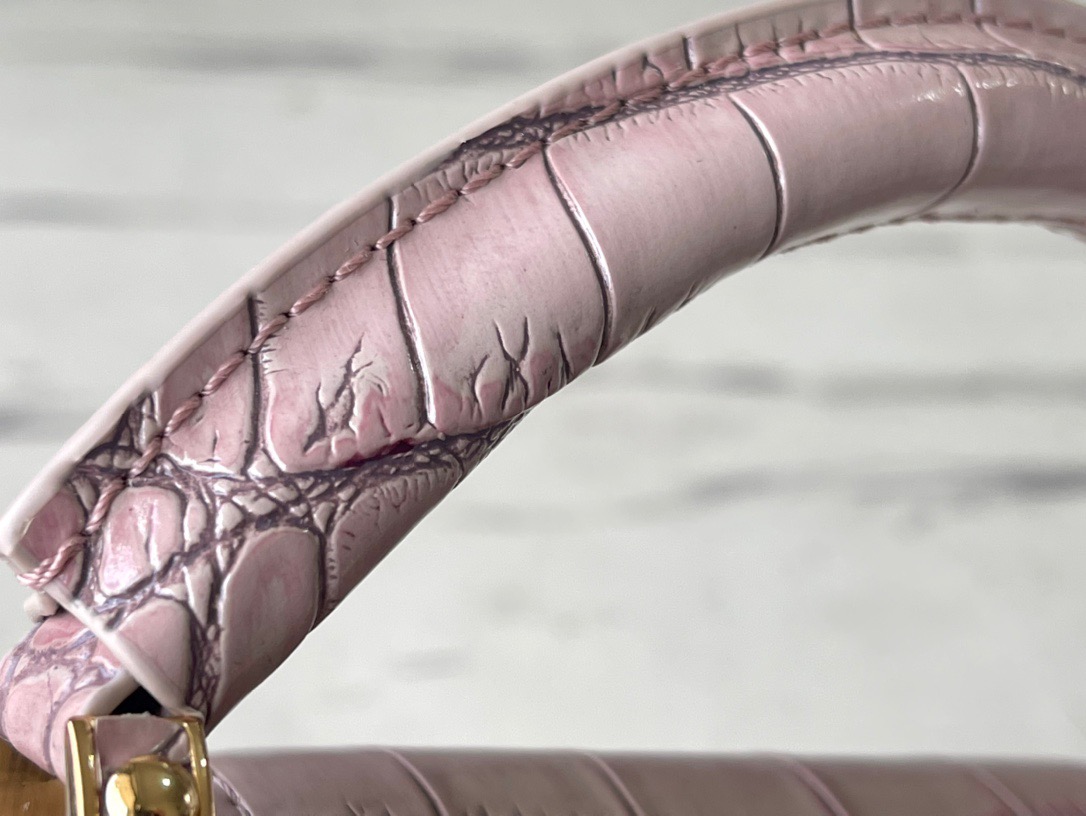 M48865 Vintage Pink Crocodile Pattern Louis Vuitton Capucines Mini Handbag This precious Capucines mini handbag is made of crocodile leather with high-gloss treatment, which is attractive and luxurious goatskin lining and shiny metal accessories. Unique Capucines flap can be stored in the bag. Displays the letter logo and can be turned inside out to present the Monogram Flower pattern. Dimension: 21x14x8cm