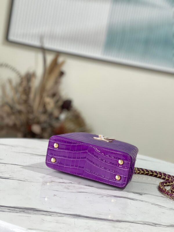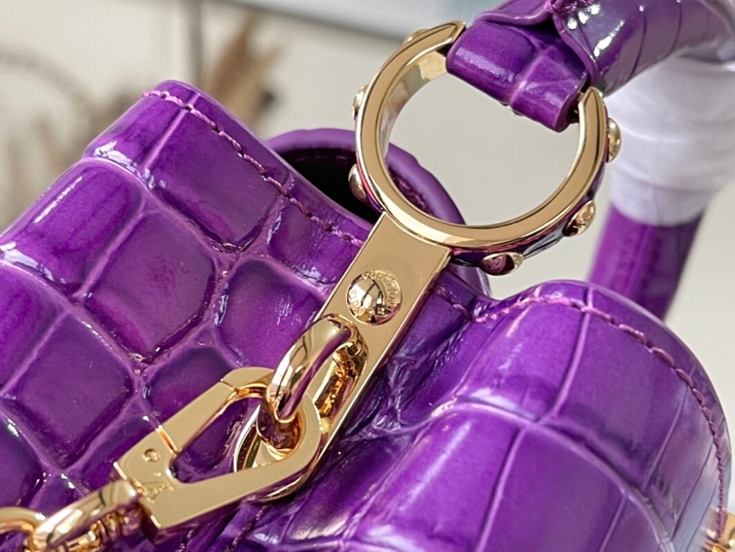 M48865 Purple Crocodile Mother-of-pearl Chain Item/ Mini Capucines BB handbag is made of rare leather to declare the modern atmosphere. Its crocodile leather braided chain can be removed at will, allowing the shoulder and crossbody to be switched freely. Dimensions: 21x14x8cm