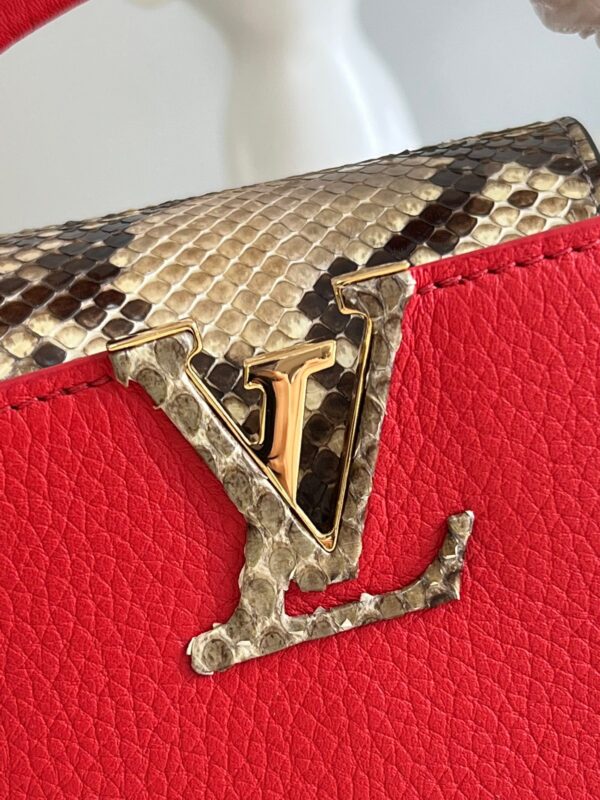 M81210 Red Snake Pattern Mini Capucines Mini Handbag Imported French calfskin, shiny metal accessories, unique Capucines cover can be put inside the bag to display the letter logo, and can be turned inside out to show the Monogram Flower pattern.Size: 21x14x8cm
