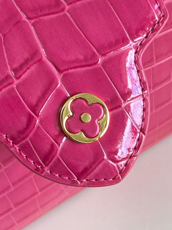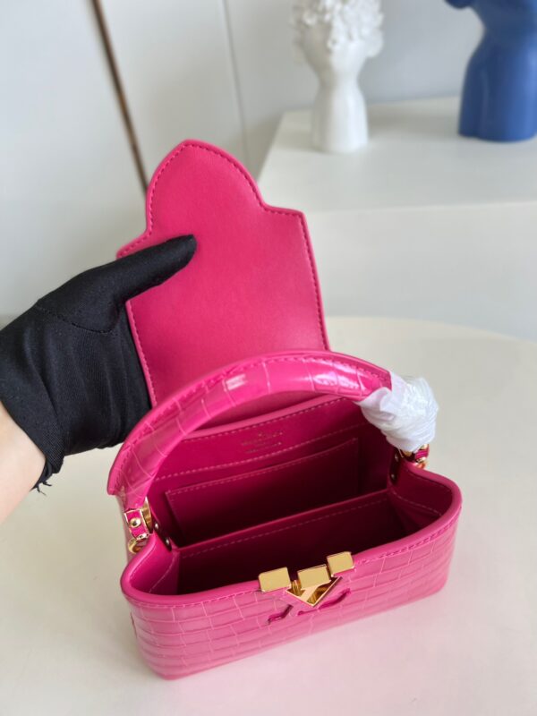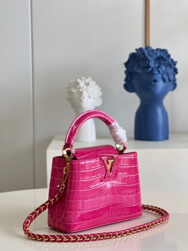M48865 Rose Red Crocodile Chain Mini Capucines Mini Handbag Imported French calfskin. Shiny metal accessories. The unique Capucines cover can be placed inside the bag to display the letter logo, and can be turned out to present the Monogram Flower pattern.Size: 21x14x8cm