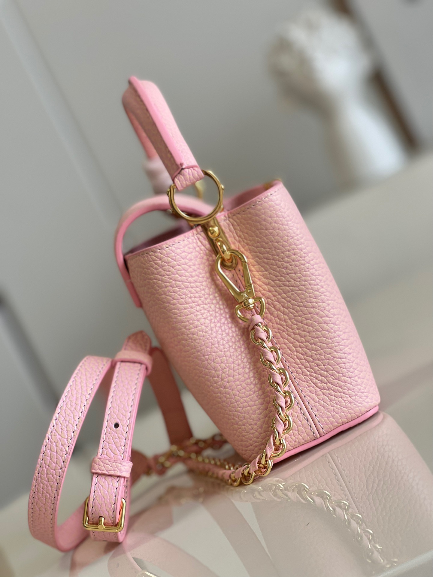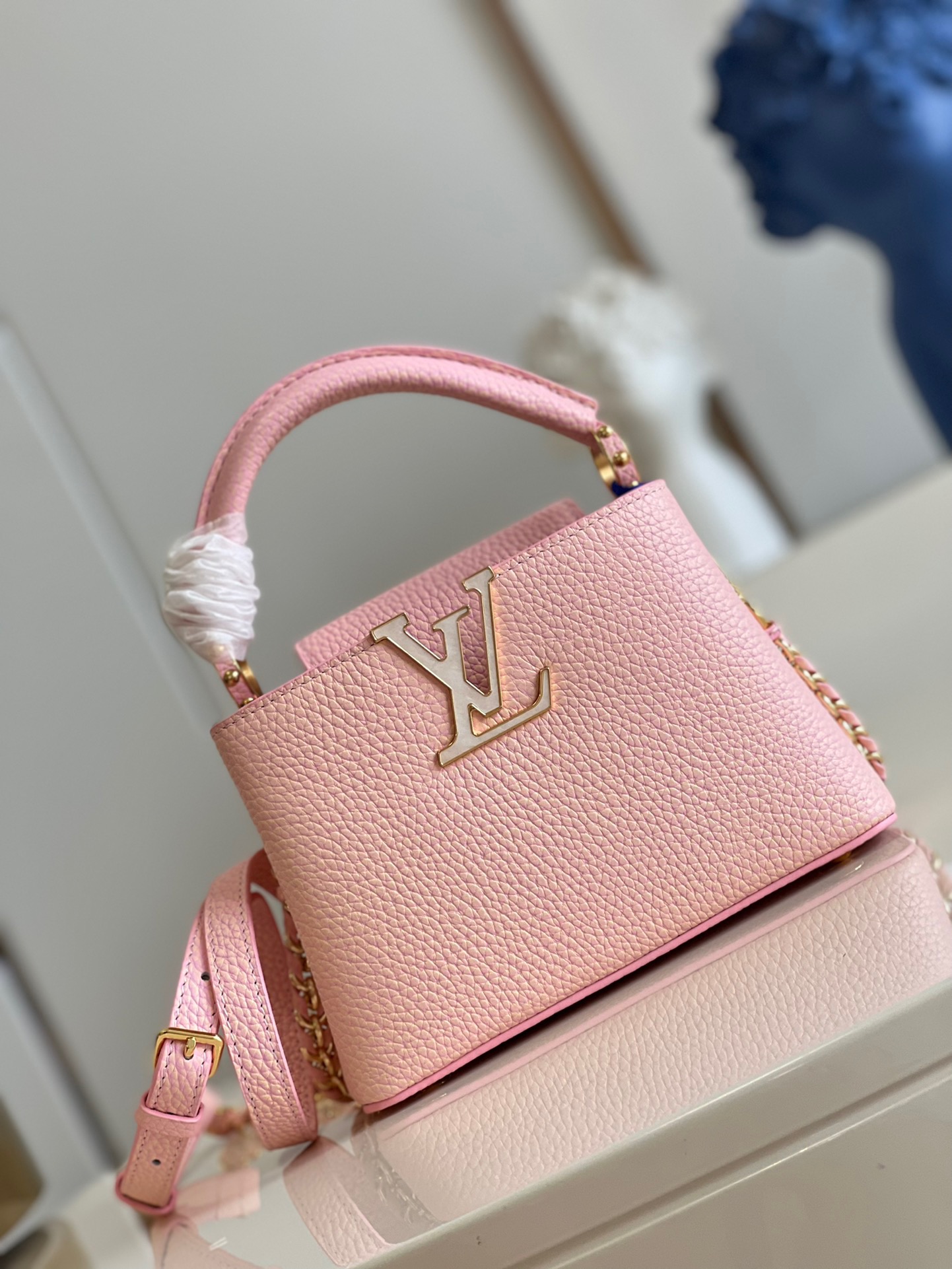M59850 Stardust Pearl Pink MiniCapucines new color star pearl pearl shell buckle is so beautiful, worthy of being a biological daughter, the best and latest will have. This Capucines mini handbag is shining with the subtle luster of Taurillon leather. It complements the shell-like look of the house’s letters and is finished with a woven leather chain. Size: 21×14×8cm