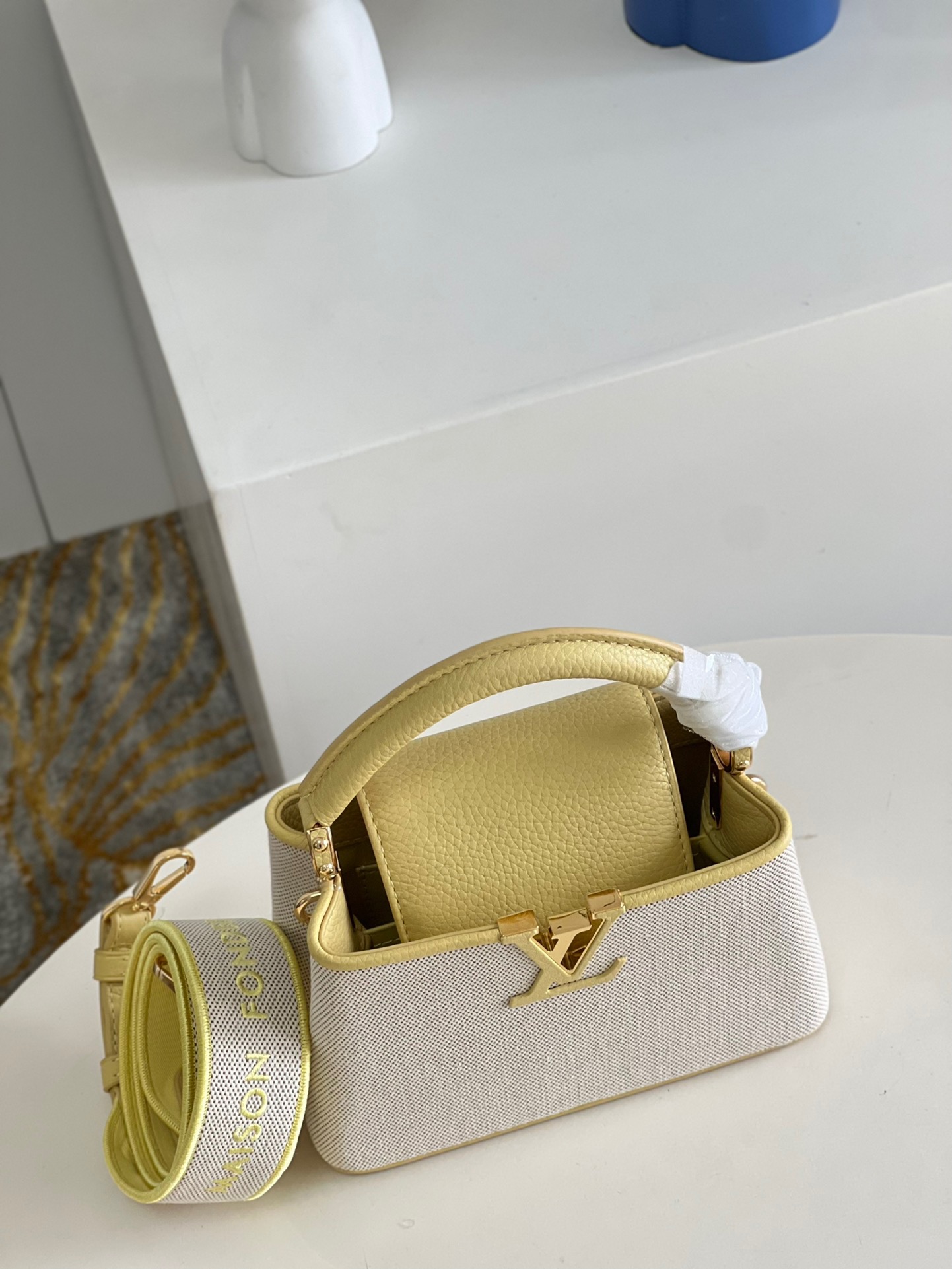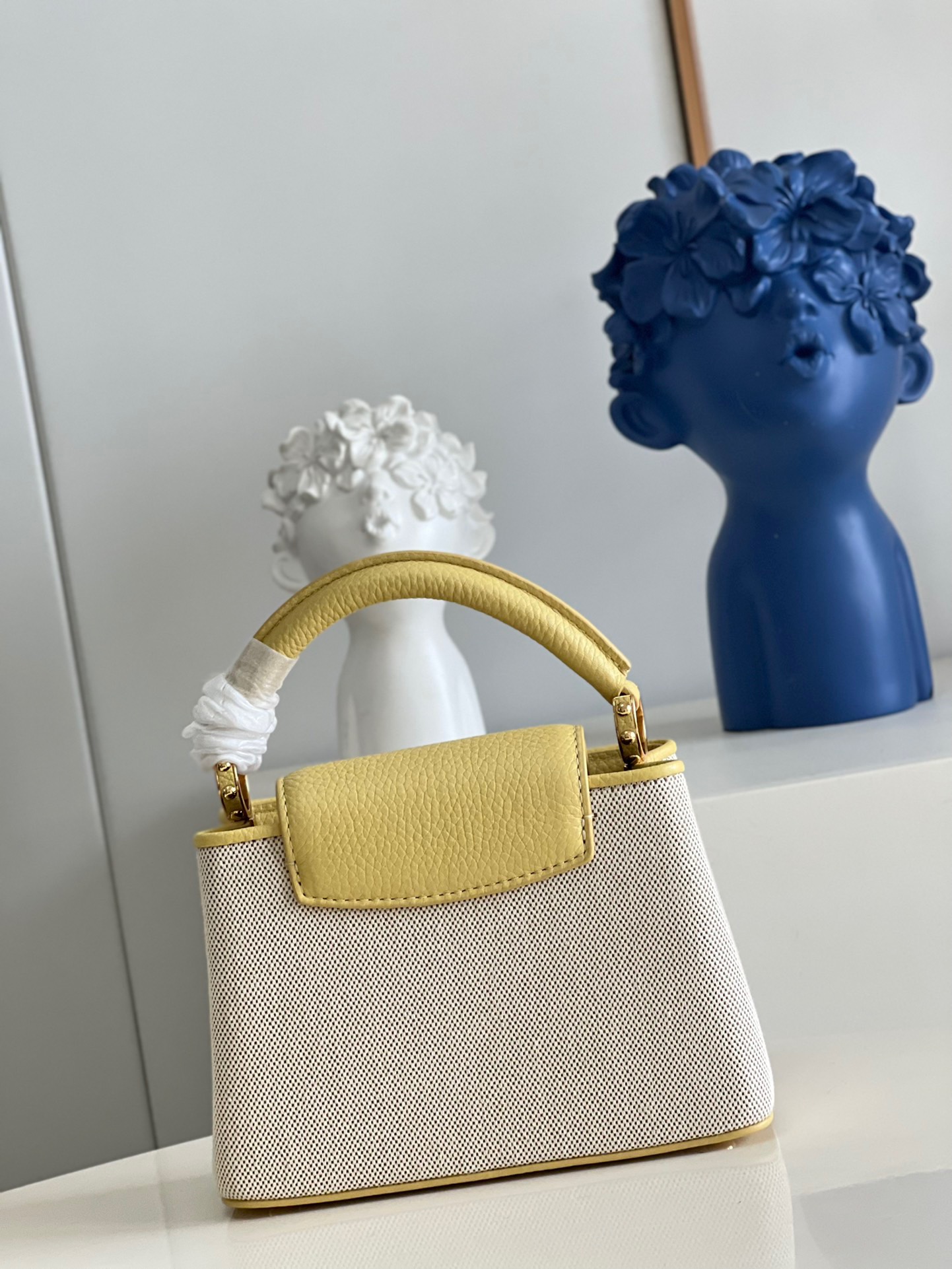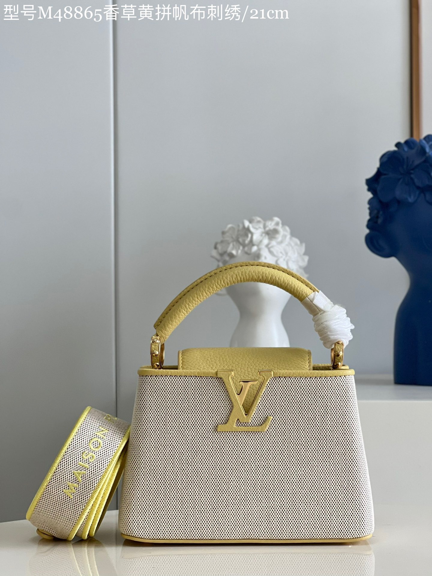 M48865 Vanilla Yellow Canvas Embroidery MiniCapucines Mini Handbag Imported French calfskin. Shiny metal accessories. The unique Capucines cover can be placed inside the bag to display the letter logo, and can be turned out to present the Monogram Flower pattern.Size: 21x14x8cm