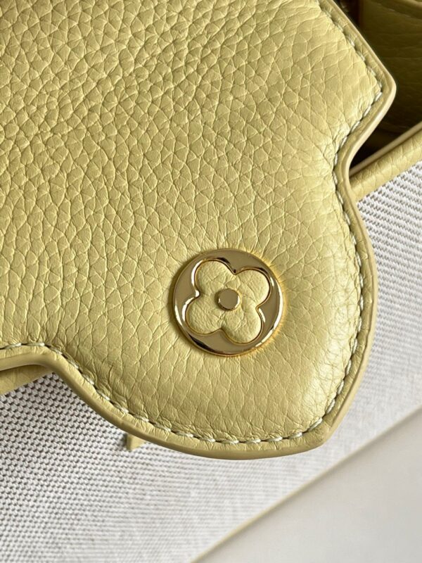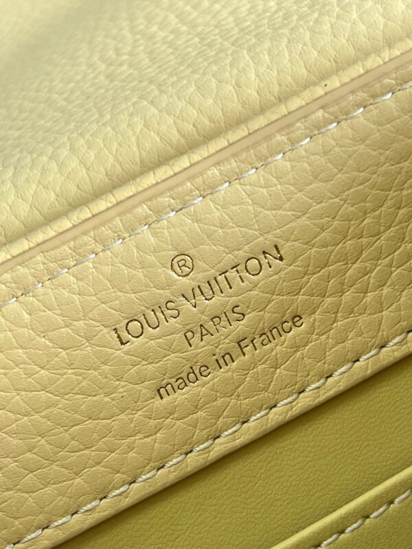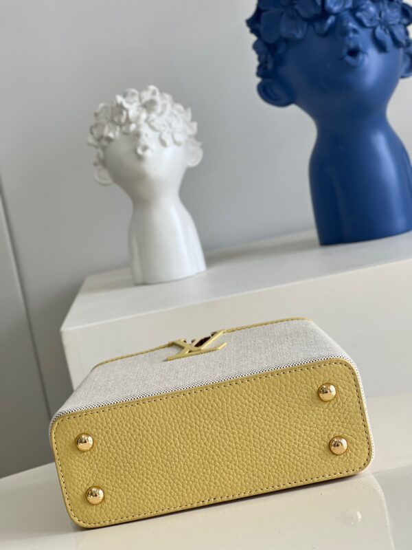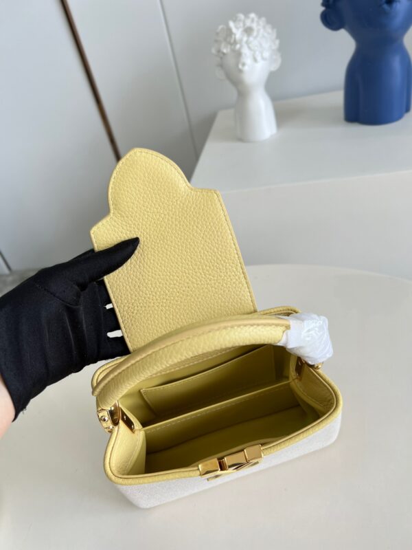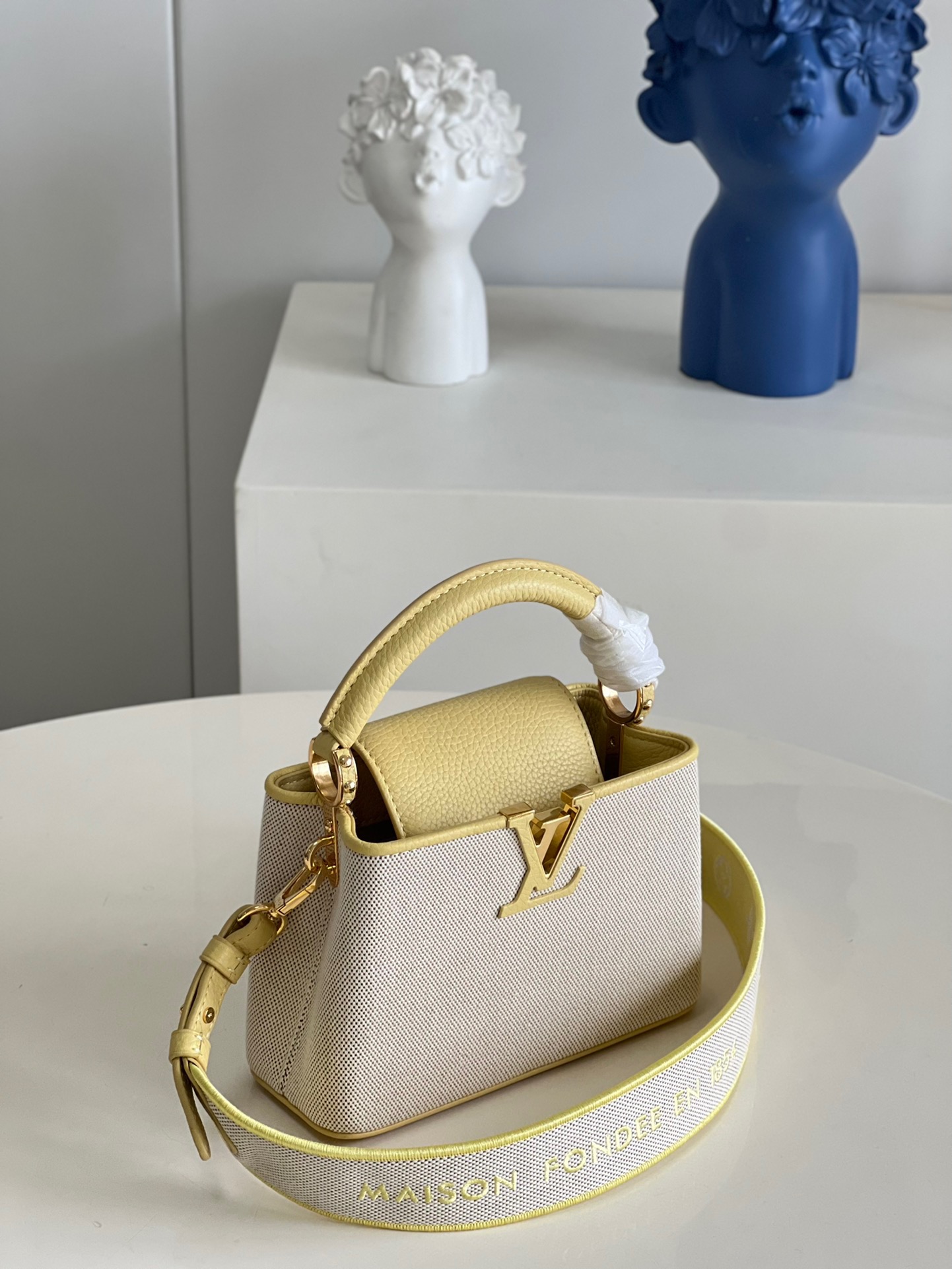 M48865 Vanilla Yellow Canvas Embroidery MiniCapucines Mini Handbag Imported French calfskin. Shiny metal accessories. The unique Capucines cover can be placed inside the bag to display the letter logo, and can be turned out to present the Monogram Flower pattern.Size: 21x14x8cm