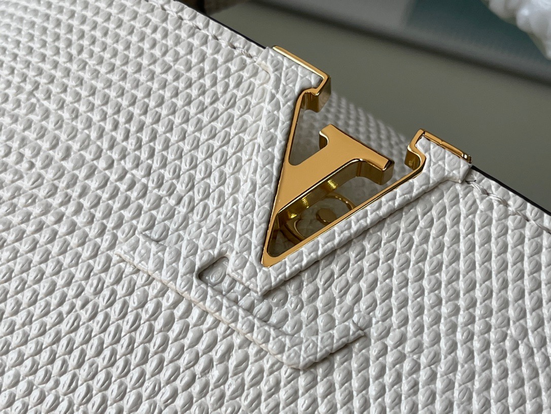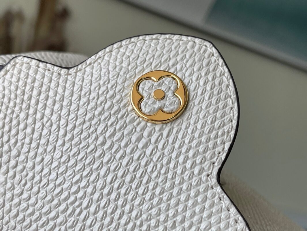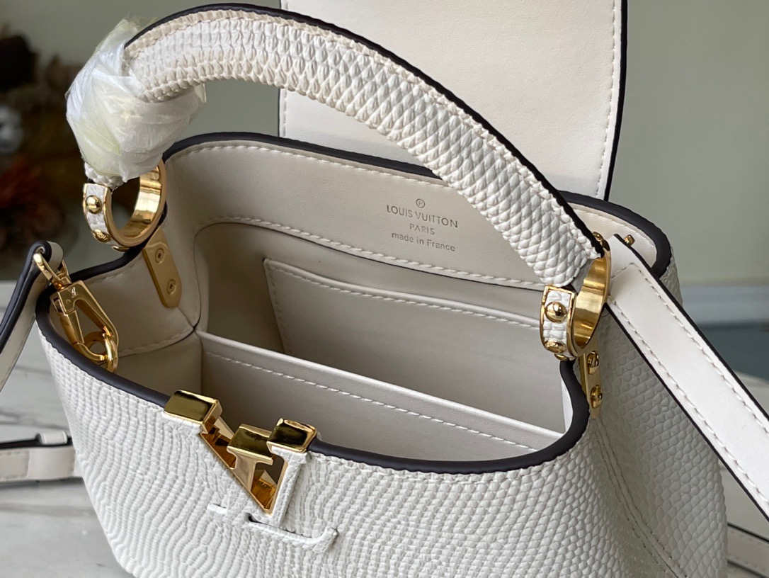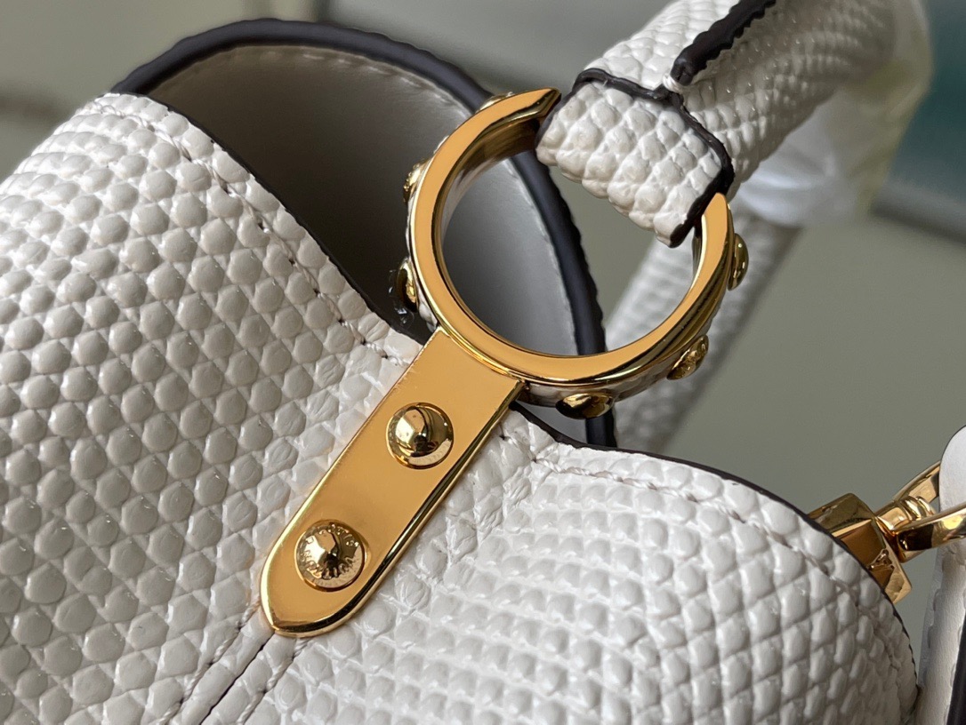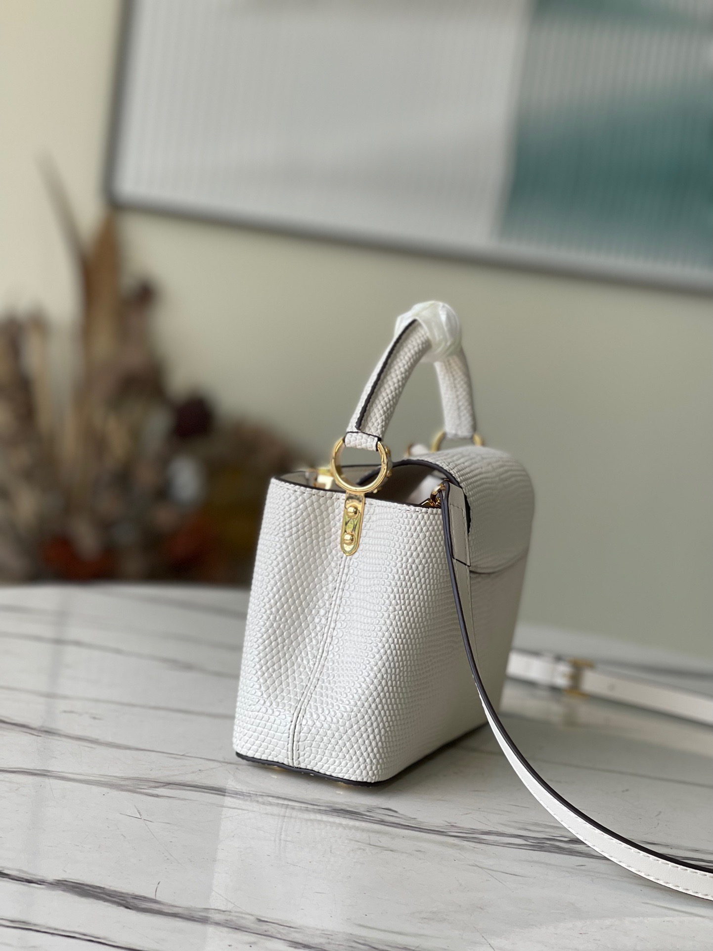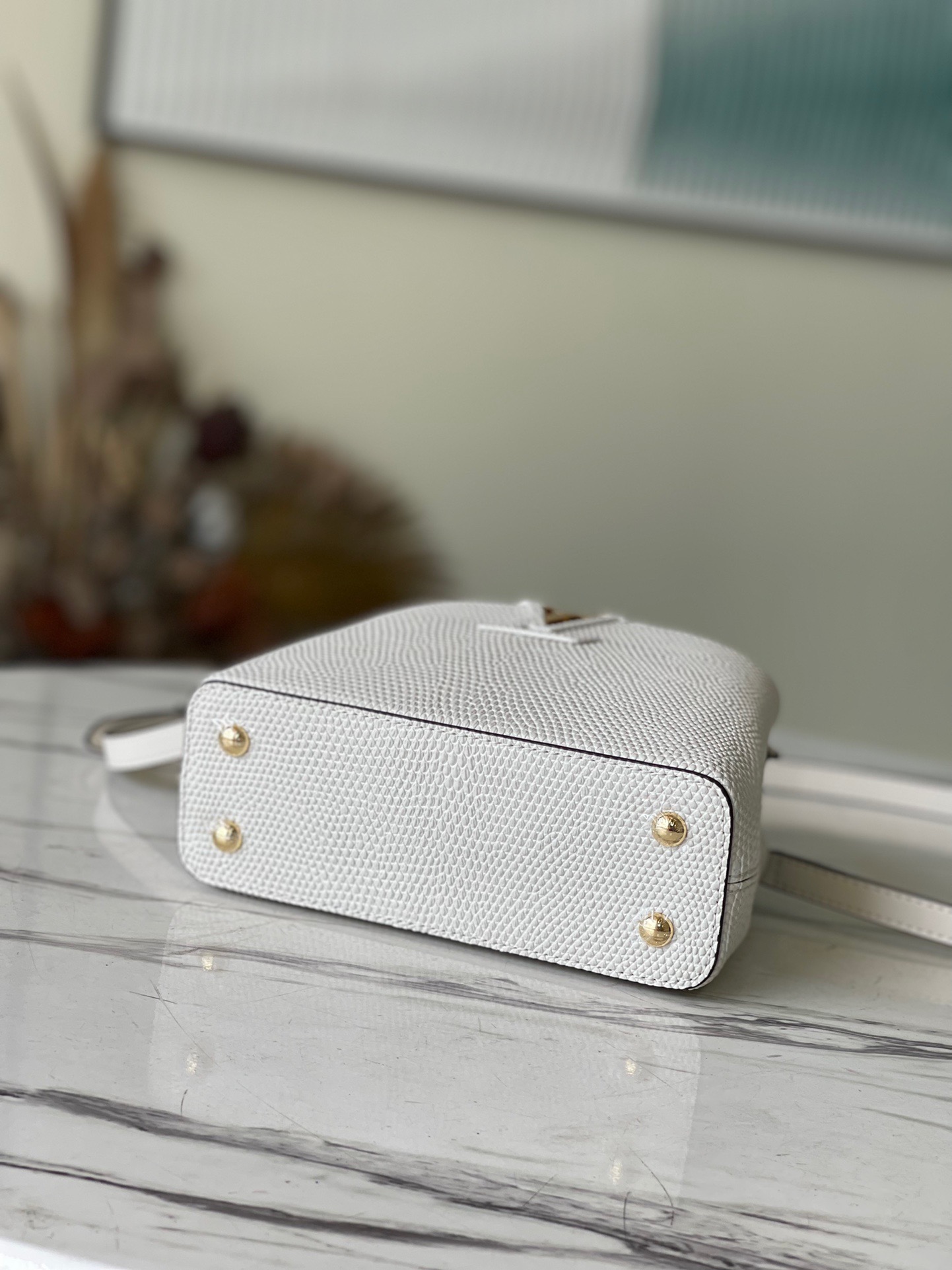Top original single M48865 White Lizard Mini Capucines Handbag delicately blends graceful lizard skin outer layer, delicate sheepskin inner lining and lustrous metal parts, the iconic flip achieves two styles of fashion: the inner is for reading the logo, and the outer is for Monogram flowers blooming, for evening. The occasion lights up the eye-catching corner. Size: 21x14x8cm
