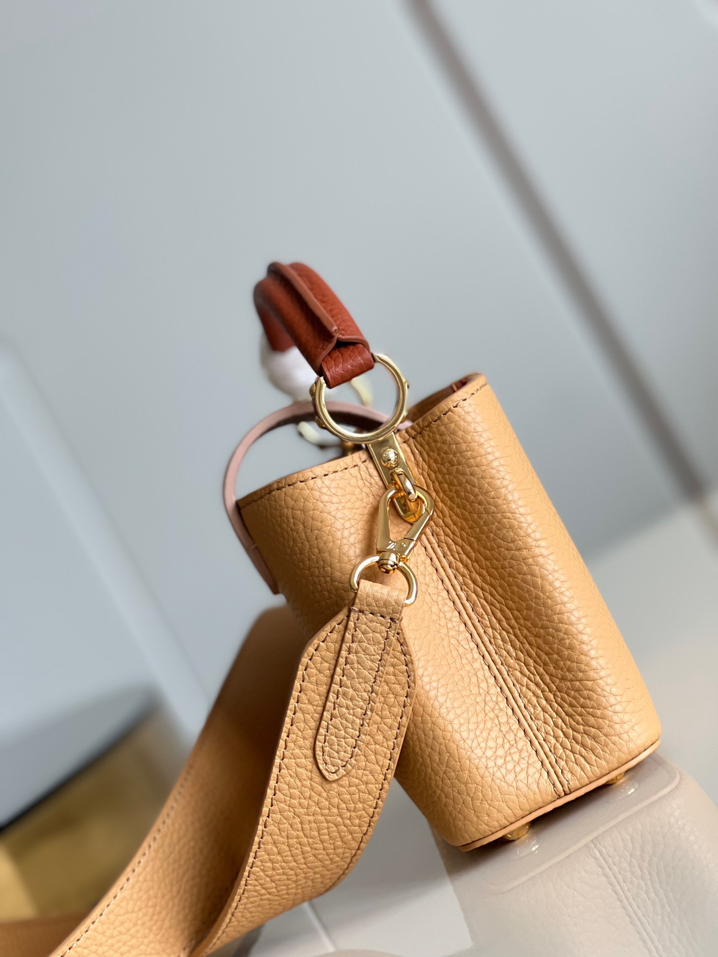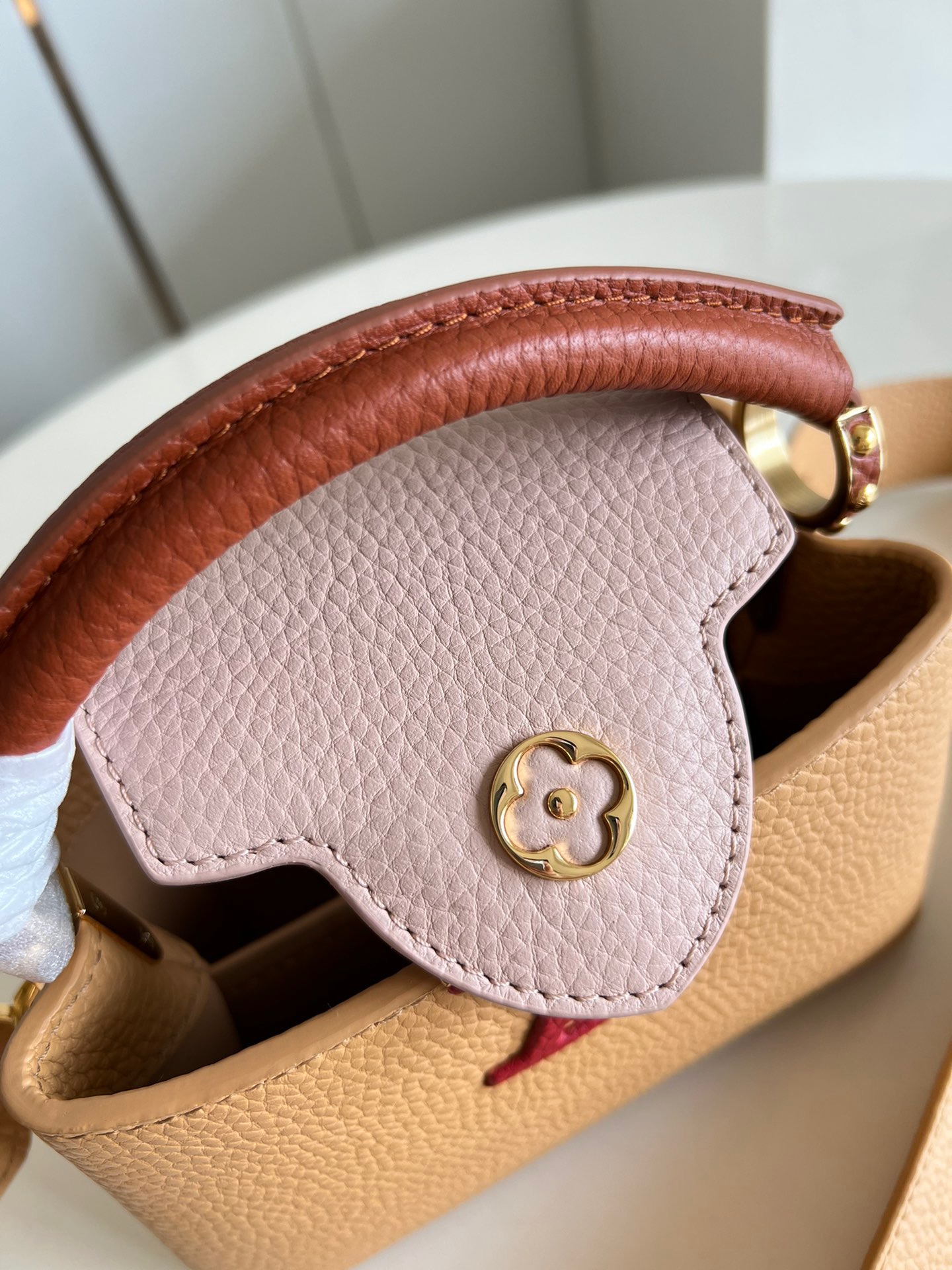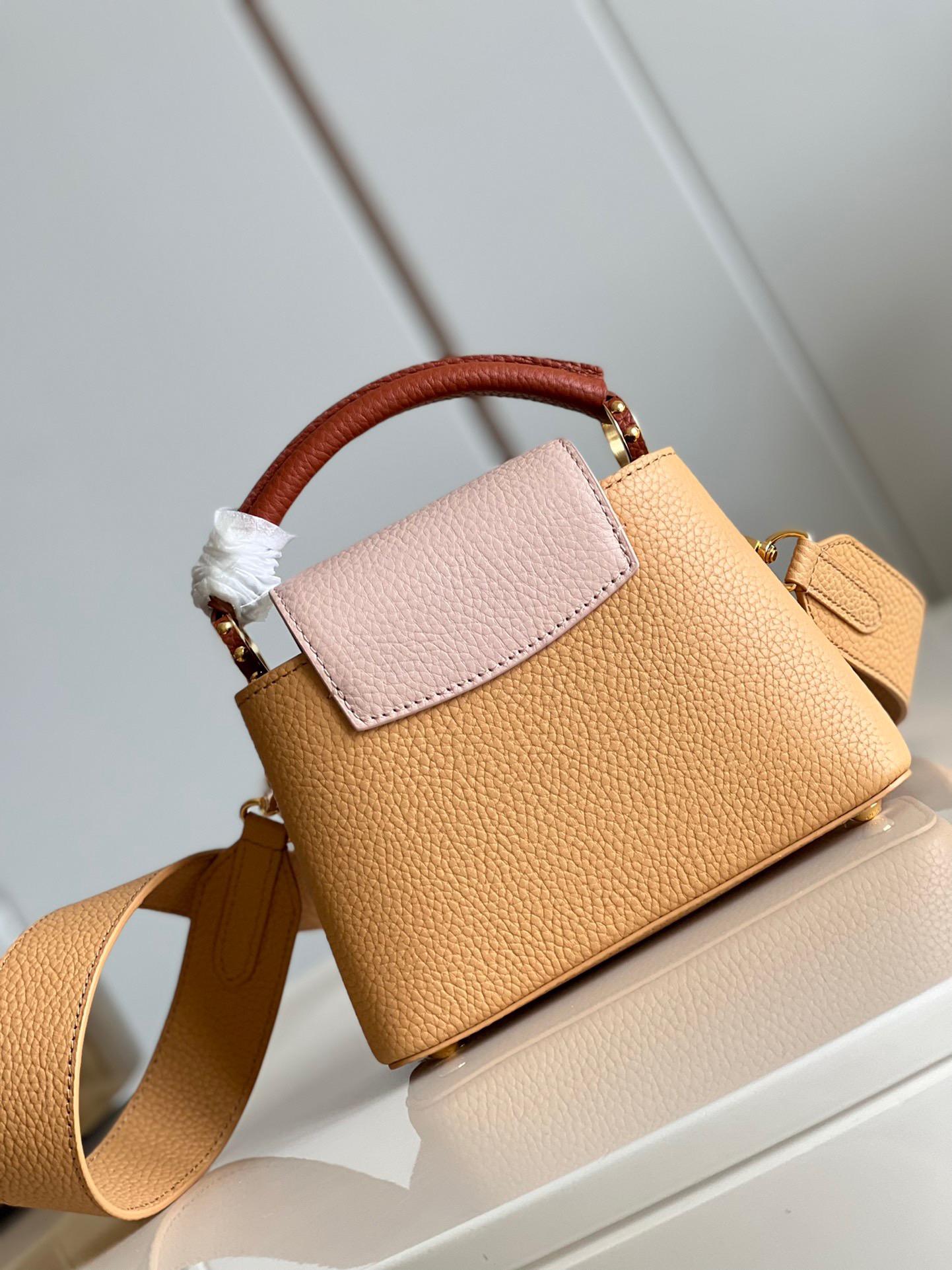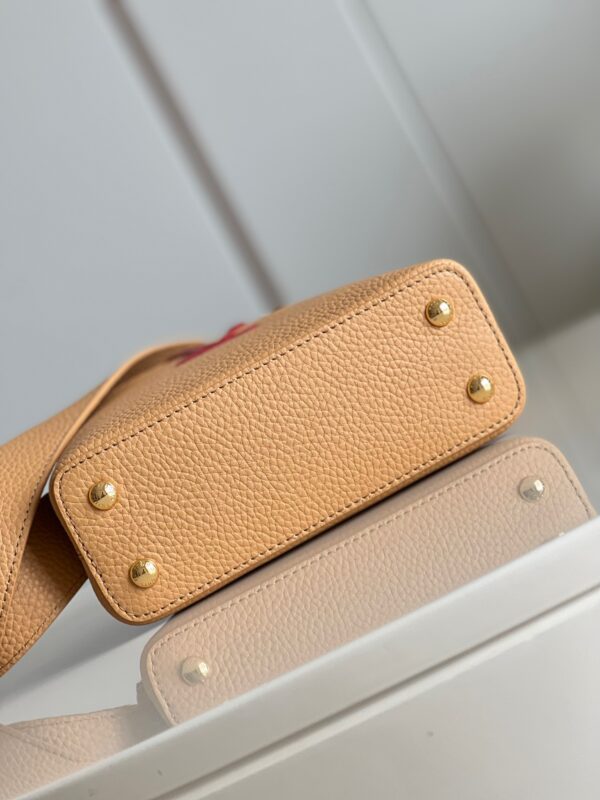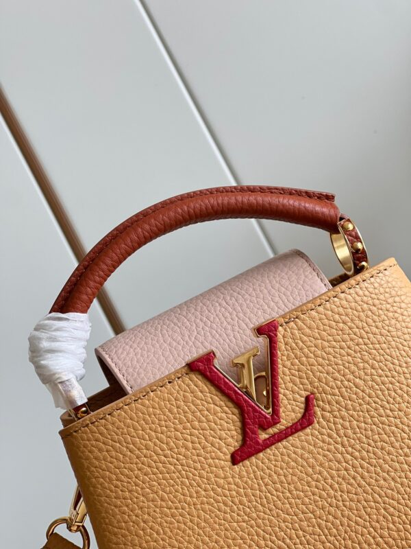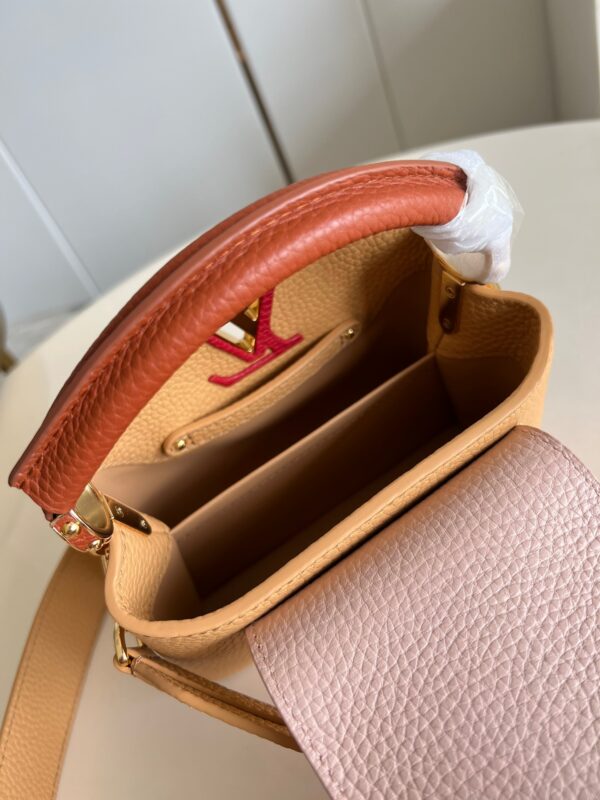 M20748 Brown and Yellow Mini Louis Vuitton Capucines Mini Handbag Imported French calfskin. Shiny metal accessories. The unique Capucines cover can be placed inside the bag to display the letter logo, and can also be turned out to present the Monogram Flower pattern.Dimensions: 21cmx 14cmx 8 cm