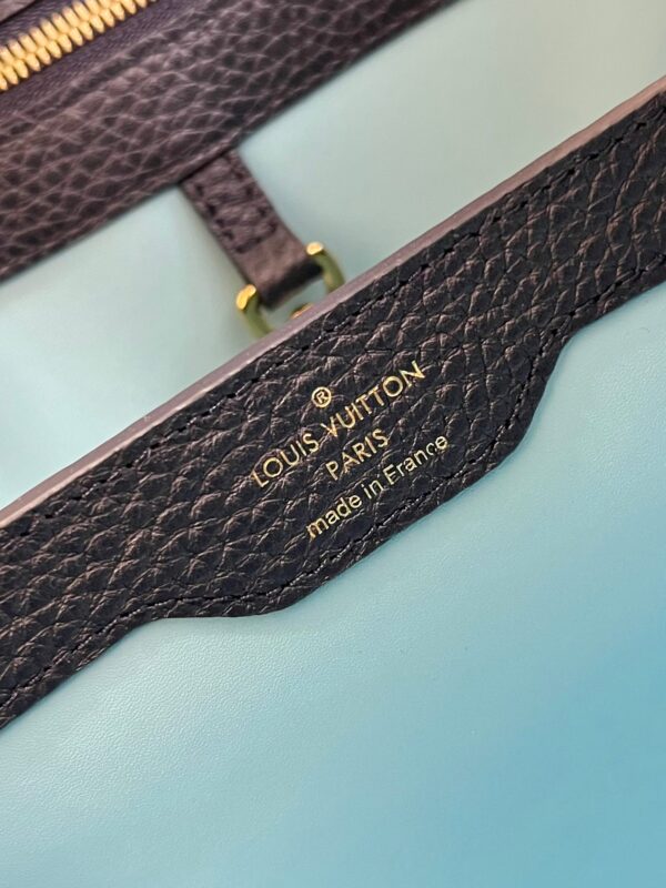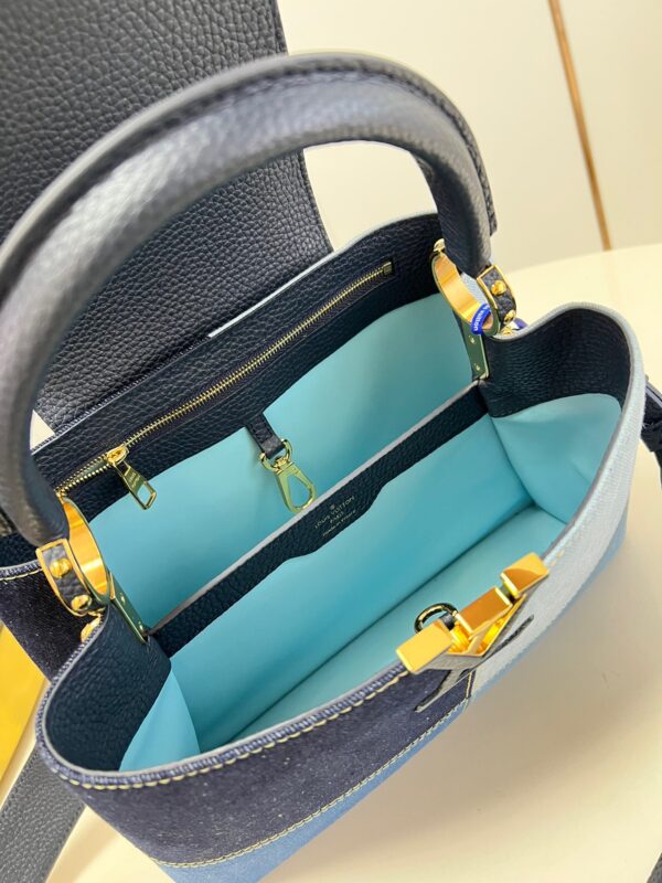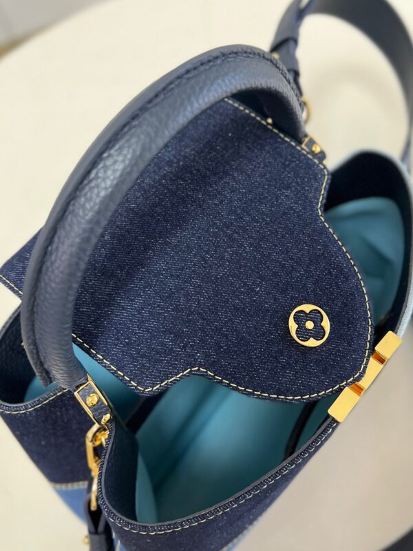M59430 Denim The Capucines MM is a modern take on the classic Capucines collection with bright stitching and assorted denim. The wide denim shoulder strap provides a comfortable carrying experience, and the words “4, Rue des Capucine” mark the location of Louis Vuitton’s first store. Detailed features 31.5 x 20 x 11 cm (length x height x width)