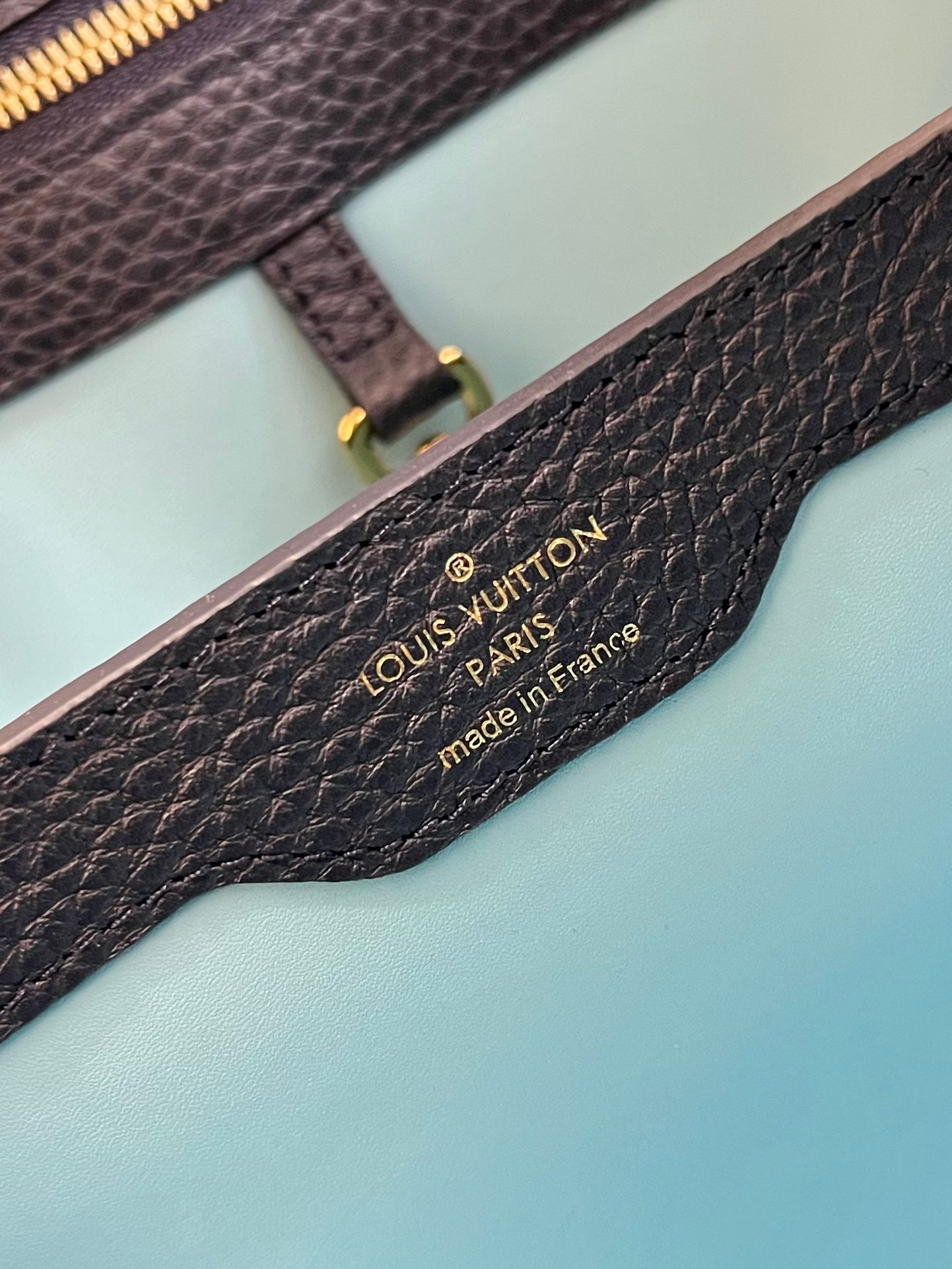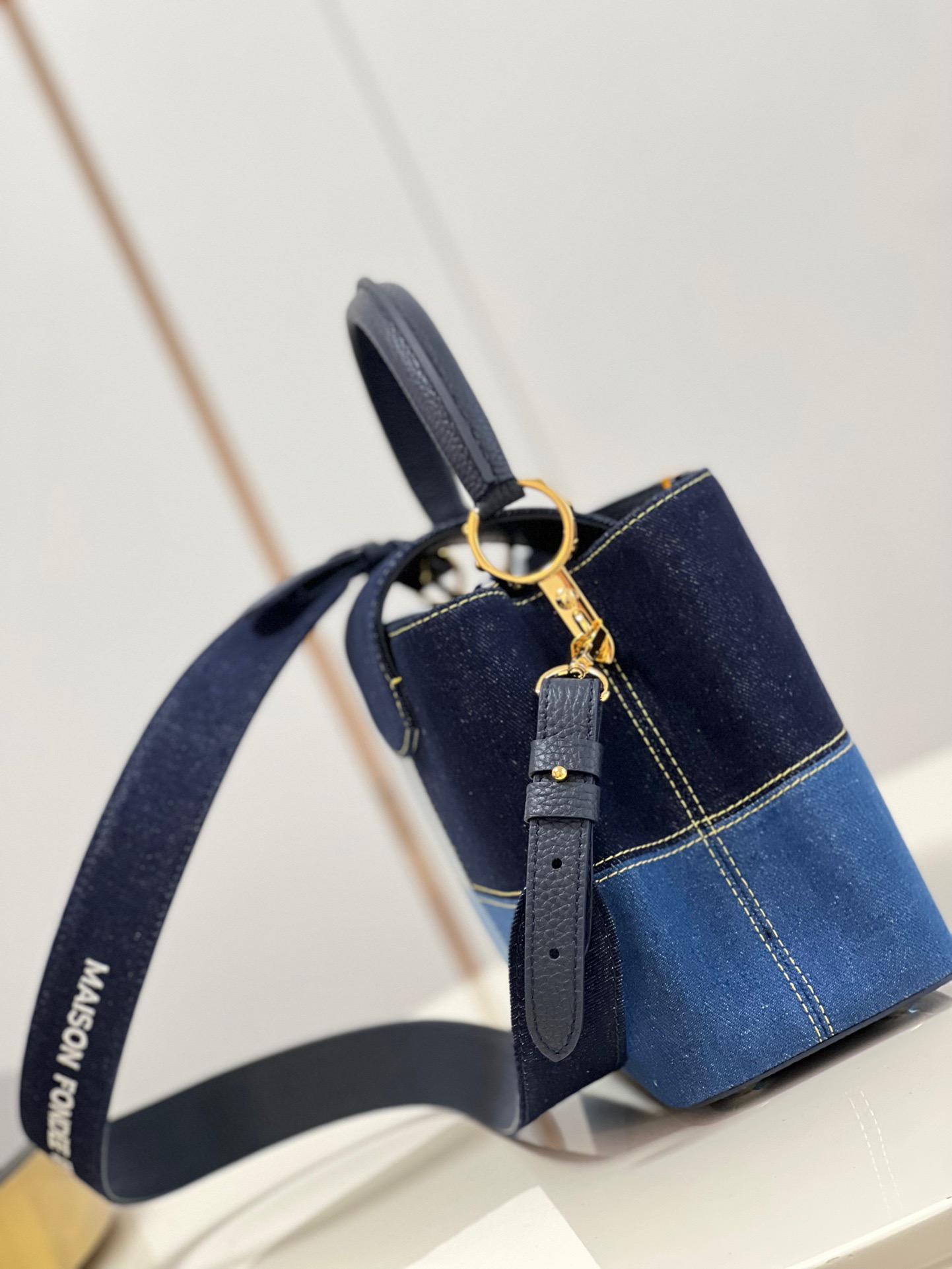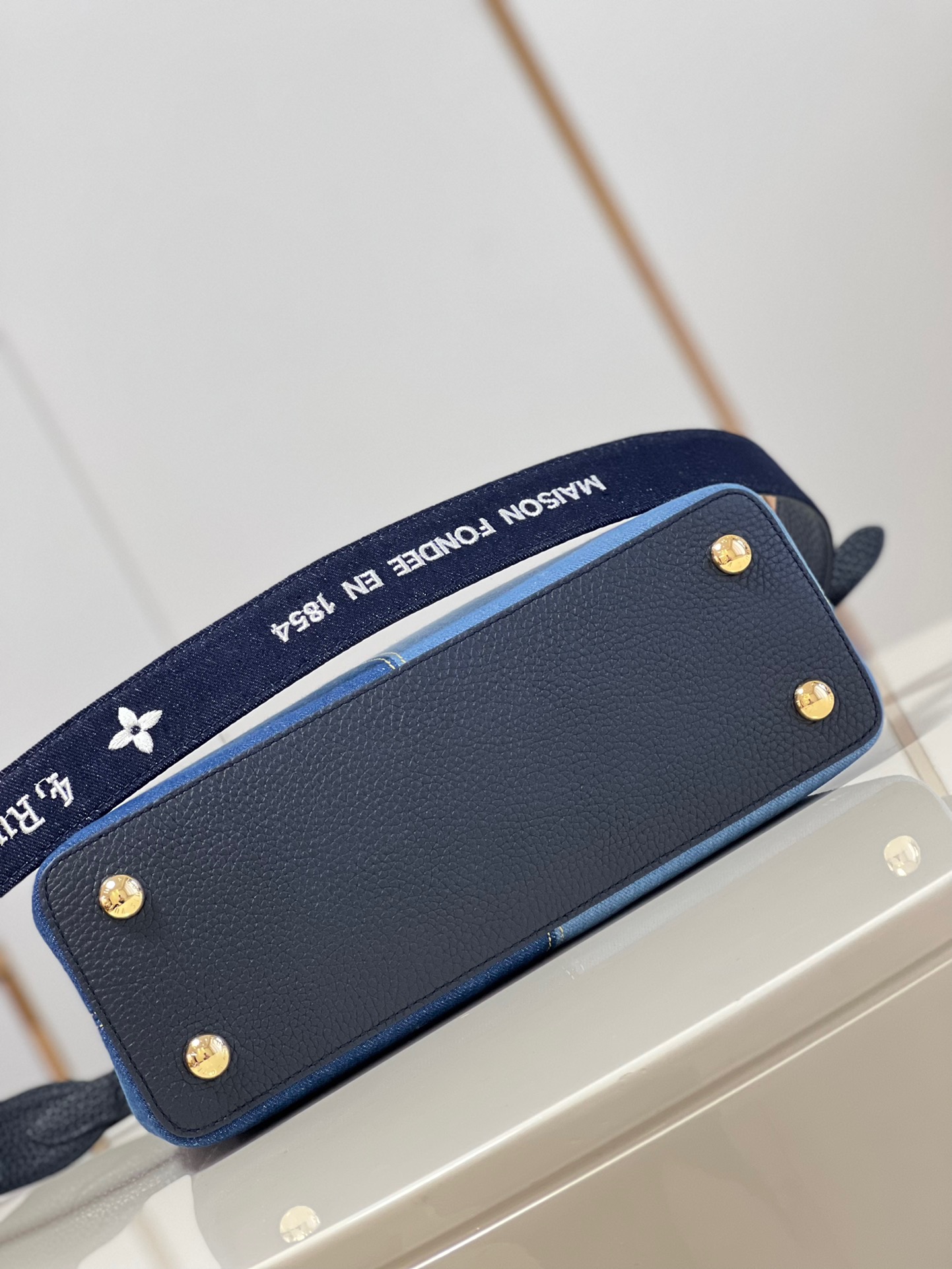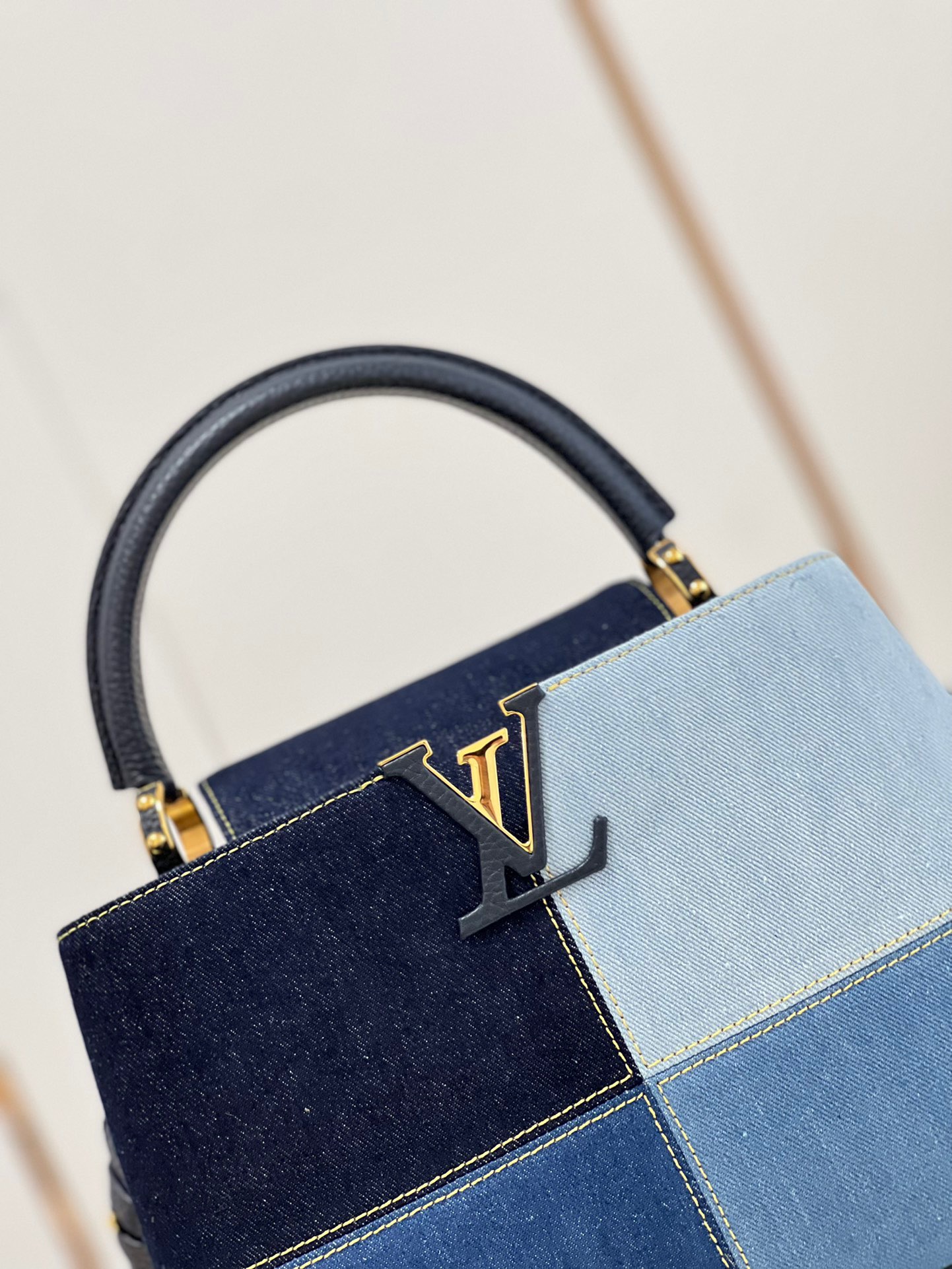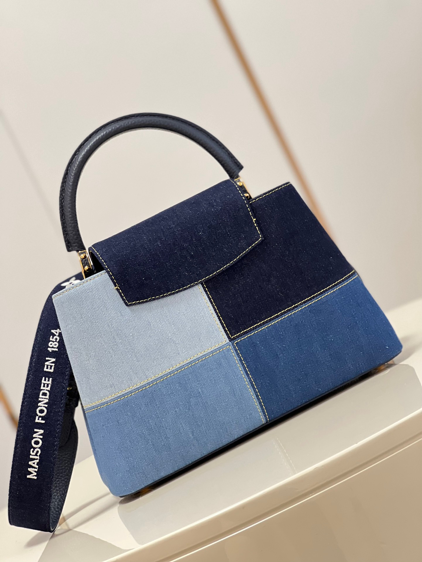 M59430 Denim The Capucines MM is a modern take on the classic Capucines collection with bright stitching and assorted denim. The wide denim shoulder strap provides a comfortable carrying experience, and the words “4, Rue des Capucine” mark the location of Louis Vuitton’s first store. Detailed features 31.5 x 20 x 11 cm (length x height x width)