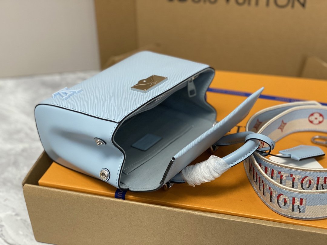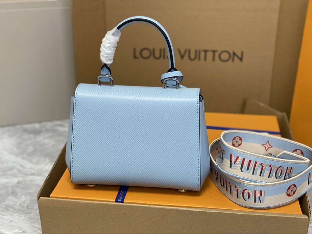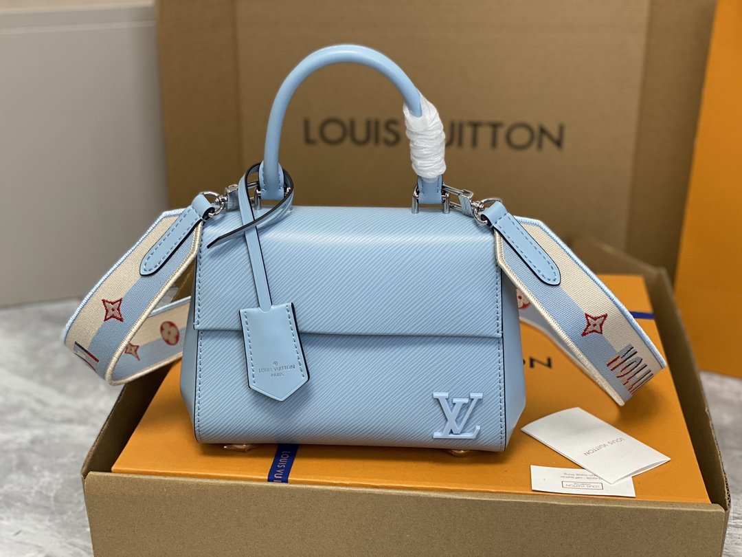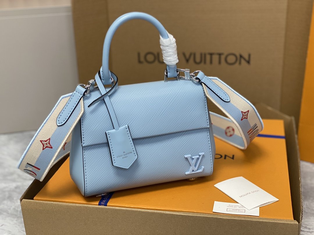 water ripple series CLUNY MINI handbag This Cluny mini handbag shows two styles of detachable jacquard shoulder straps: the Louis Vuitton logo declares the brand identity, and the Monogram flower quietly blooms when turned over. Epi leather body with LV signature in silky resin. Detachable straps add formality. Dimensions: 20.0 x 16.0 x 7.5 cm