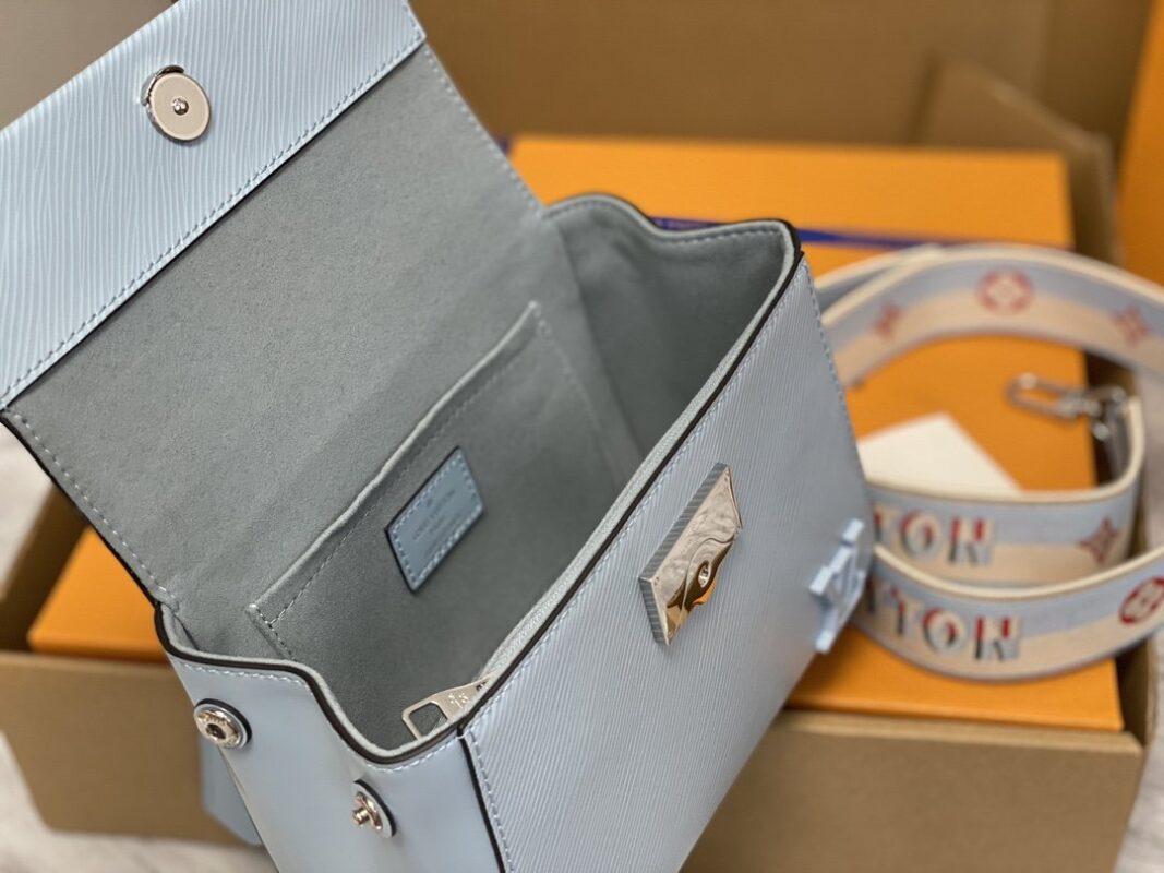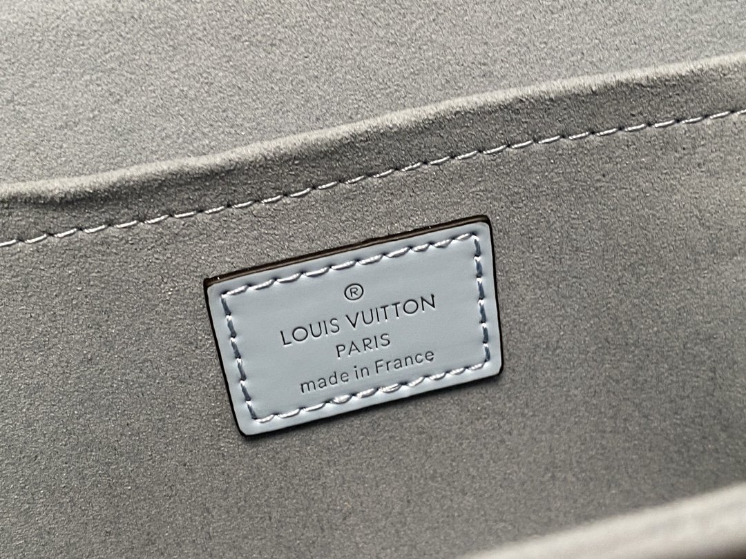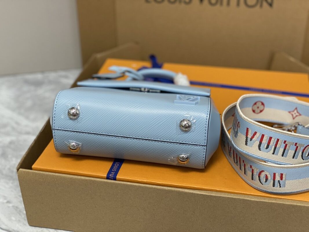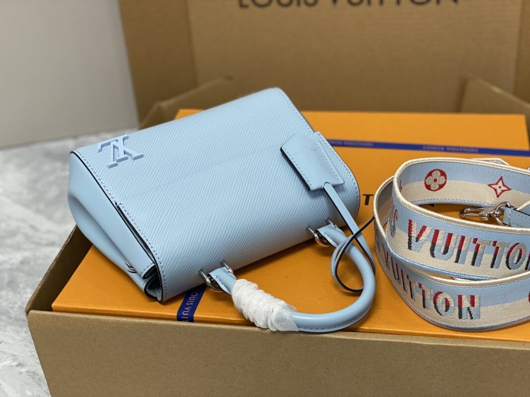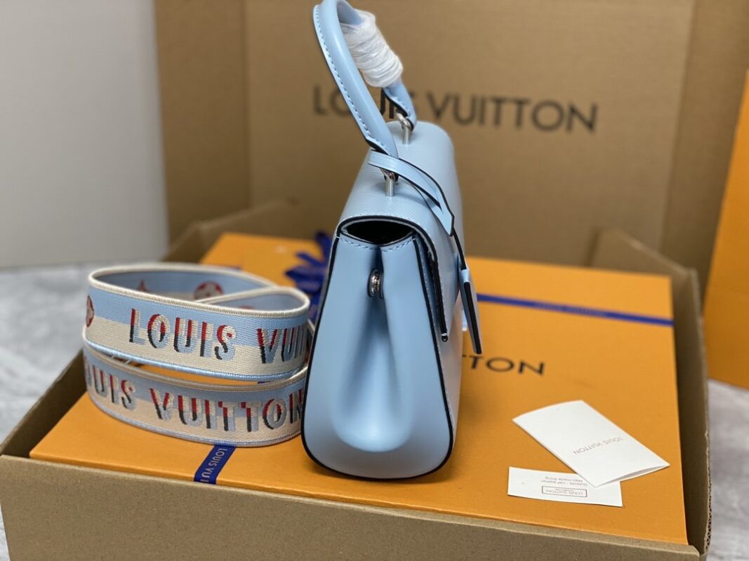 water ripple series CLUNY MINI handbag This Cluny mini handbag shows two styles of detachable jacquard shoulder straps: the Louis Vuitton logo declares the brand identity, and the Monogram flower quietly blooms when turned over. Epi leather body with LV signature in silky resin. Detachable straps add formality. Dimensions: 20.0 x 16.0 x 7.5 cm