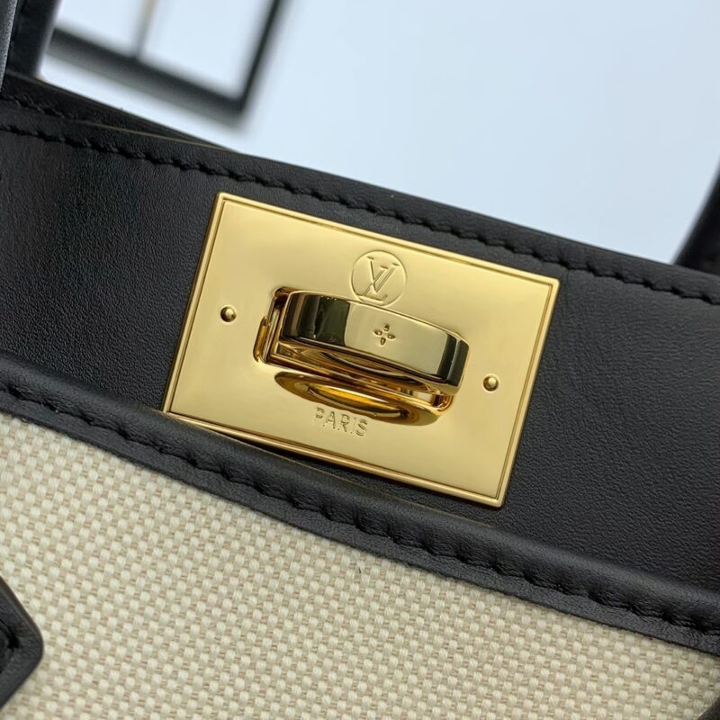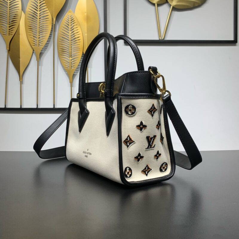 The small bag is structured in crisp canvas, then smooth leather for the top rim and rolled handles. The Monogram floral tufted sides reveal a classic look, the detachable shoulder strap allows for a comfortable cross-body experience, and the outer pocket is easy to access when you need it. 25 x 20 x 12 cm (length x height x width)