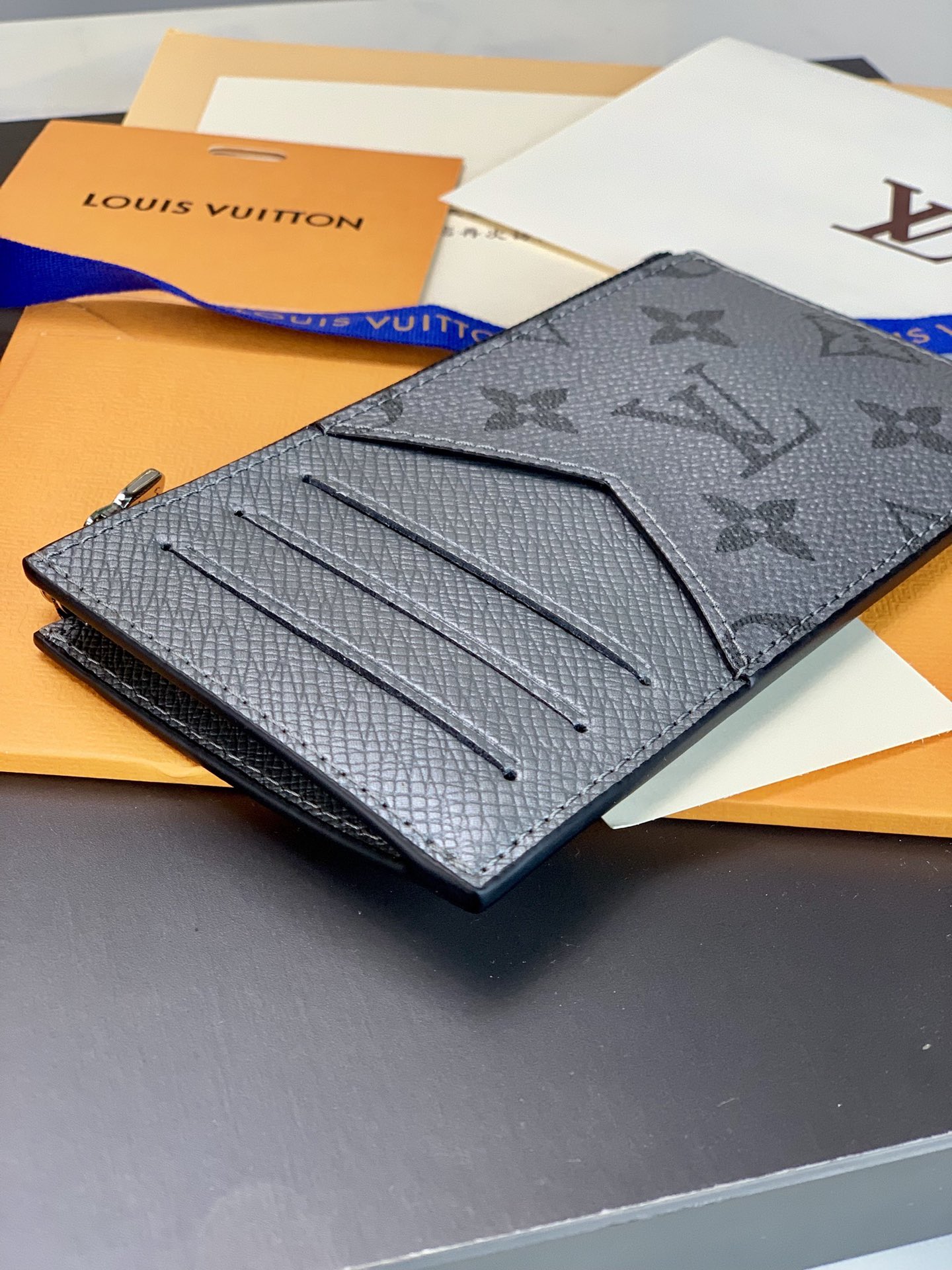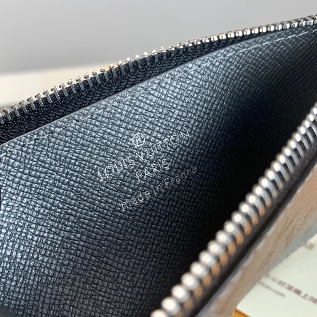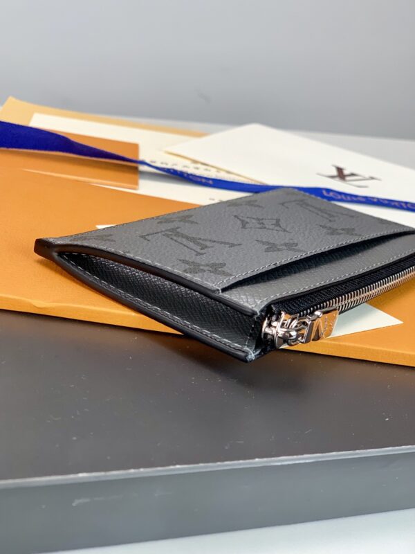 The Gray Coin Card Holder in dark dyed Taiga leather and Monogram canvas houses a credit card slot, zipped coin pocket and compartment for bills in a compact shape. 8 x 14.5 x 1 cm.