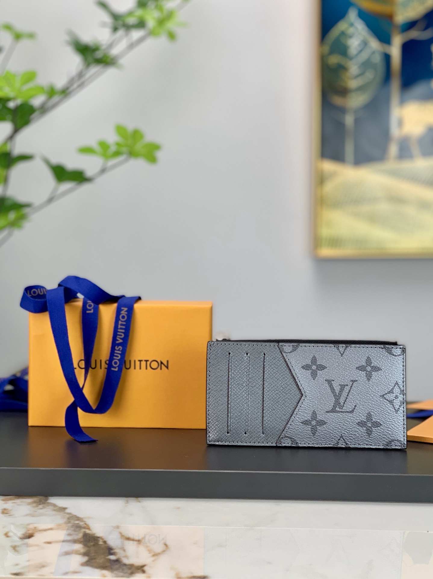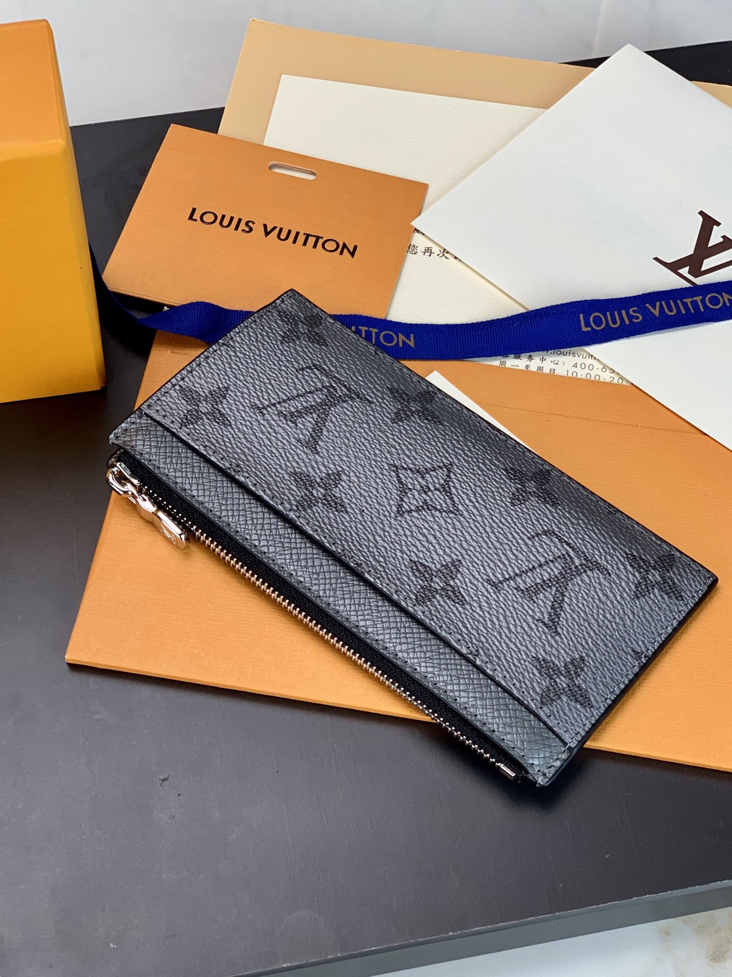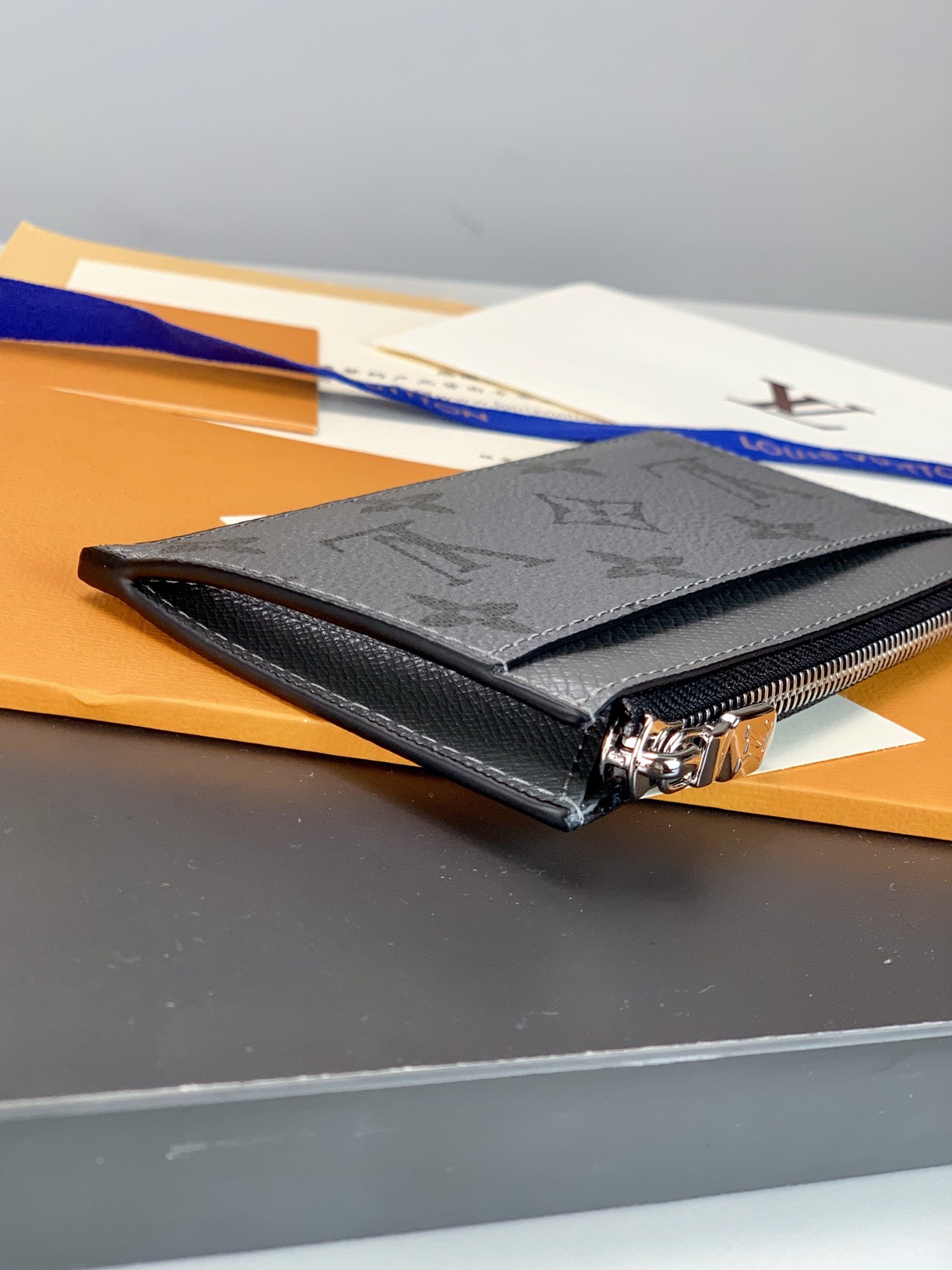 The Gray Coin Card Holder in dark dyed Taiga leather and Monogram canvas houses a credit card slot, zipped coin pocket and compartment for bills in a compact shape. 8 x 14.5 x 1 cm.