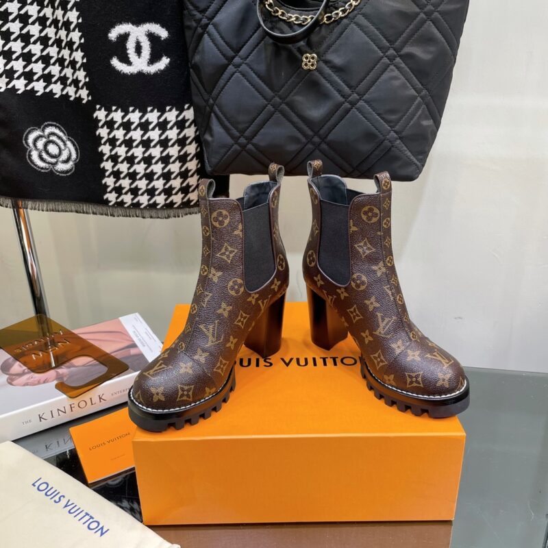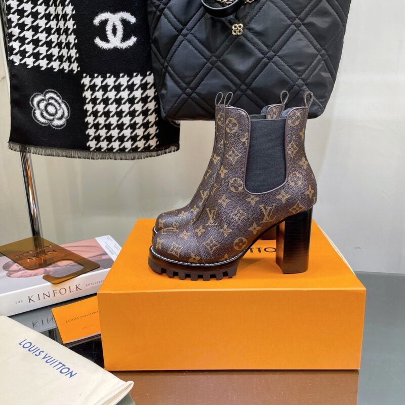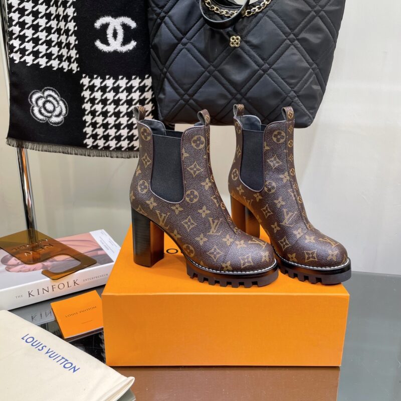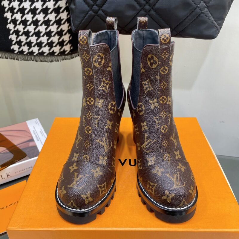 Louis Vuitton brand autumn and winter latest high-heeled boots classic ———————————————— High version, ultra-genuine type, super atmospheric on the upper foot, extraordinary temperament. Imported cowhide on the upper. Original hardware decoration on the inside. Outsole: imported genuine leather outsole plus teeth rubber combination and genuine leather welt. Heel height: 9cm; Water platform: 2.5cm Extremely adjustable last, super stable Size: 35-39 (40 41 customized)