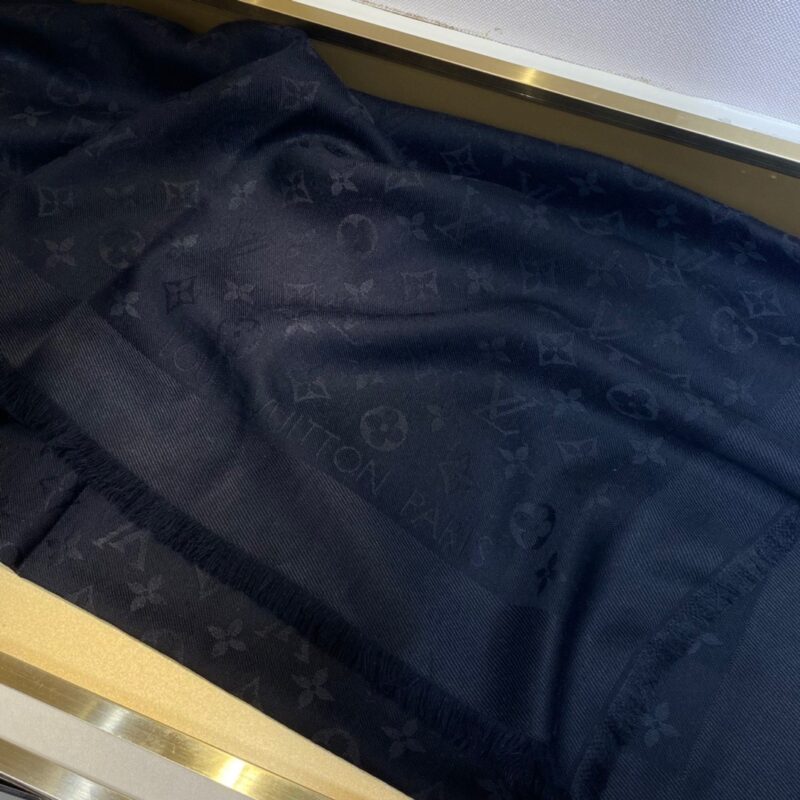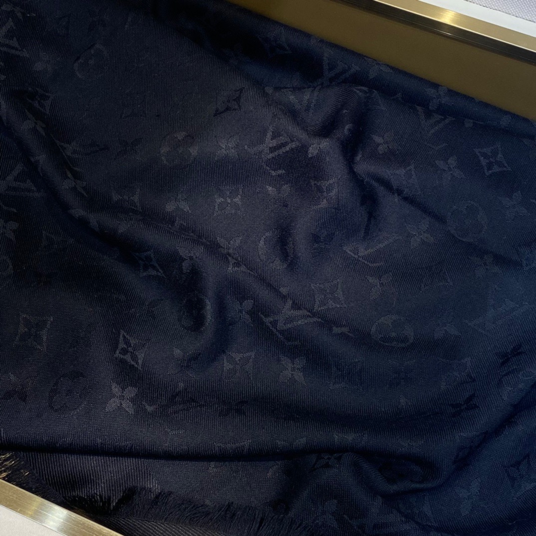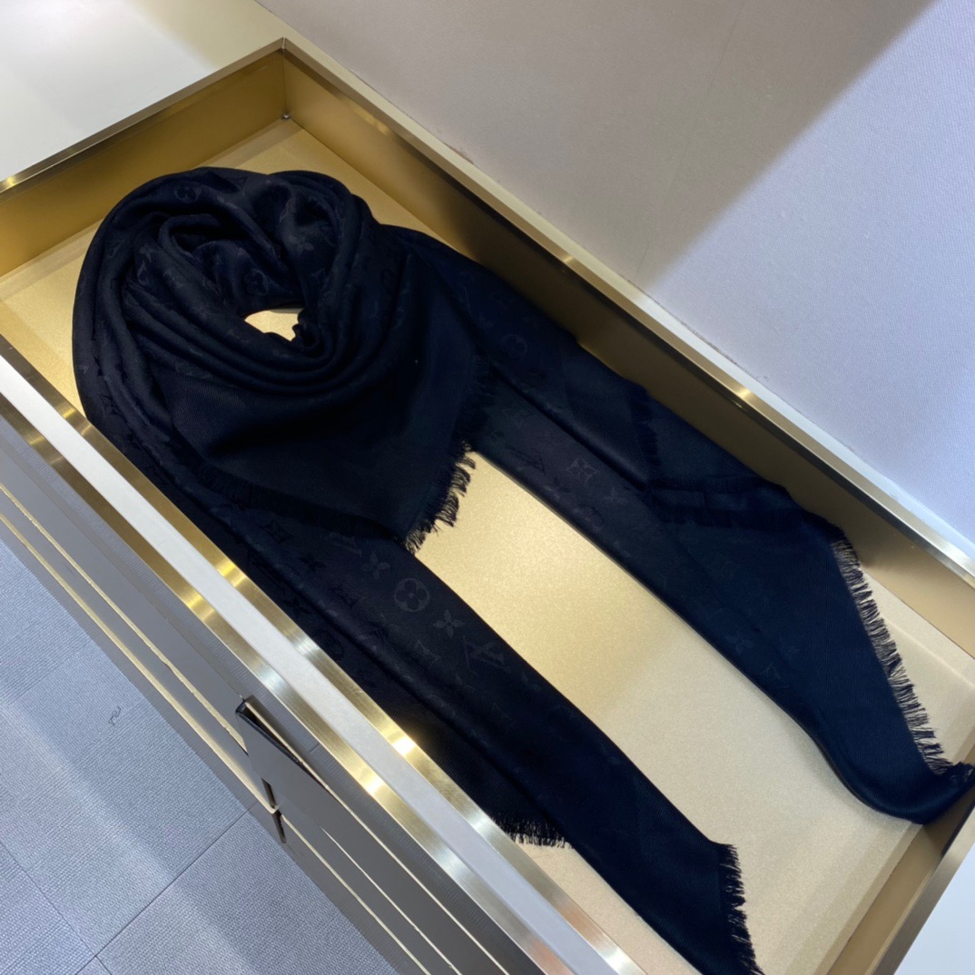 Louis Vuitton jacquard letter haze black. 140*140cm. 60% silk 40% woolFeaturing the iconic Monogram pattern, the Denim Monogram Shawl is given a seasonal update in two fresh feminine shades. Made from a wool and silk blend, both yarns are dyed to accentuate the contrasting jacquard. Effortlessly elegant, it can be displayed as a hijab or worn around the neck.