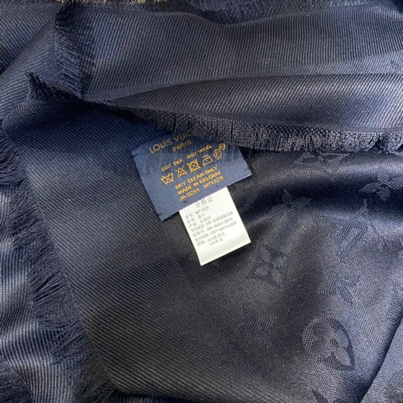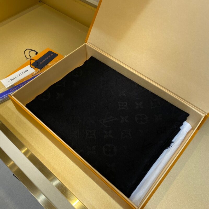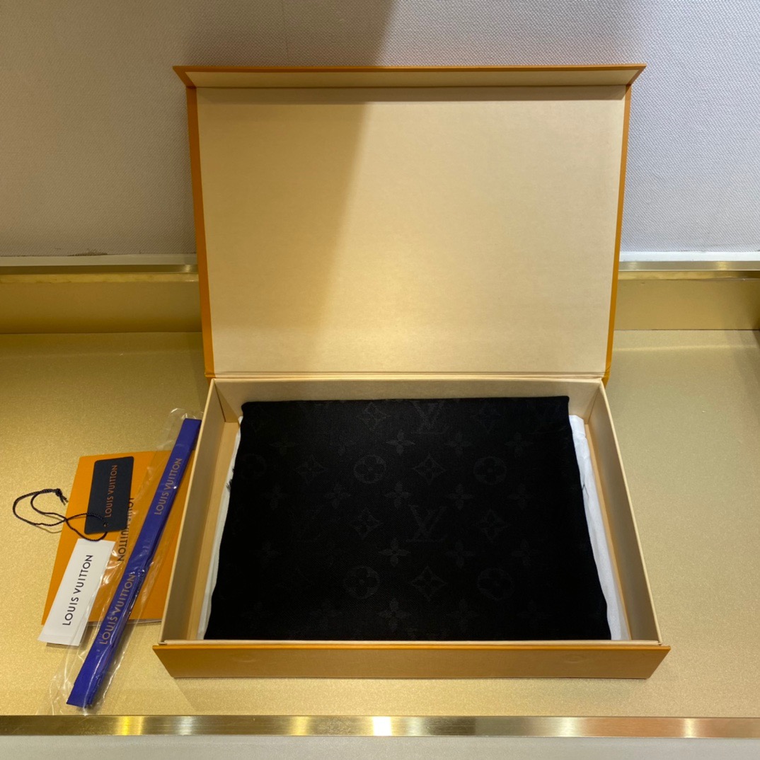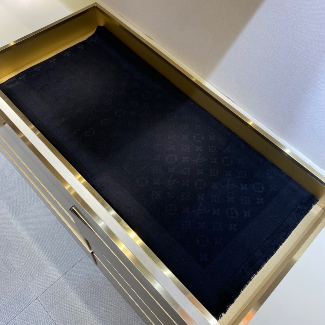 Louis Vuitton jacquard letter haze black. 140*140cm. 60% silk 40% woolFeaturing the iconic Monogram pattern, the Denim Monogram Shawl is given a seasonal update in two fresh feminine shades. Made from a wool and silk blend, both yarns are dyed to accentuate the contrasting jacquard. Effortlessly elegant, it can be displayed as a hijab or worn around the neck.