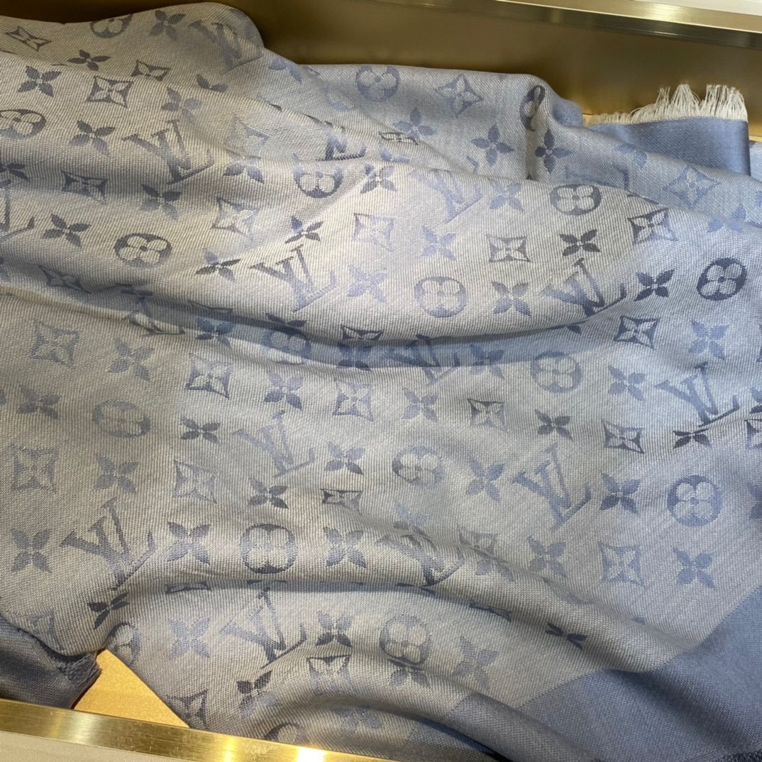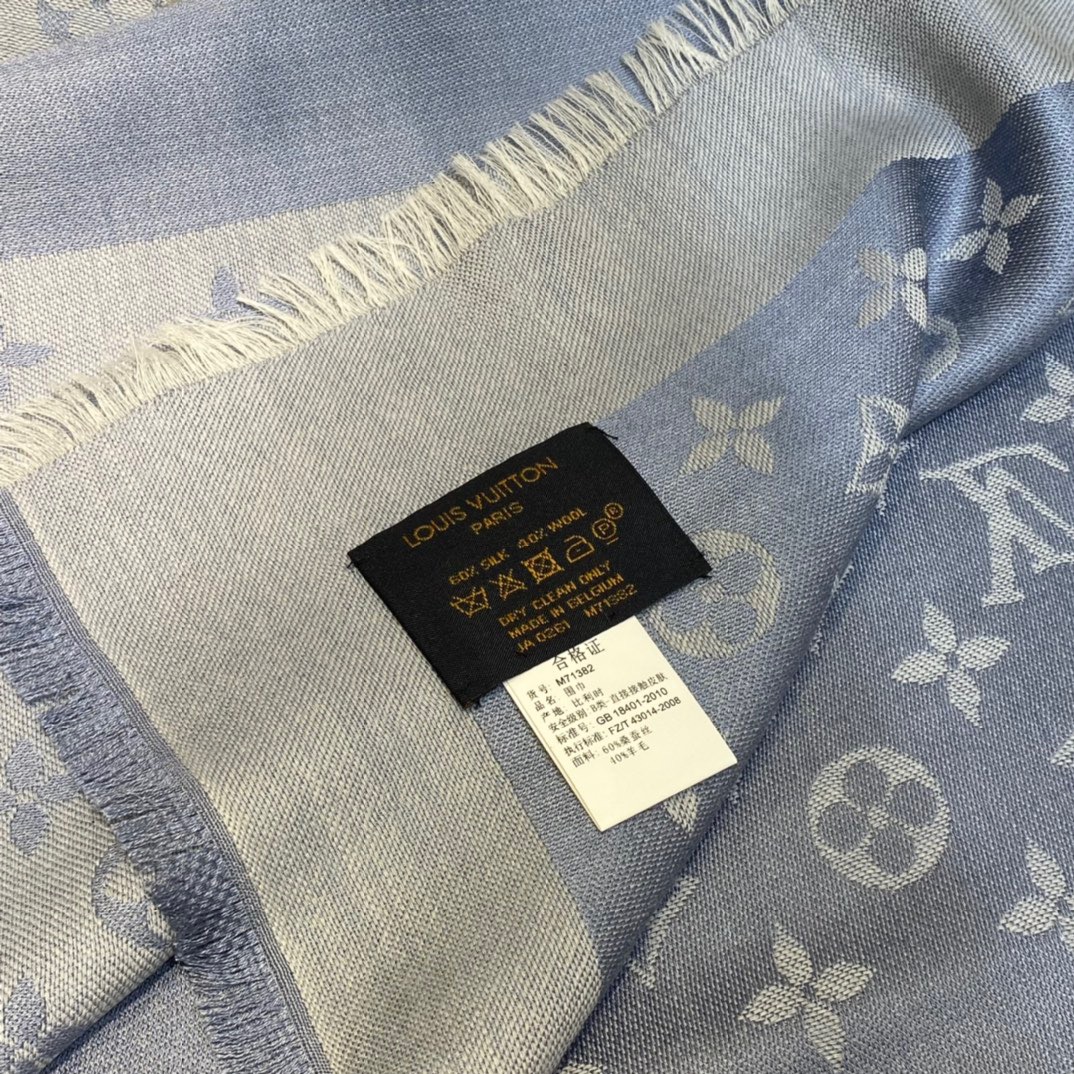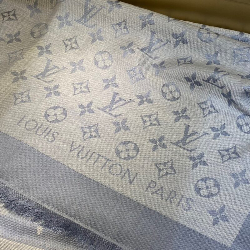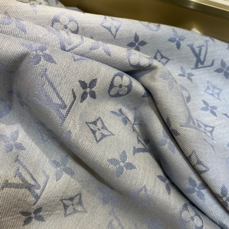 Louis Vuitton jacquard letter haze blue. 140*140cm. 60% silk 40% wool. Featuring the iconic Monogram pattern, the Denim Monogram Shawl is given a seasonal update in two fresh feminine shades. Made from a wool and silk blend, both yarns are dyed to accentuate the contrasting jacquard. Effortlessly elegant, it can be displayed as a hijab or worn around the neck.