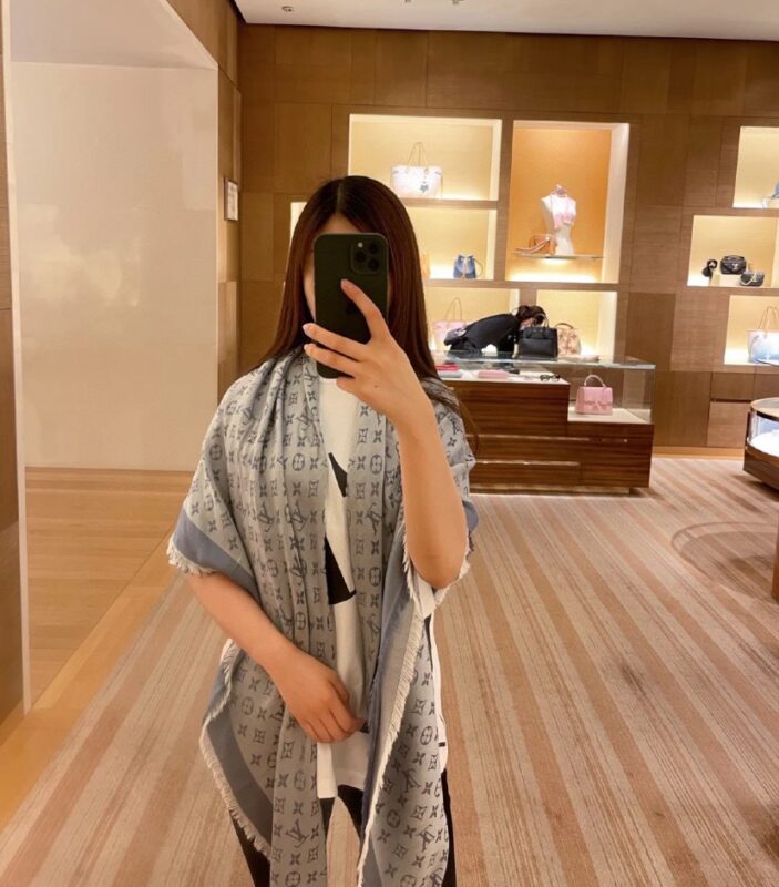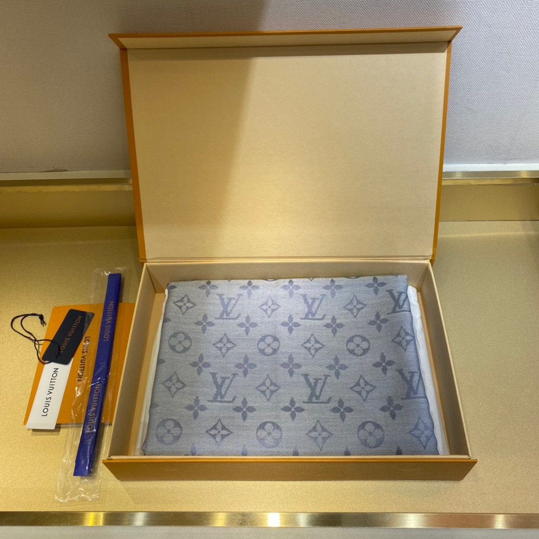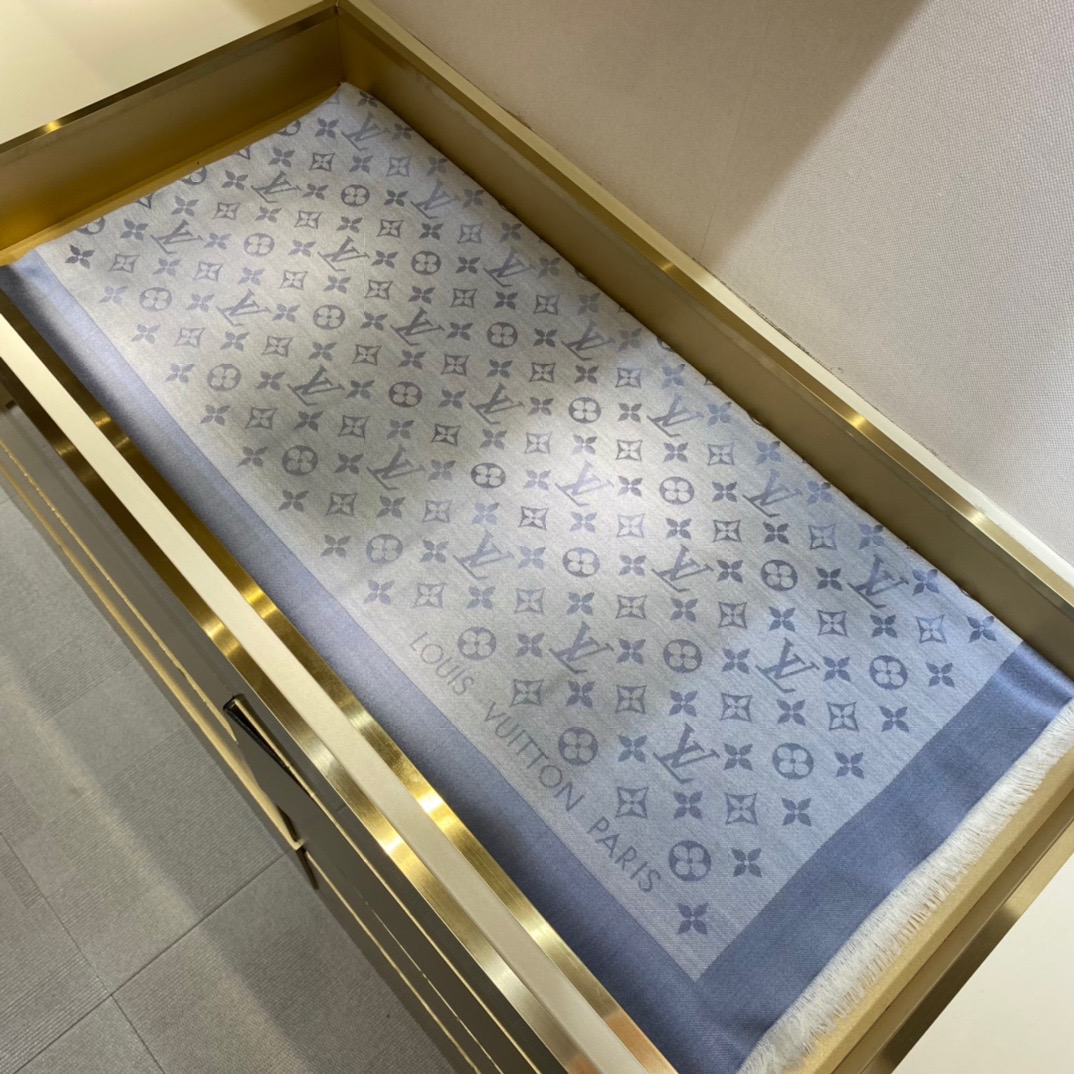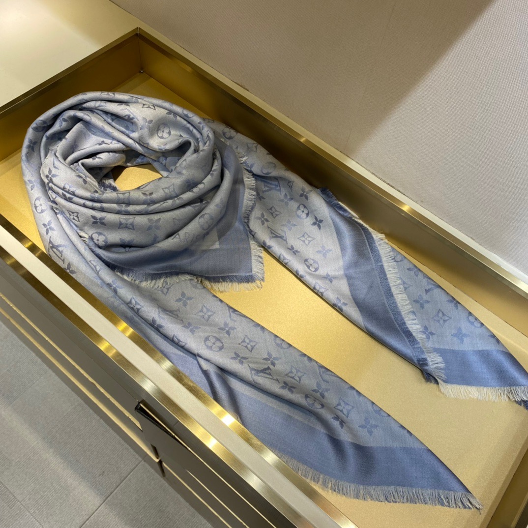 Louis Vuitton jacquard letter haze blue. 140*140cm. 60% silk 40% wool. Featuring the iconic Monogram pattern, the Denim Monogram Shawl is given a seasonal update in two fresh feminine shades. Made from a wool and silk blend, both yarns are dyed to accentuate the contrasting jacquard. Effortlessly elegant, it can be displayed as a hijab or worn around the neck.