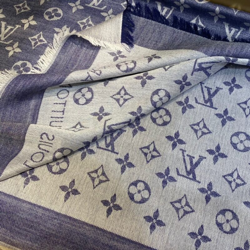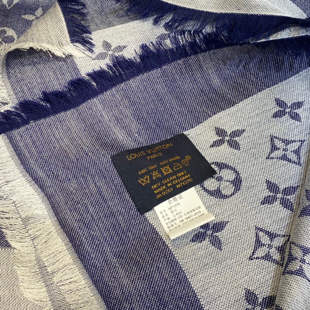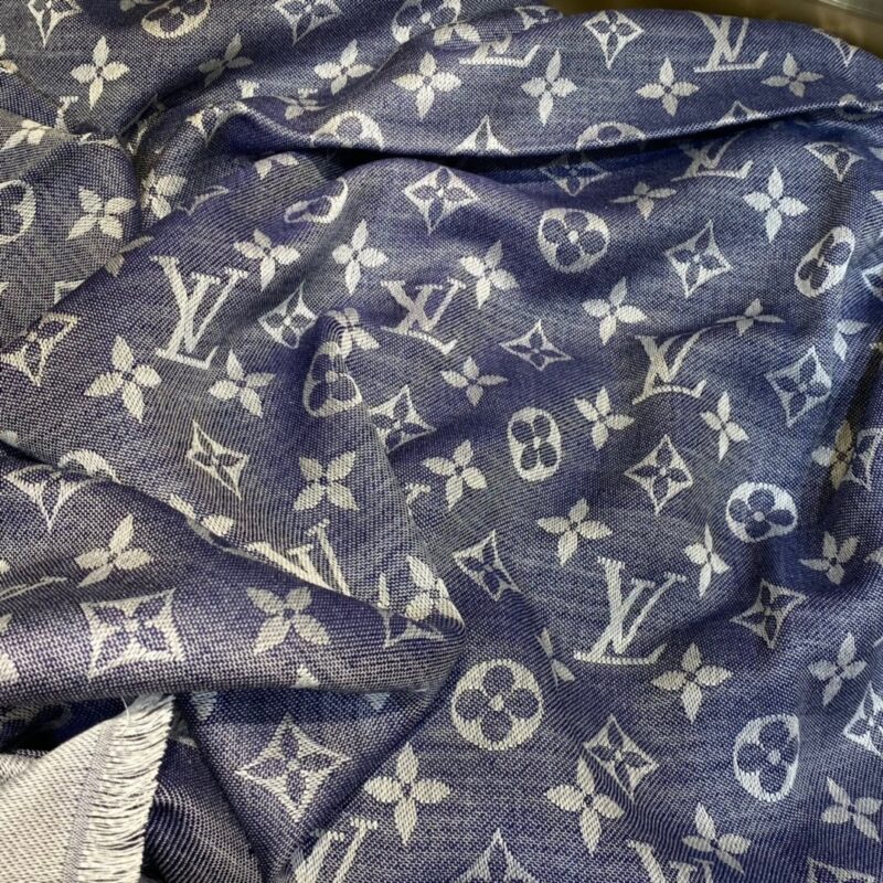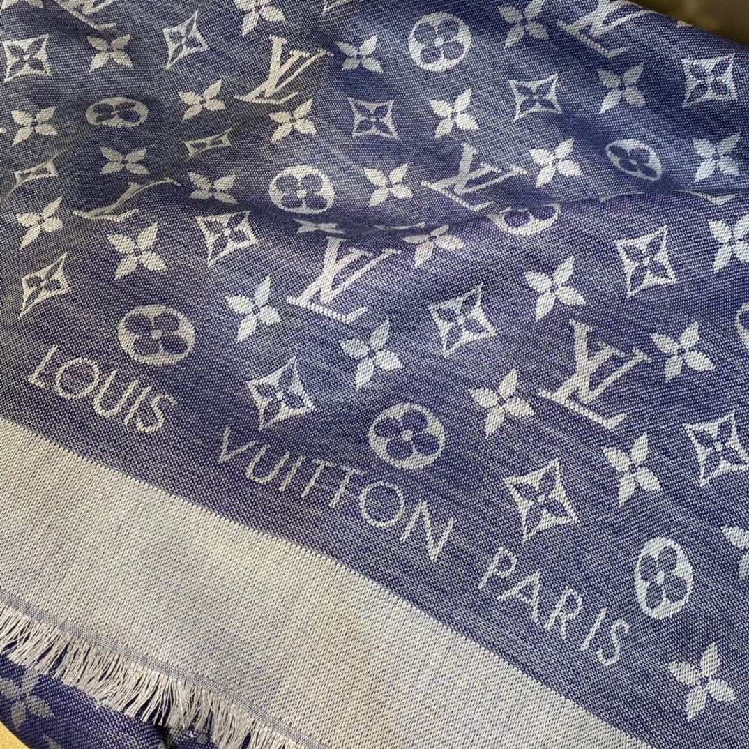 Louis Vuitton jacquard letter haze blue. 140*140cm. 60% silk 40% wool. Featuring the iconic Monogram pattern, the Denim Monogram Shawl is given a seasonal update in two fresh feminine shades. Made from a wool and silk blend, both yarns are dyed to accentuate the contrasting jacquard. Effortlessly elegant, it can be displayed as a hijab or worn around the neck.