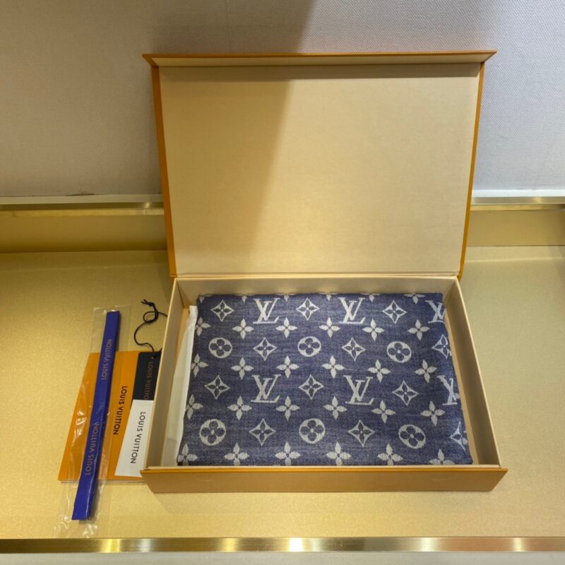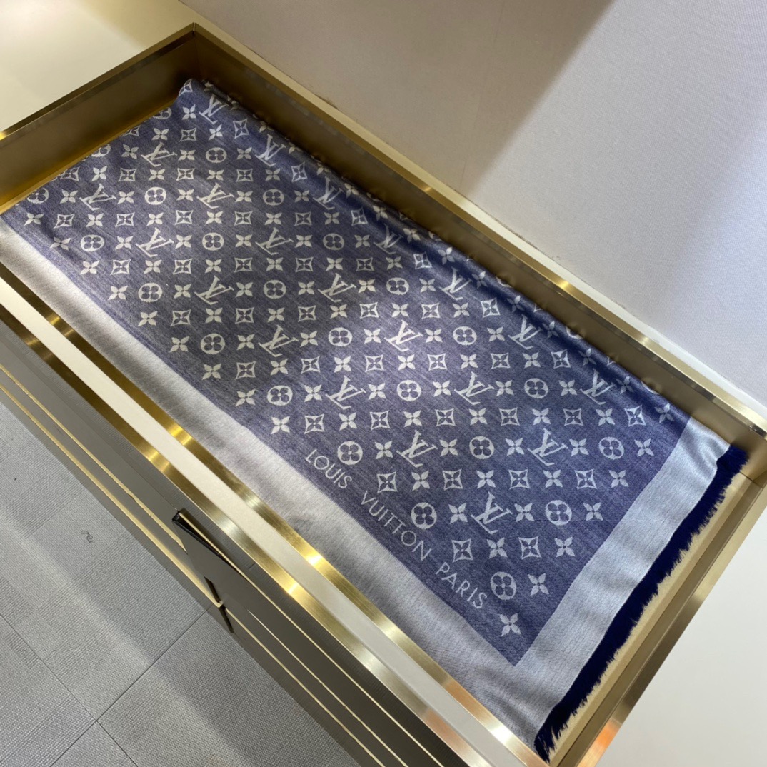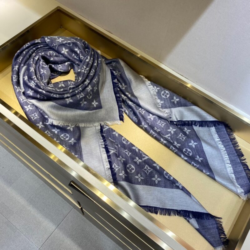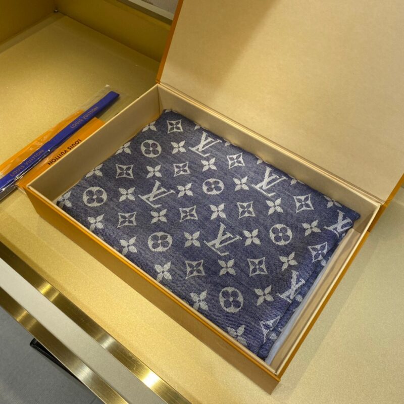 Louis Vuitton jacquard letter haze blue. 140*140cm. 60% silk 40% wool. Featuring the iconic Monogram pattern, the Denim Monogram Shawl is given a seasonal update in two fresh feminine shades. Made from a wool and silk blend, both yarns are dyed to accentuate the contrasting jacquard. Effortlessly elegant, it can be displayed as a hijab or worn around the neck.